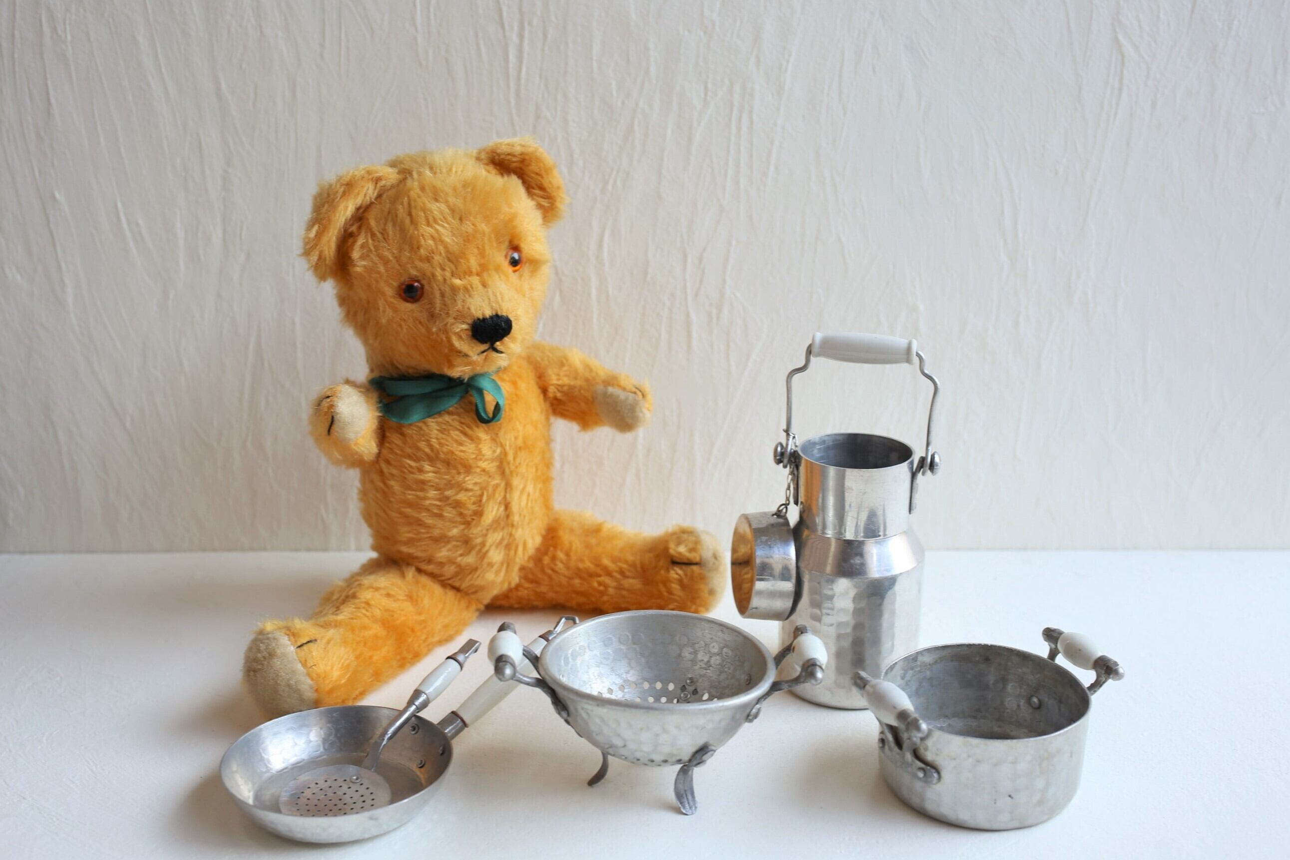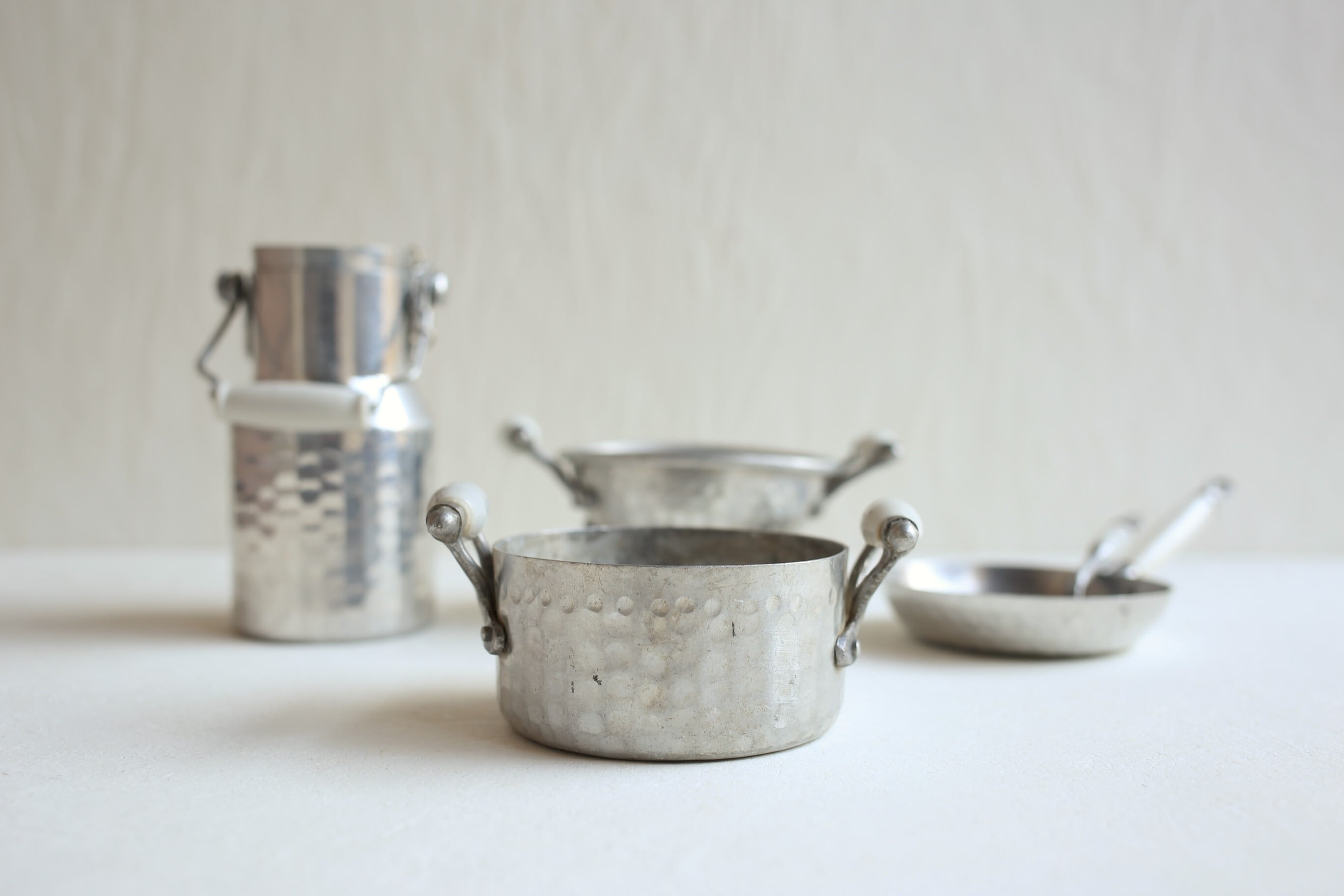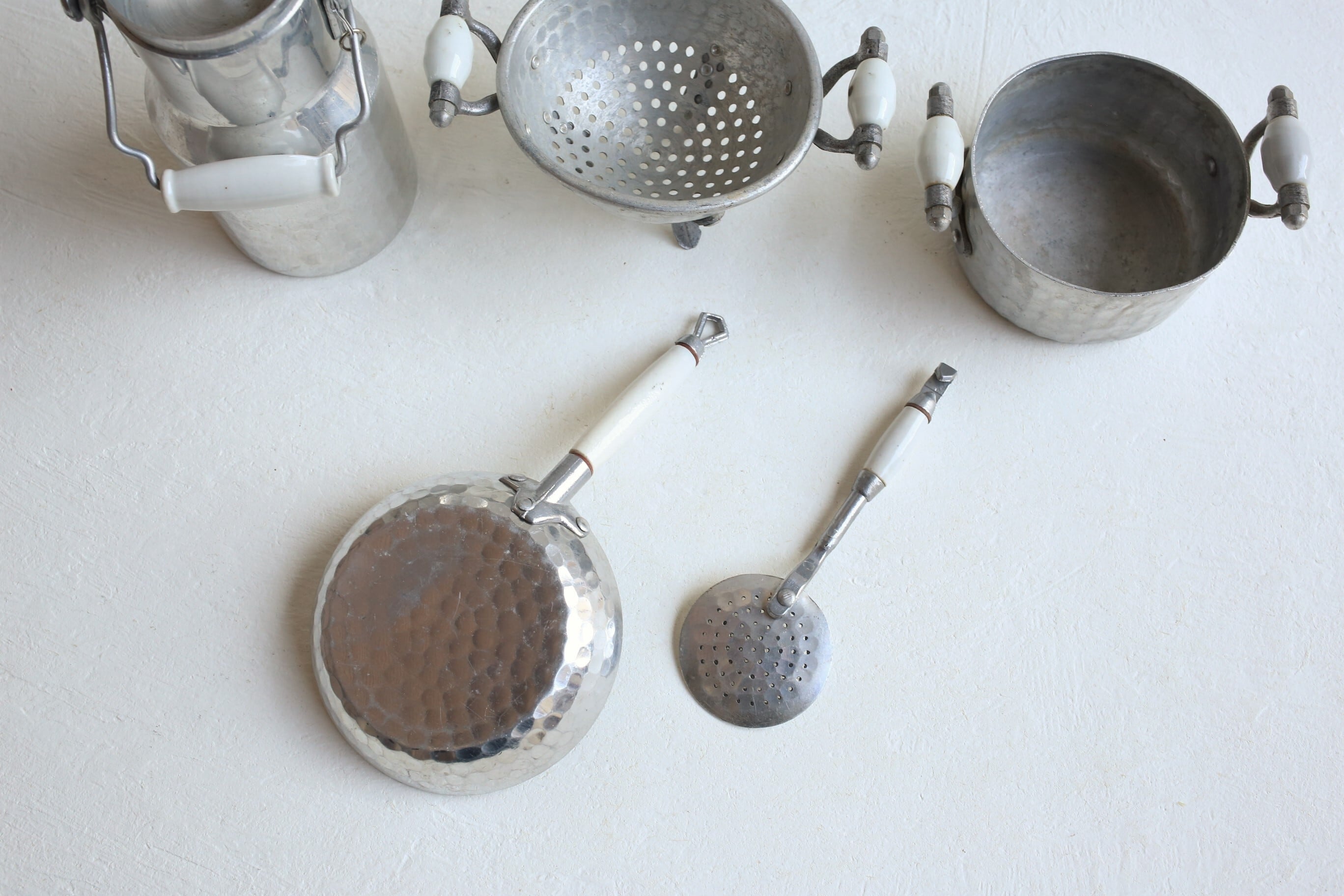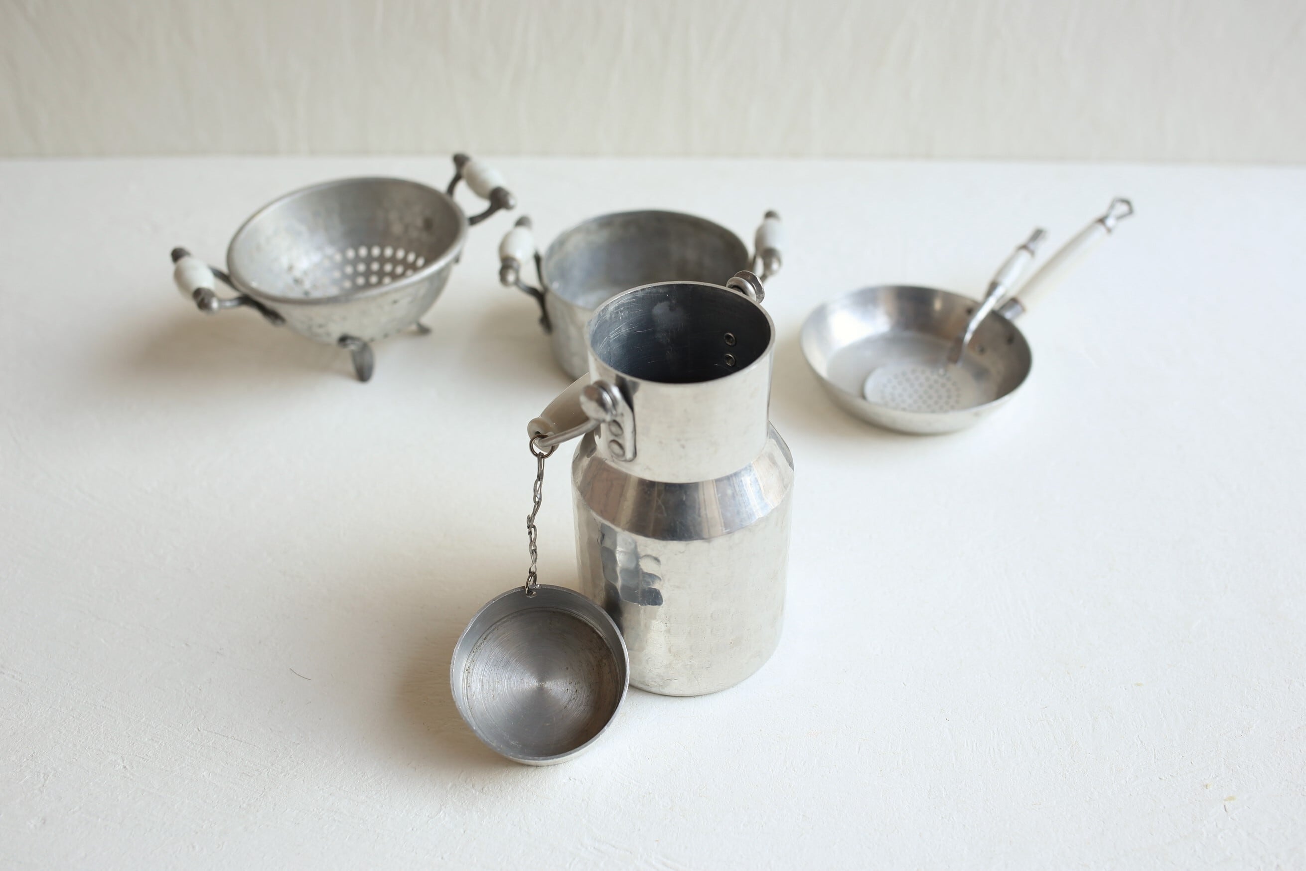 フランス アンティーク ヴィンテージ アルミ×陶器 ドール Dinette ままごと用 キッチン雑貨5点セット N-03373