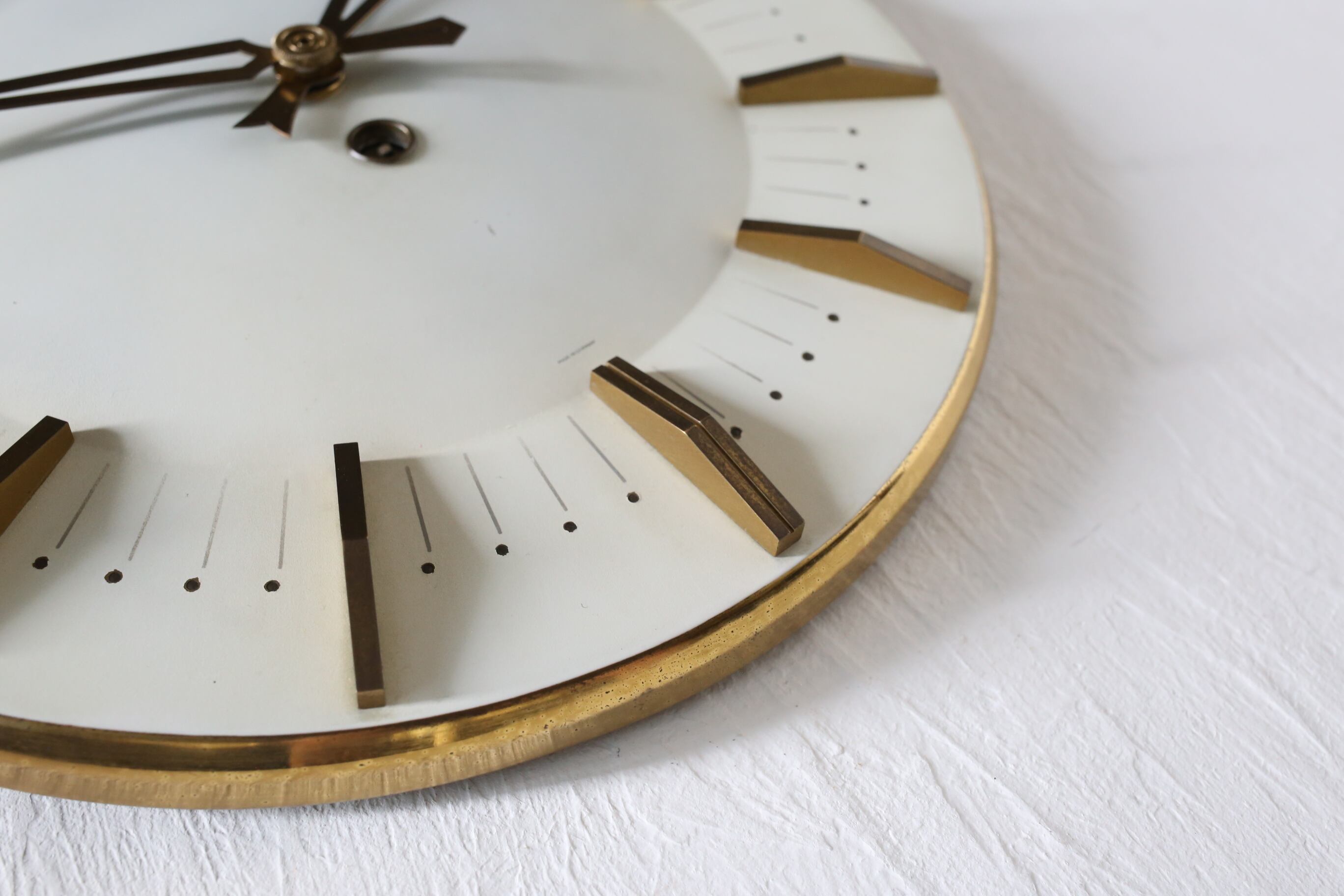 アイボリー×ゴールドのシンプルな薄型のデザインですが、趣きのある針やメモリのデザインがインテリアに調和しながらも存在感を漂わせる素敵な時計です。