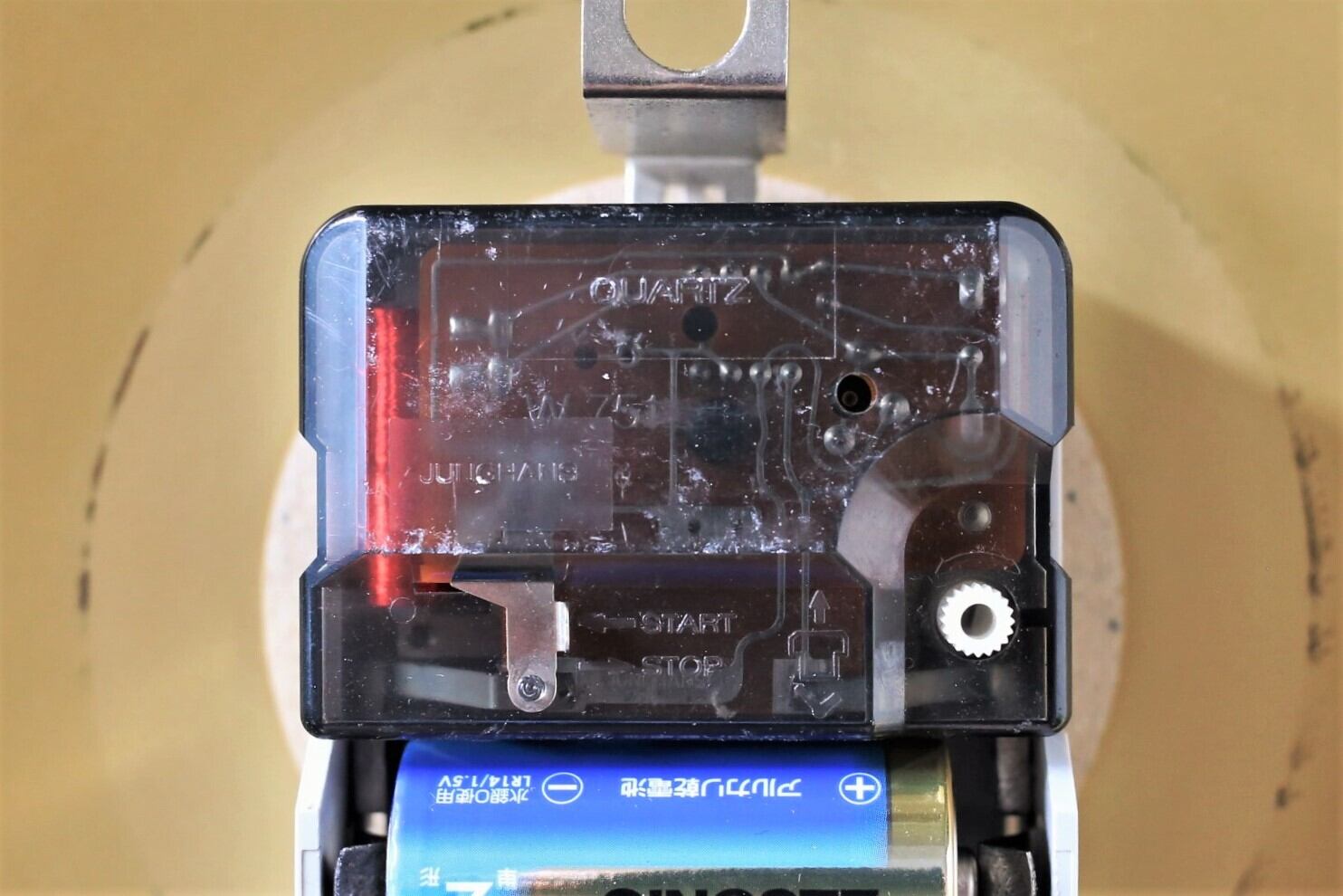 真ん中左側に「Start」「Stop」と書かれた左右に動く小さなレバーがありますが、電池を入れたままでも「Stop」にすると止まります。