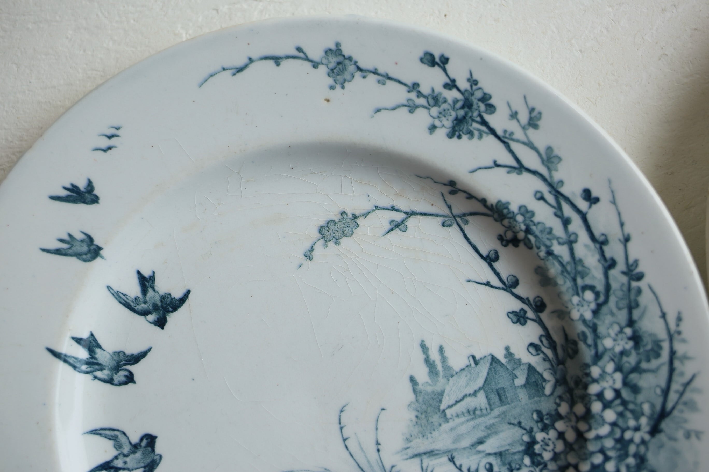 青味がかった釉薬がかけられた陶器に藍色で描かれた鳥と田園の風景が美しい一枚です。