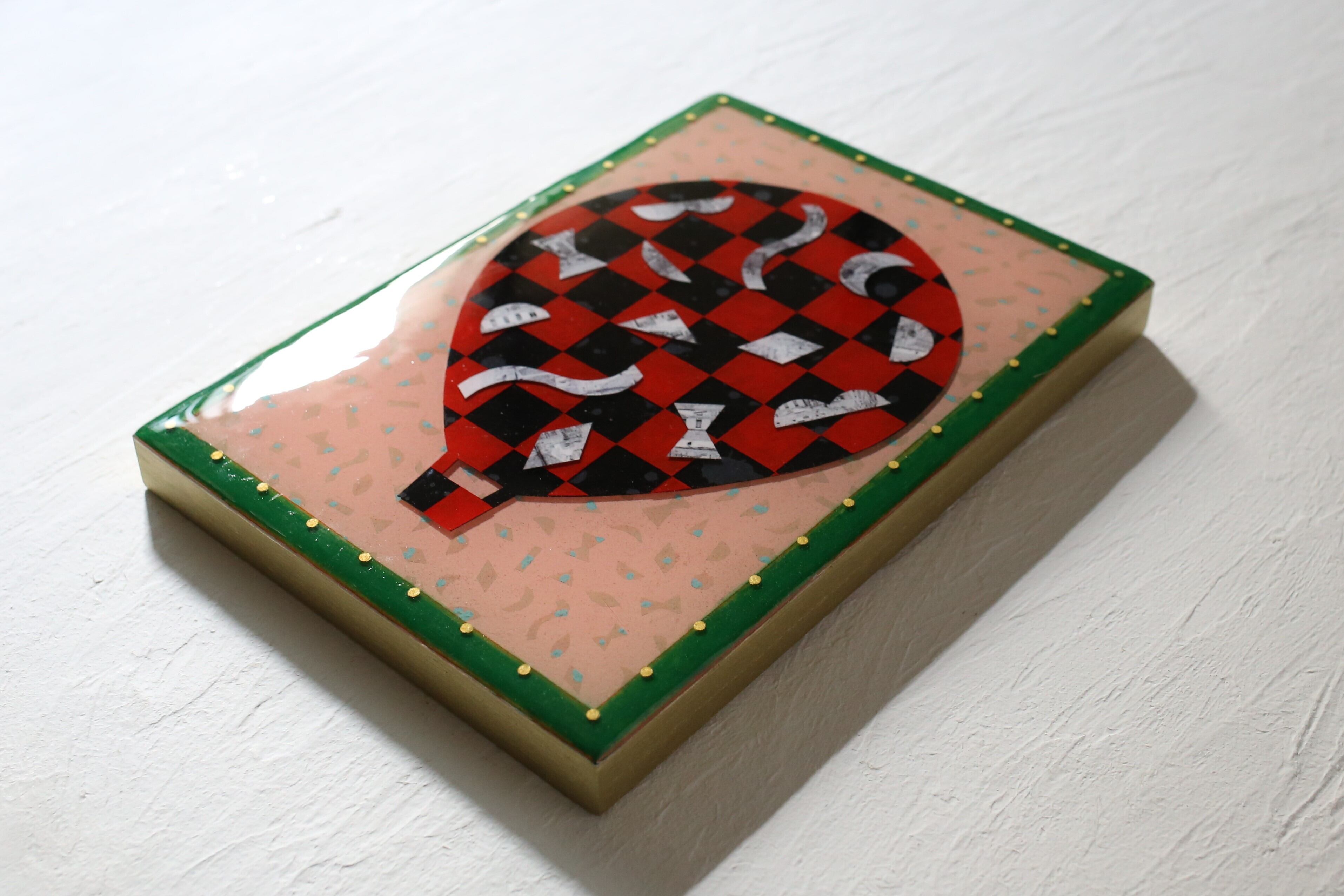 水彩紙等でコラージュを制作し、エポキシレジンでコーティングしました。