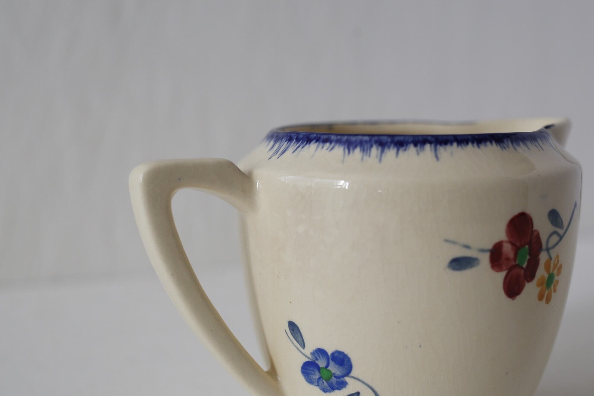 見かけることの少ないミルクポットですが、丸みのある小ぶりのフォルムにバランスよく描かれた花模様と縁取りのブルーが映えた可愛らしく温かみのあるポットです。