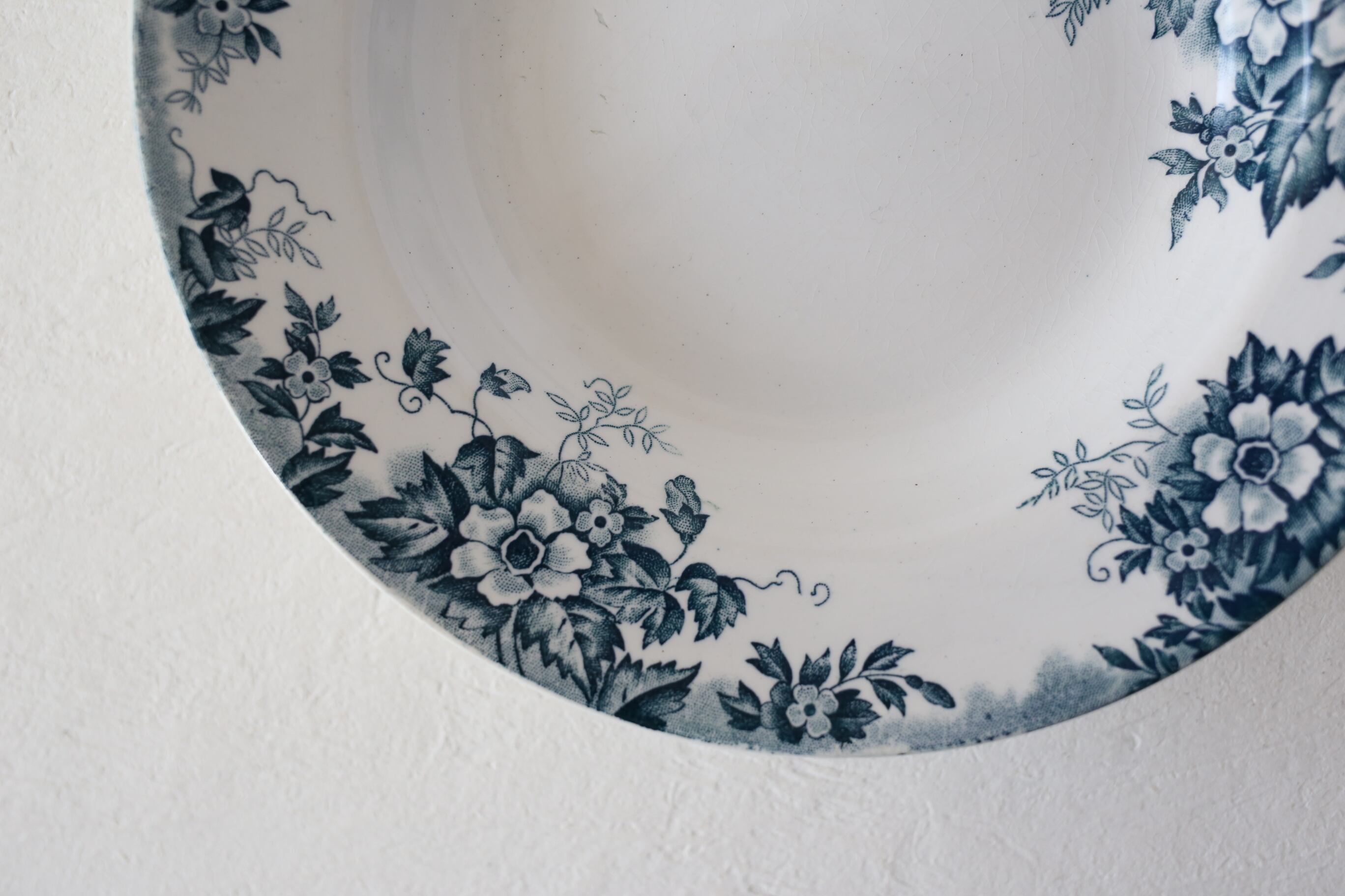 アイボリーの陶器に深い青緑色の濃淡で勢いよく描かれた花模様や釉薬の艶、貫入もとても良い雰囲気です。