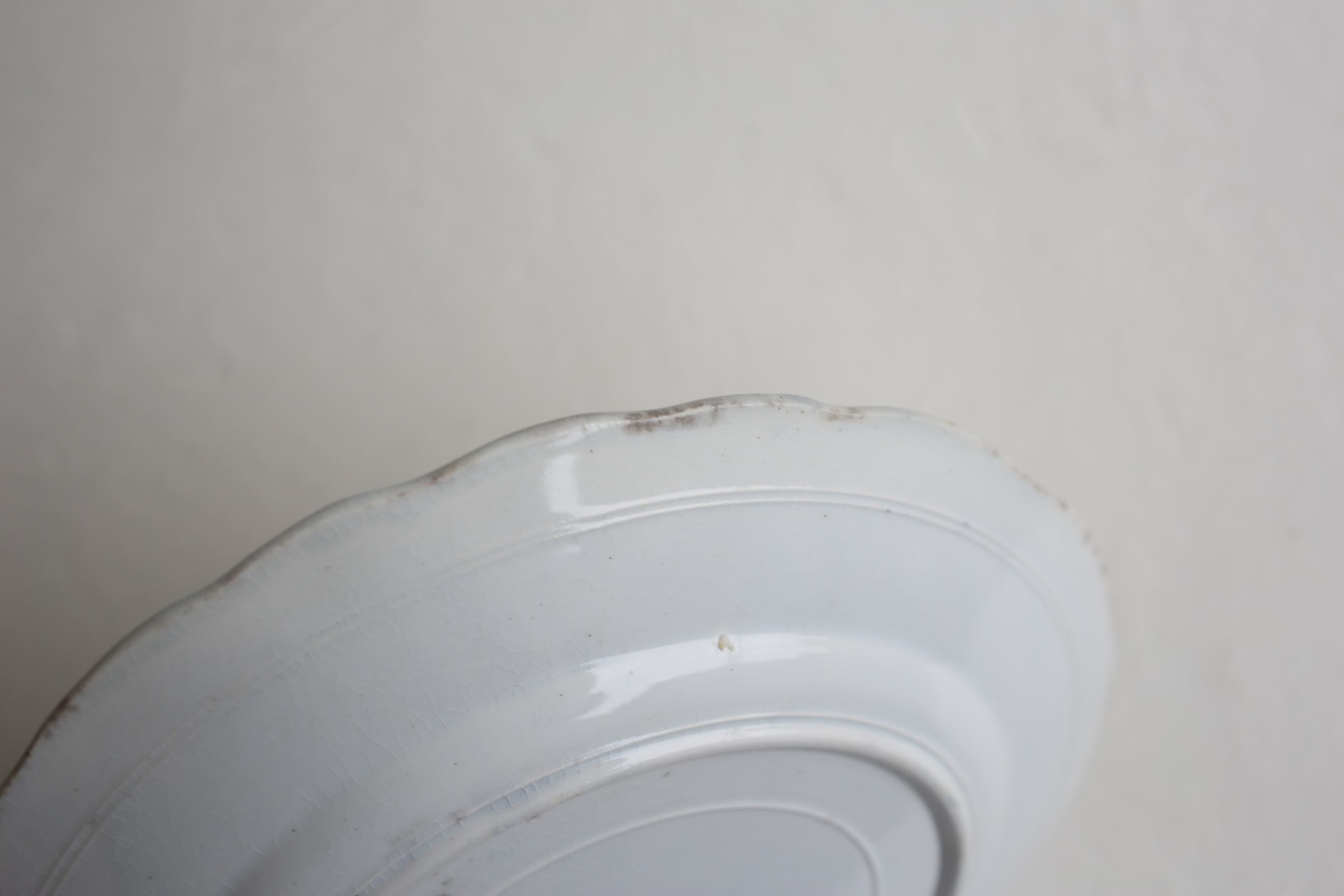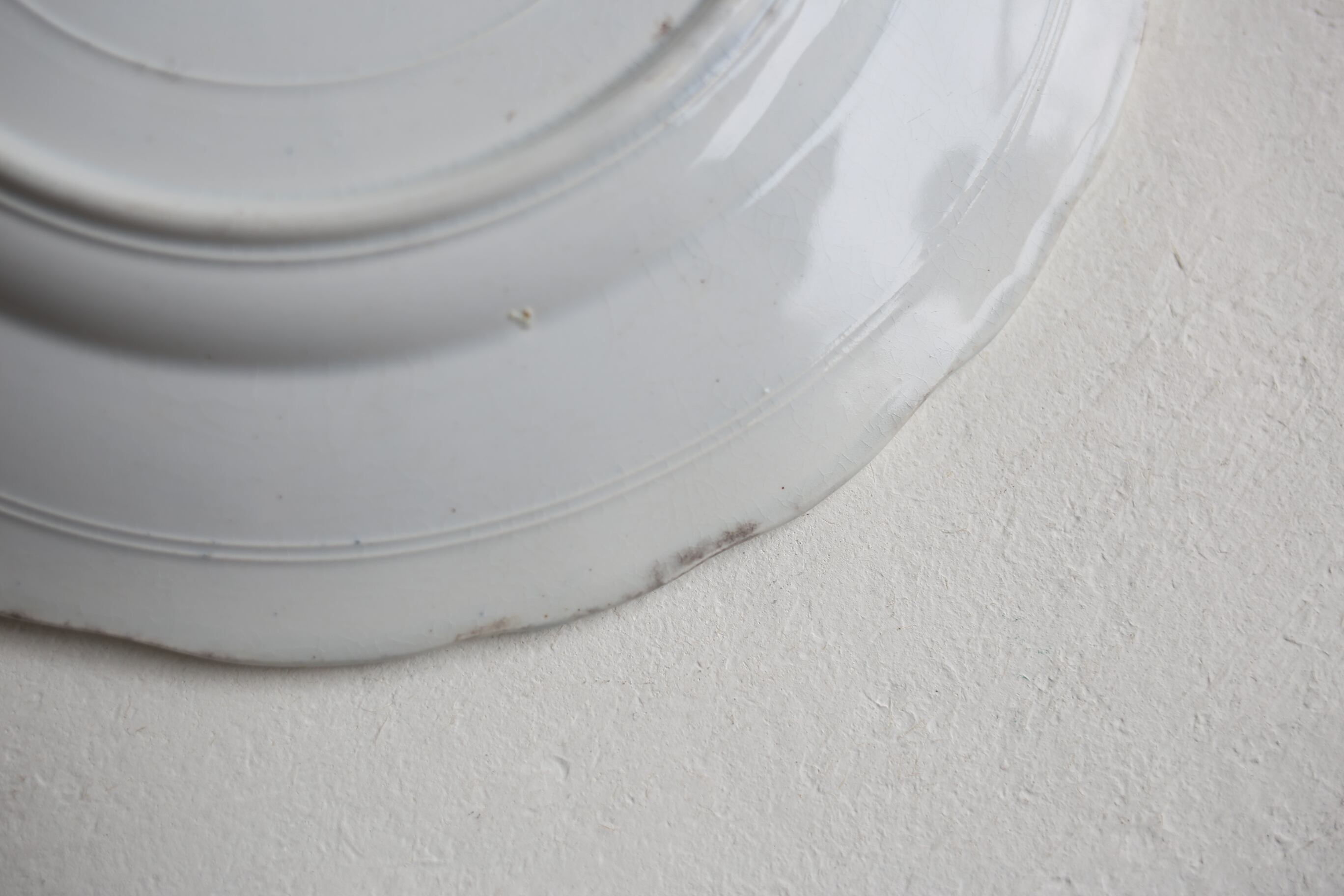 カトラリー跡やスレ、表面の点々と入ったシミと縁や高台付近に入ったシミなどはありますが、全体的には目立つダメージもなく良い状態です。
