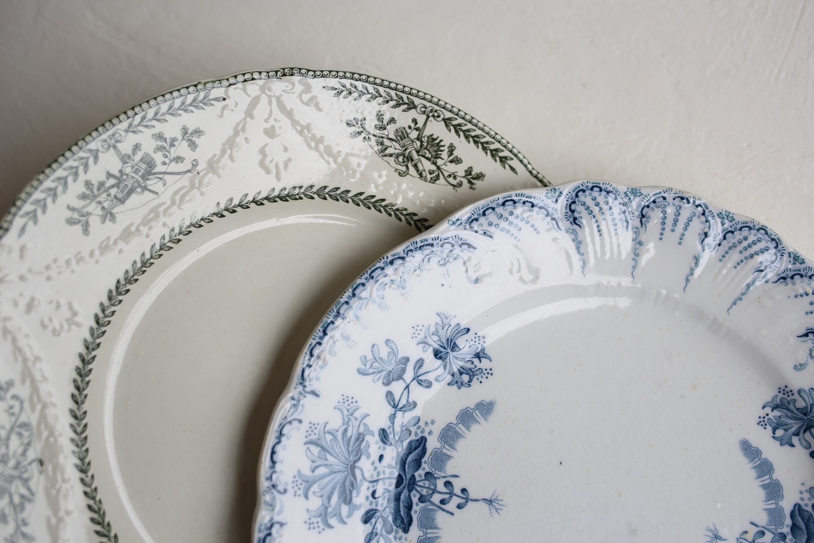 なかなか見かけないシリーズですが、アイボリーの陶器にグリーンの絵柄、そして何と言ってもリムのエンボスのガーランド模様が美しいプレートです。