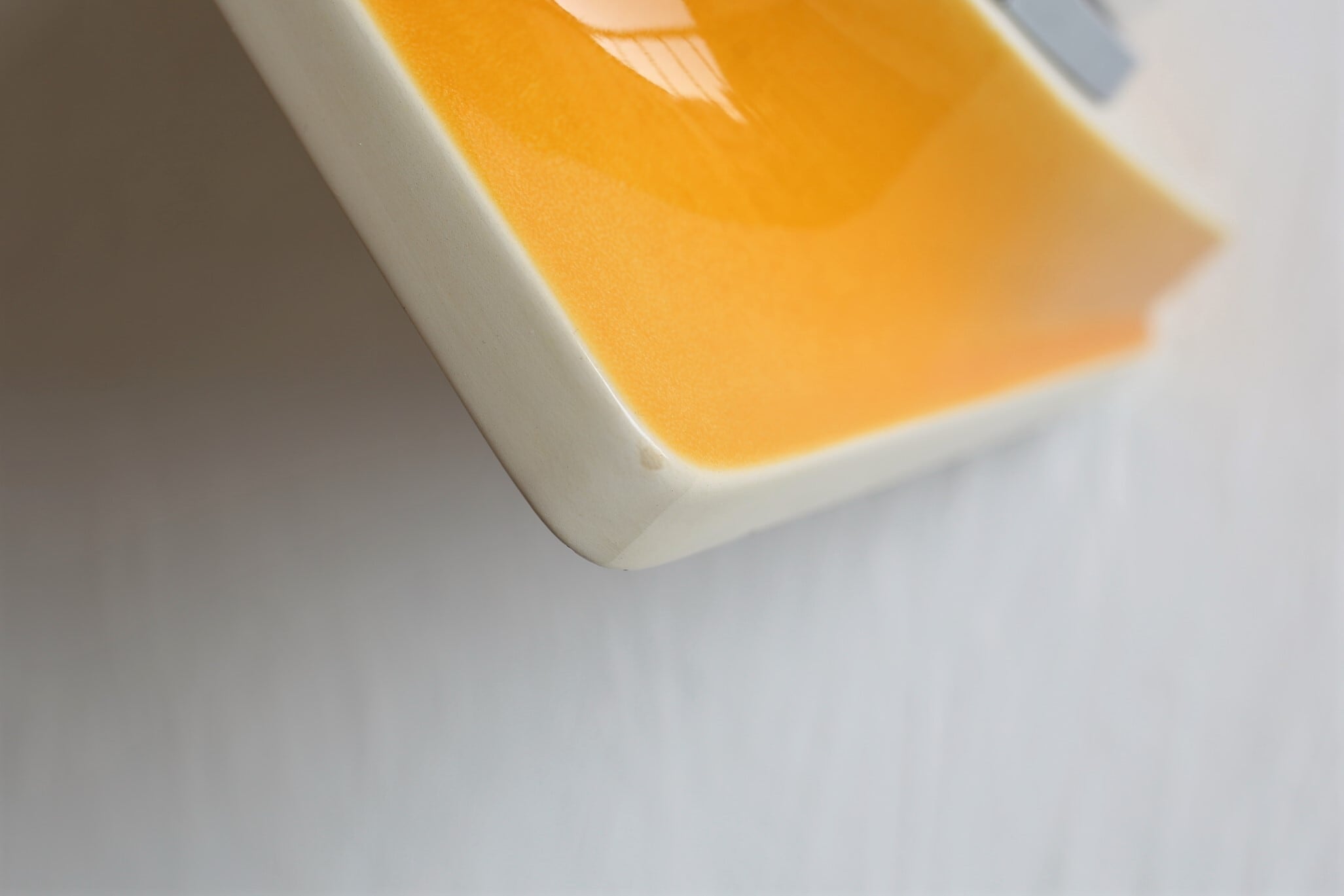 陶器の縁に微細なチップが数点と左上部の奥側に5mm程のカケがありますが、壁に掛けるとほとんどわからない程度のものです。