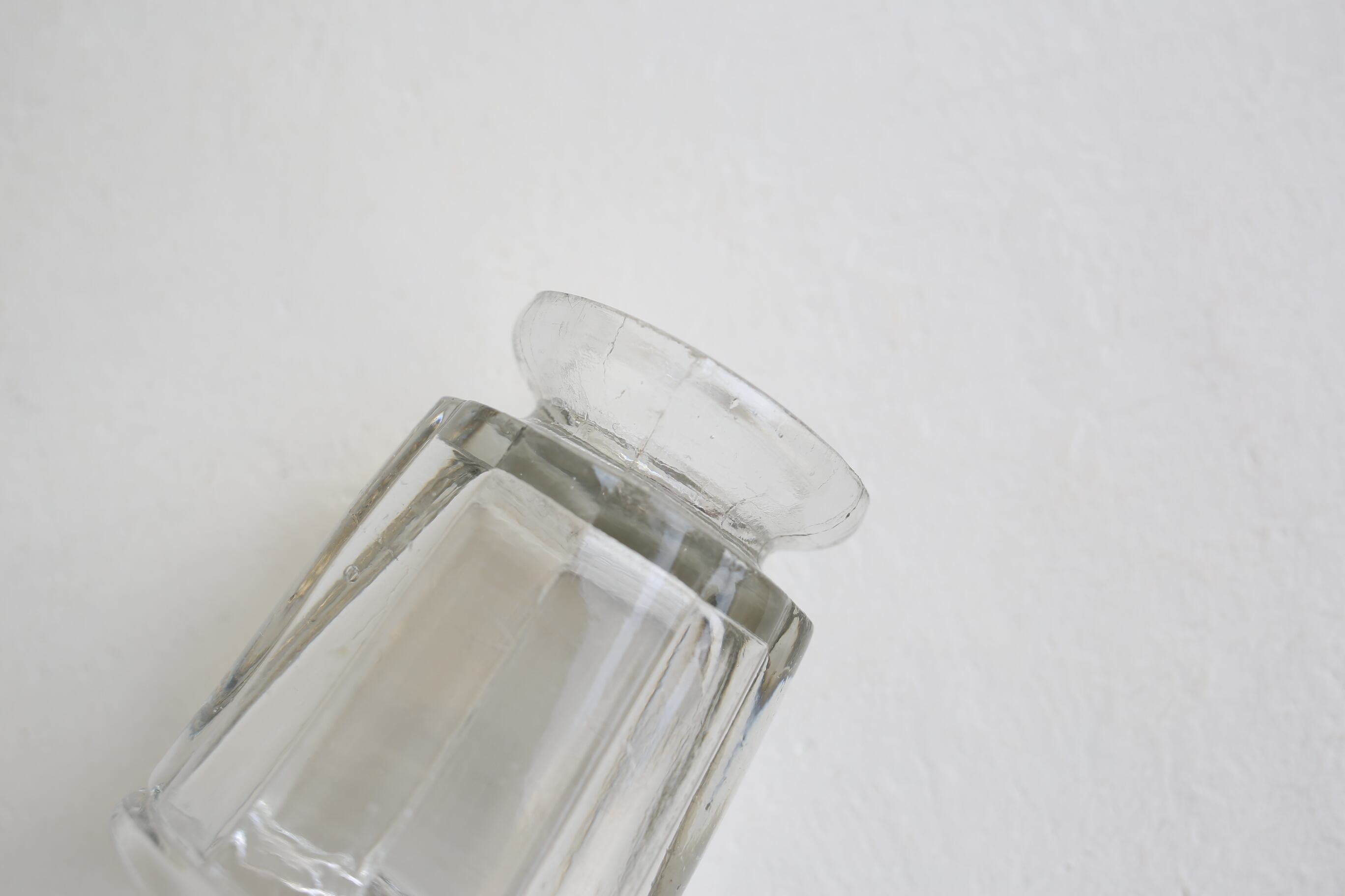 擦れや微細なカケやザラツキとありますが(主に高台部分)、目立つダメージもなく古いガラスのジャム瓶としては良い状態です。