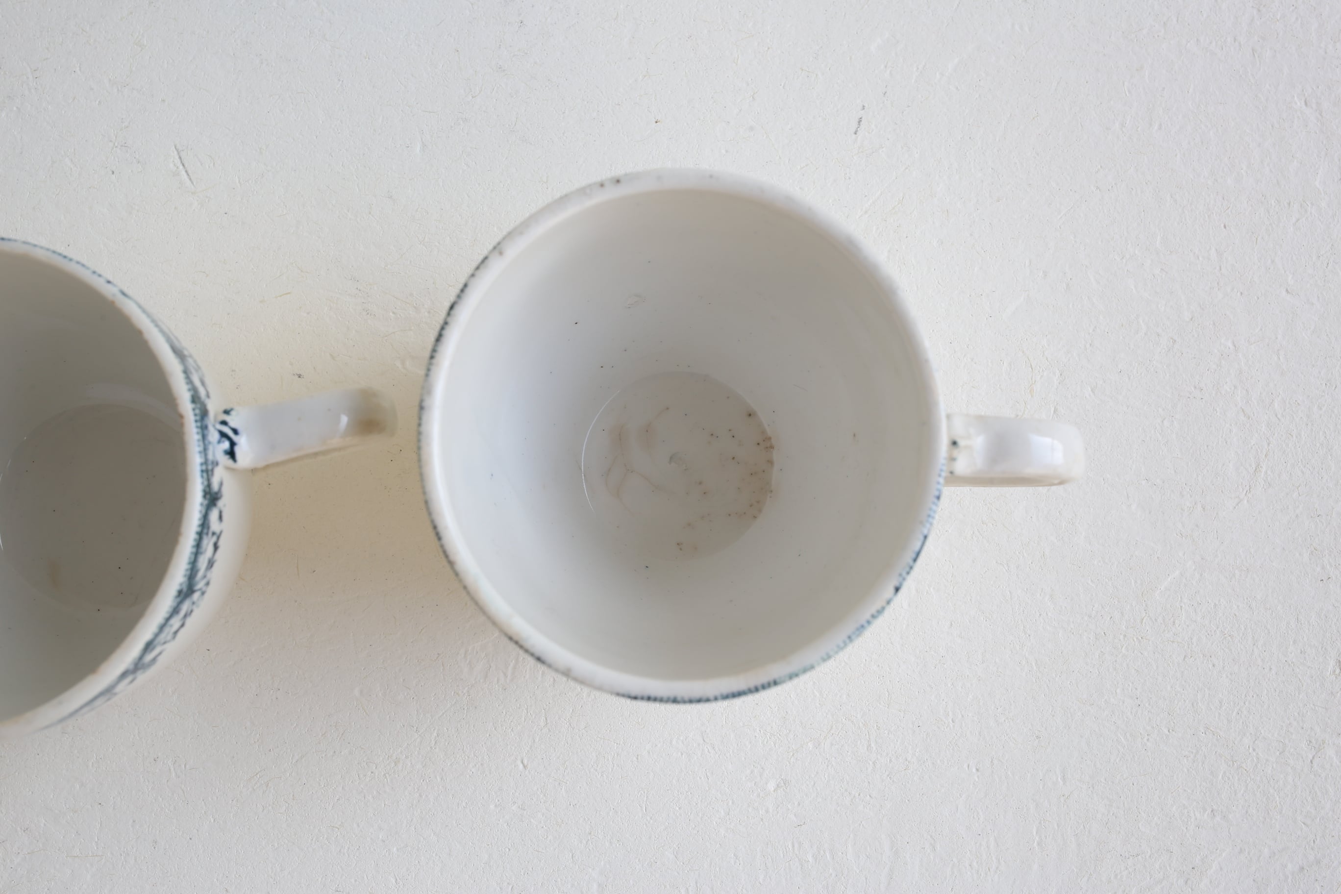 カップは1個は底にシミ、1個は縁に微細なチップとスレがやや目立ちますが、それ以外は目立つカケやヒビもなく良い状態です。
