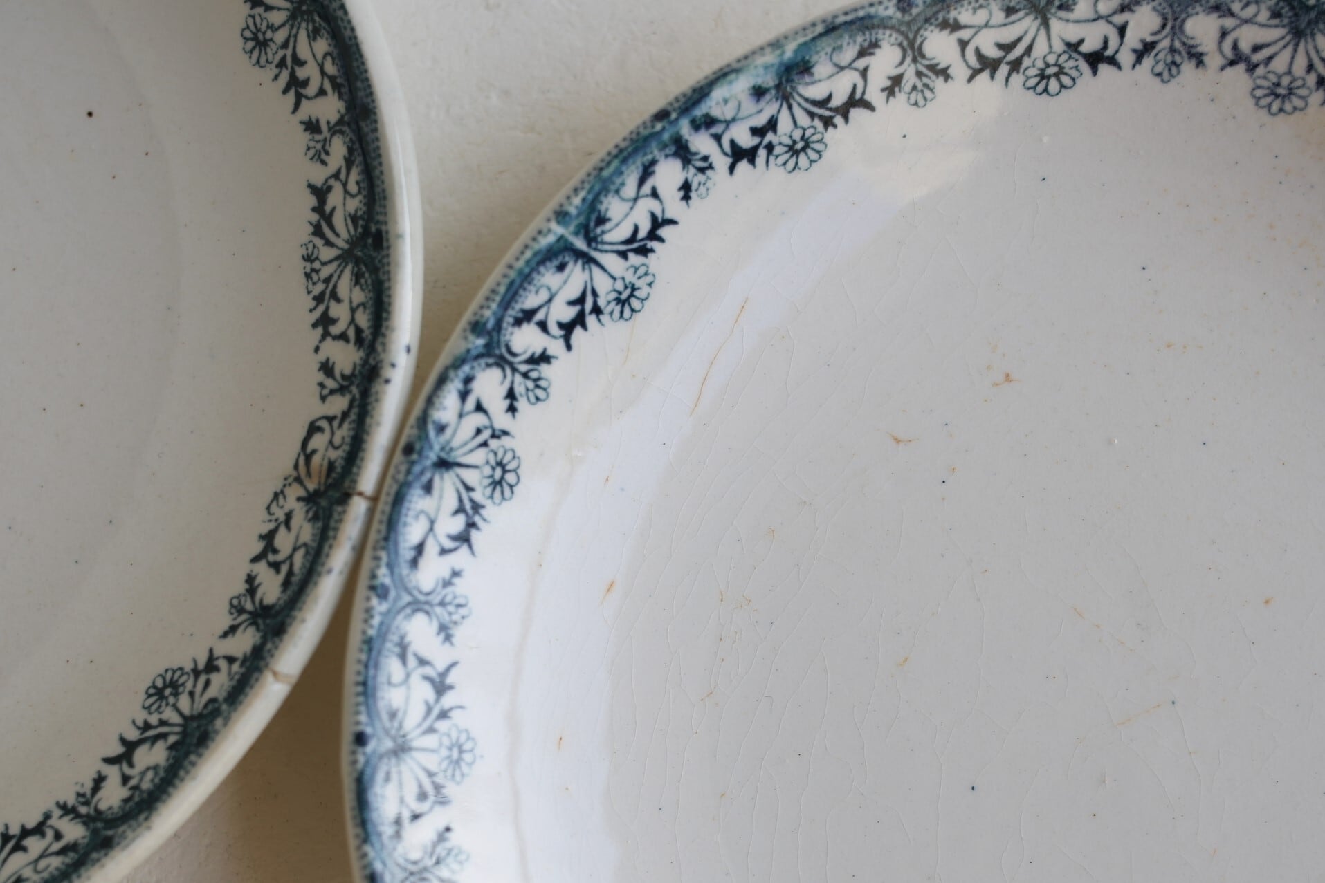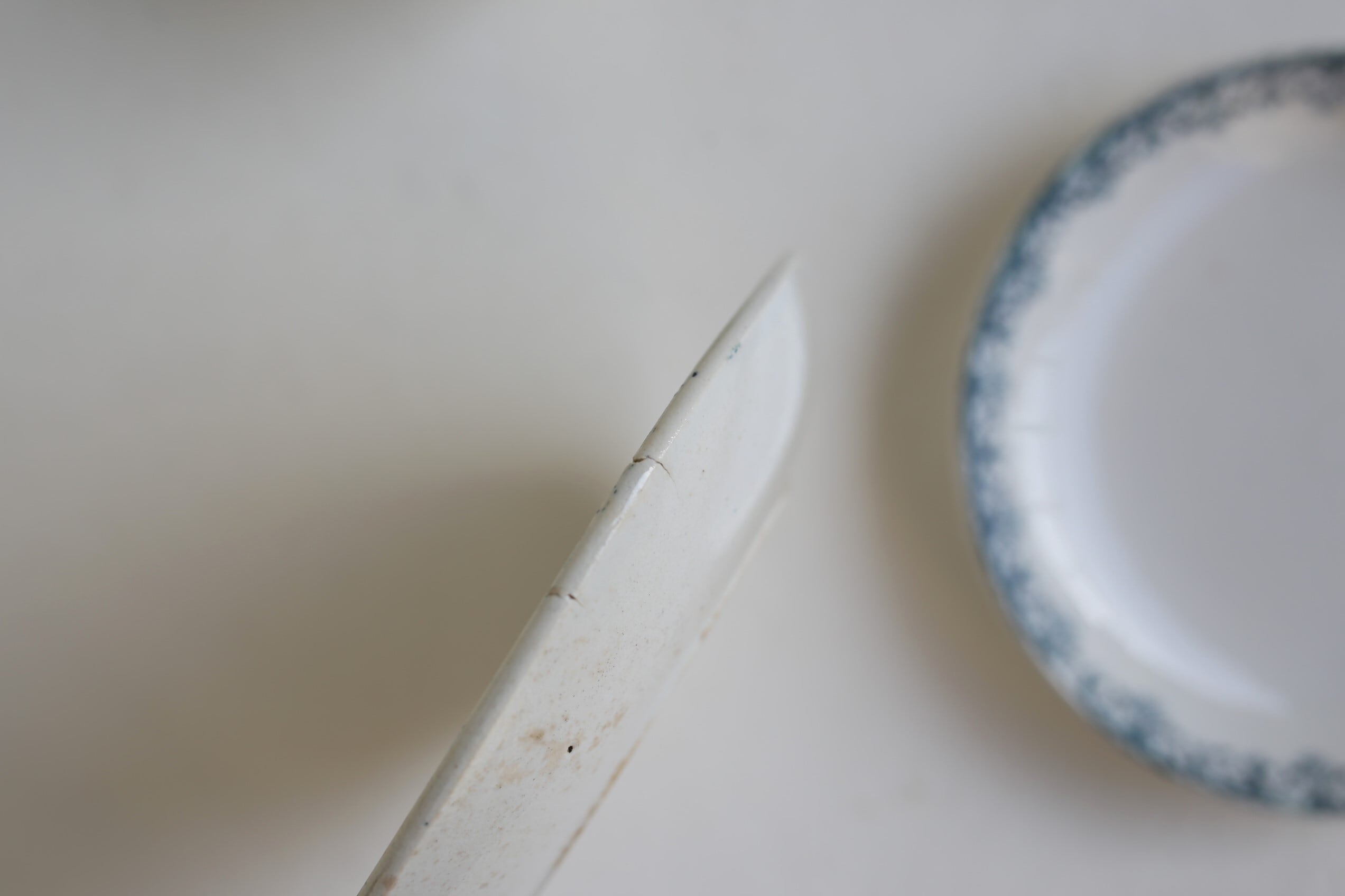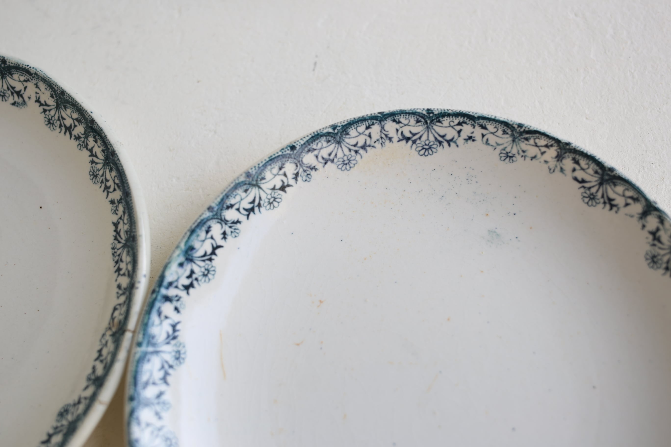 ソーサーは1枚は焼成時にできたと思われる数ミリの亀裂やシミが目立つものと、もう一枚は表面に釉薬が薄く、ざらつきと色付いた箇所と貫入染みがあります。