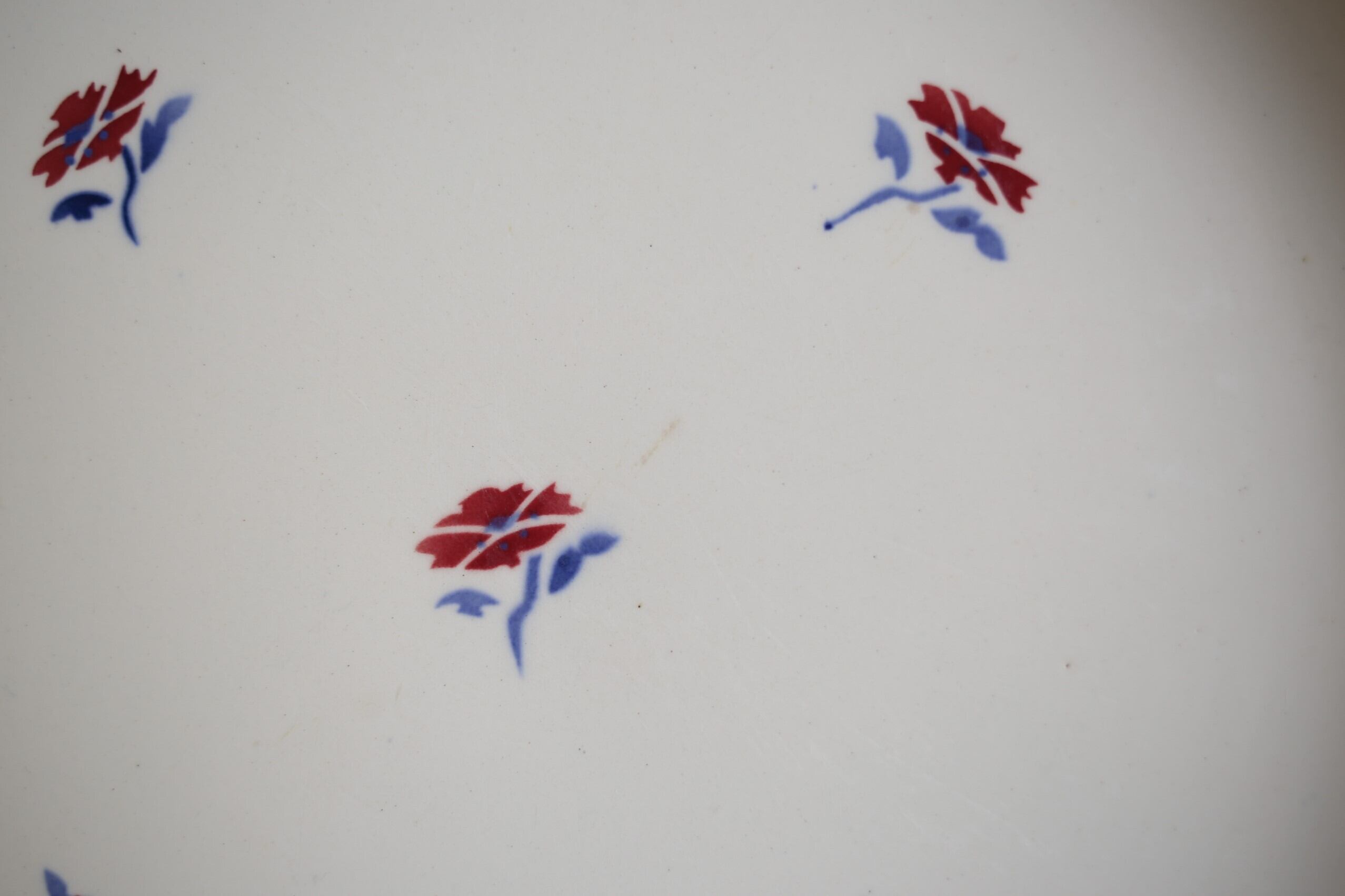 ブルーとボルドーに近い赤色で描かれた可愛らしい小花にリムのブルーの縁取りが良いアクセントになった素敵なデザインです。