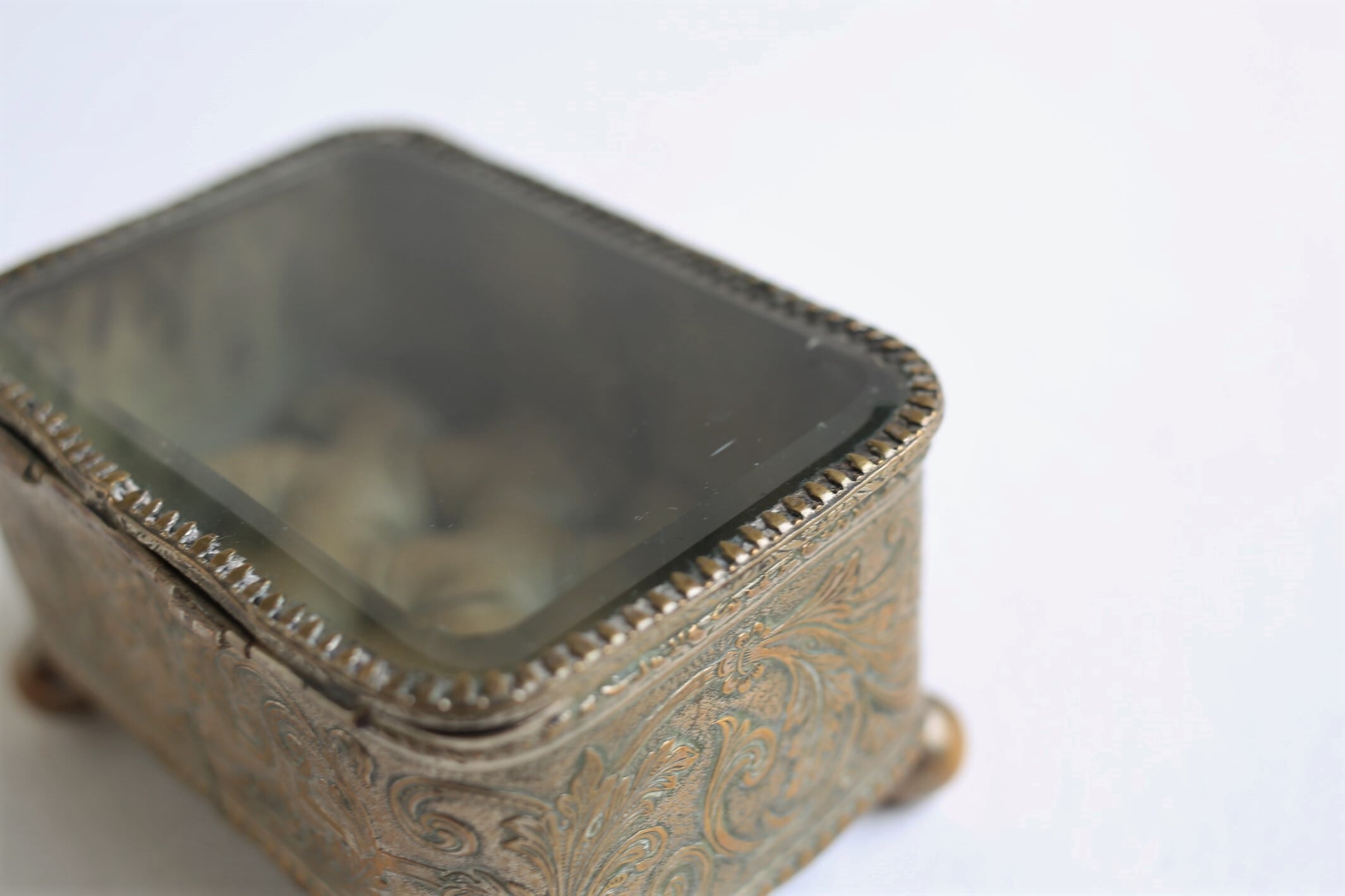 真鍮製のケースにはアラベスク模様が浮かび、蓋は縁にカットが施された厚手の美しいガラスがはめられています。