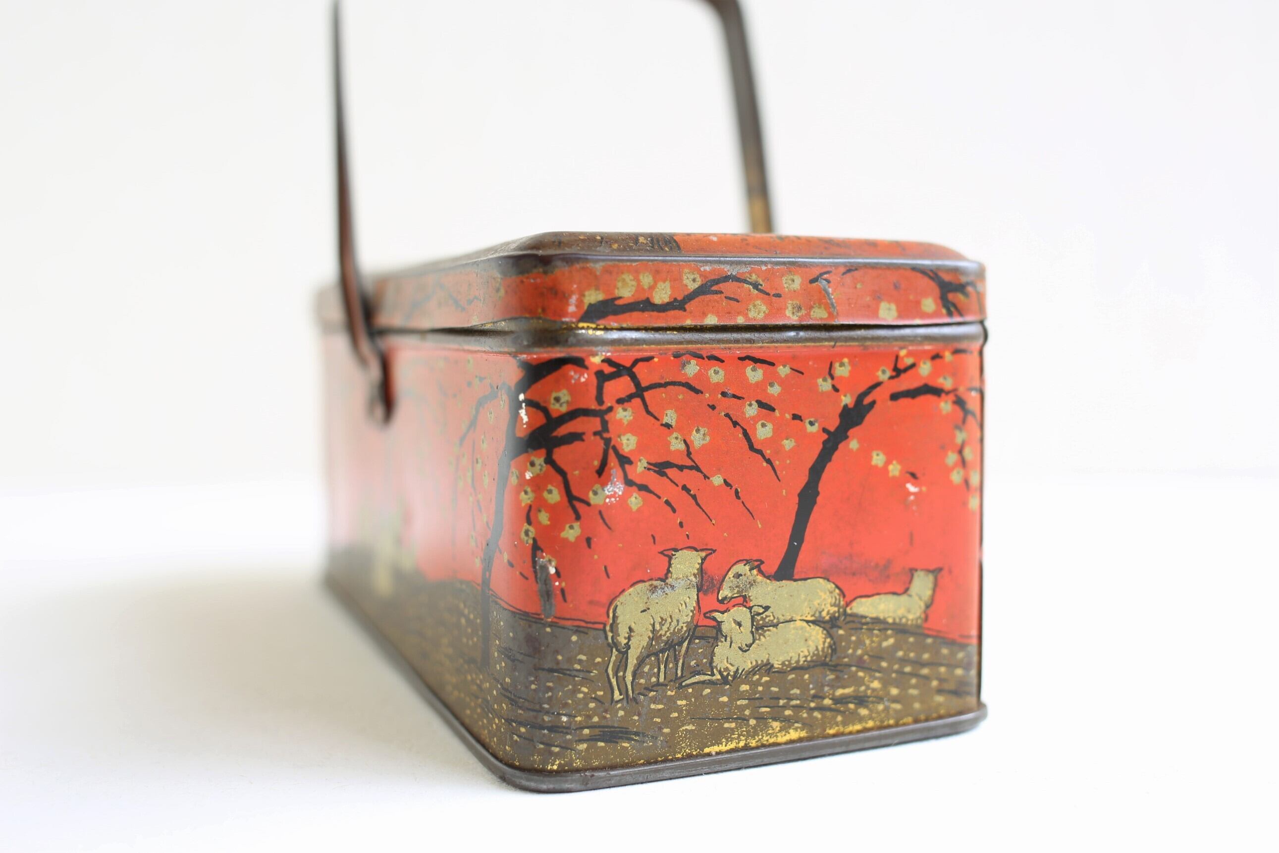 夕焼けのような落ち着いた朱色(オレンジ色?)に羊など牧歌的な風景が描かれとても素敵な缶です。