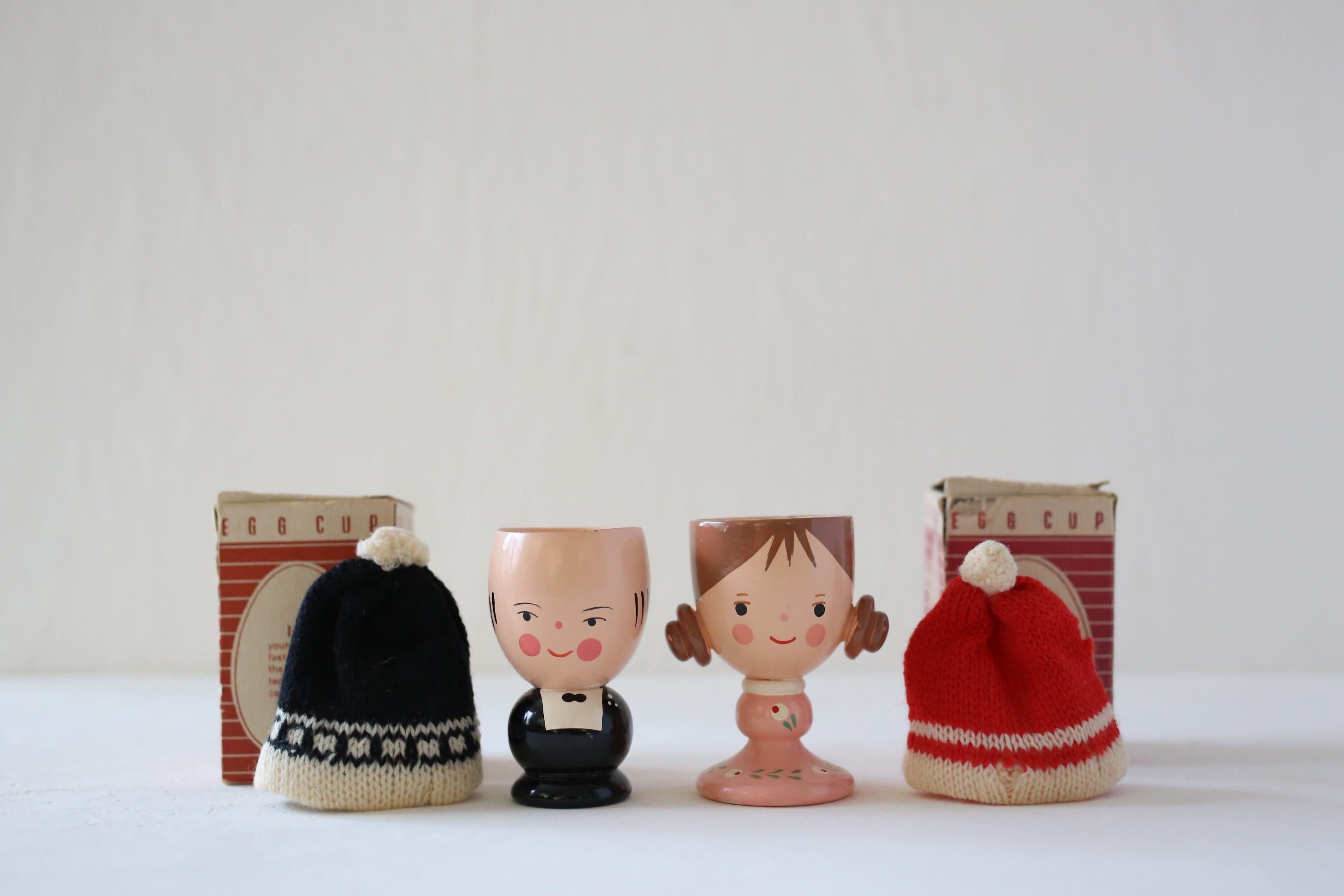 なんとも可愛らしい男の子と女の子のデザインのエッグススタンドに保温用のニット帽が付いています。