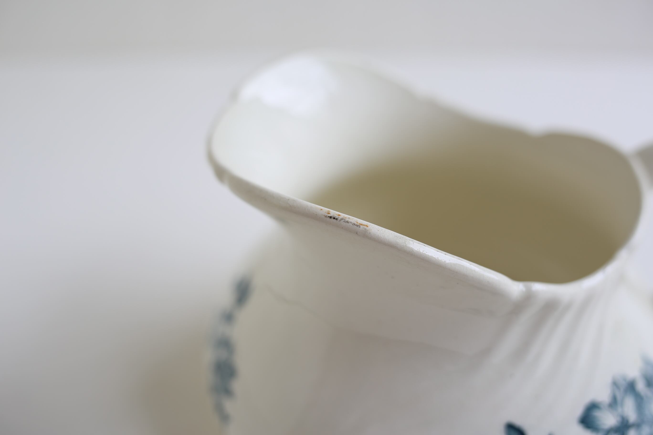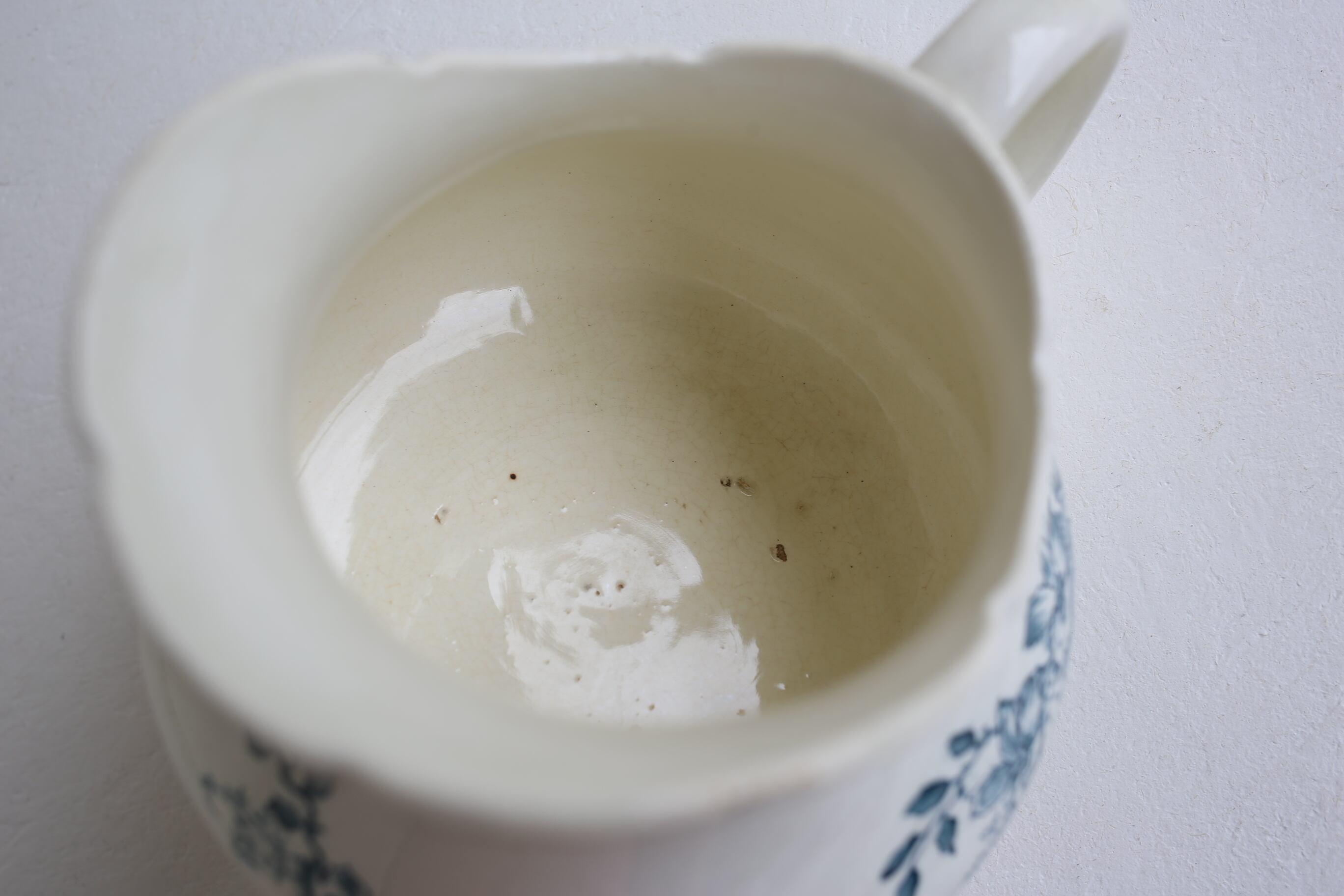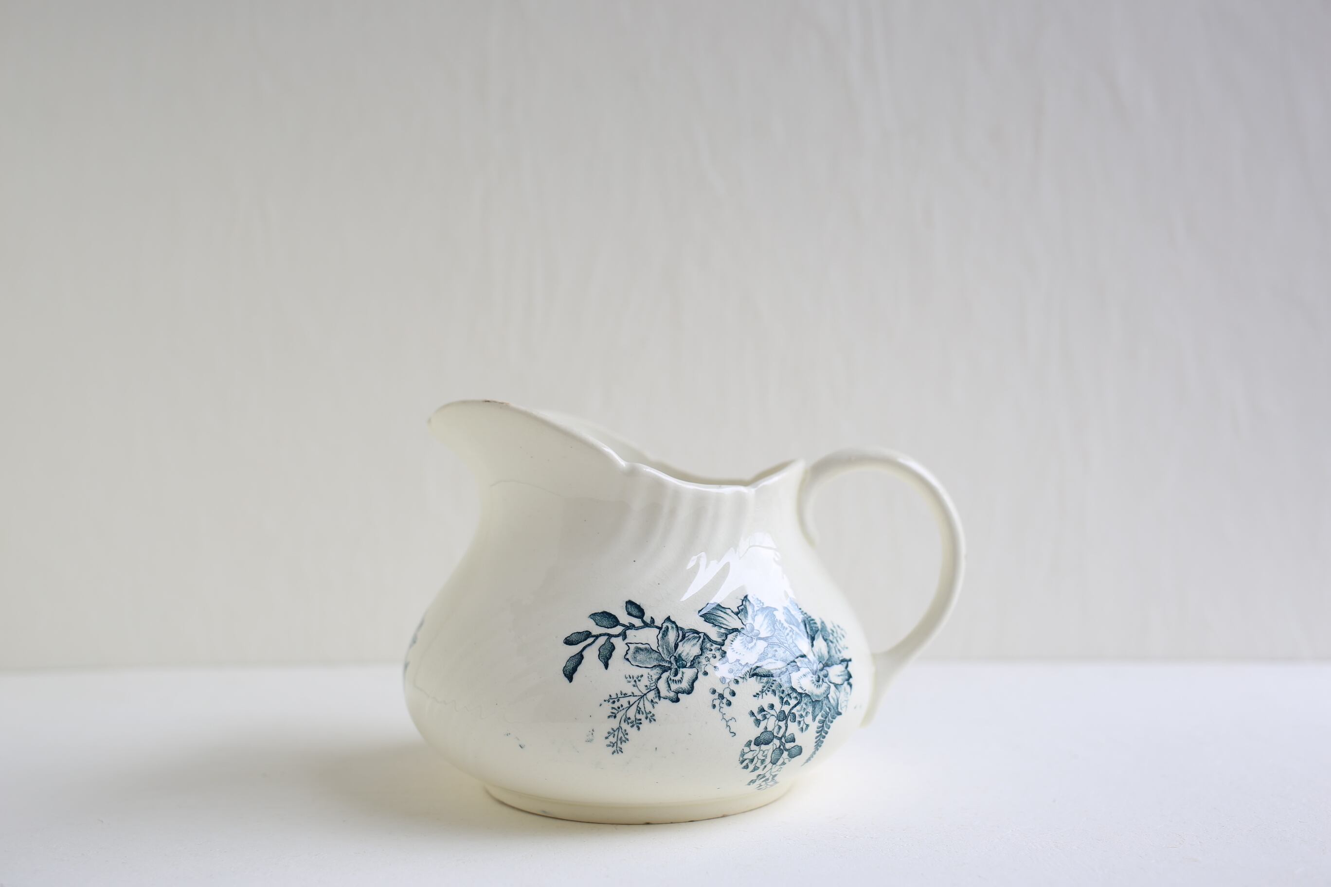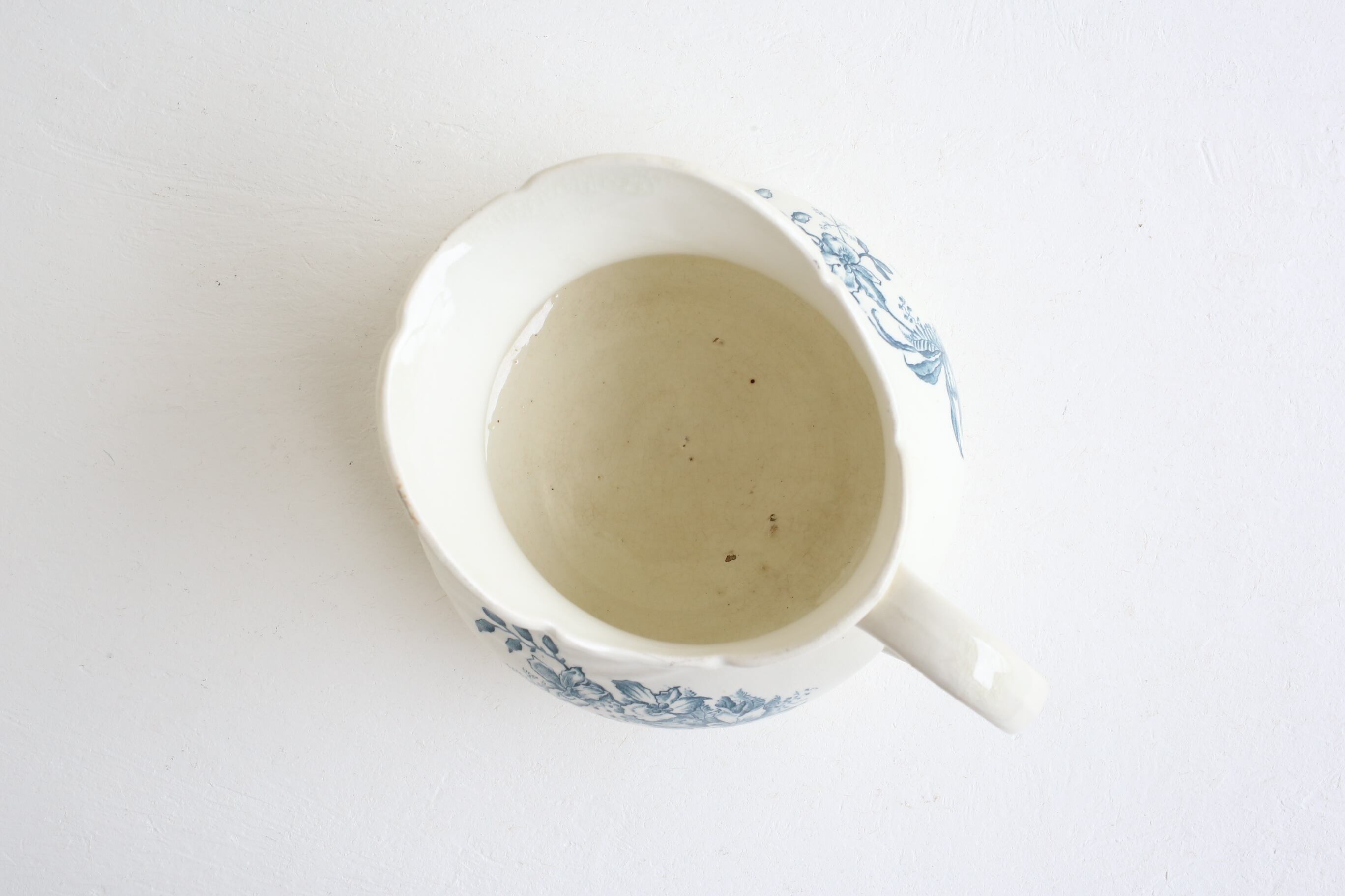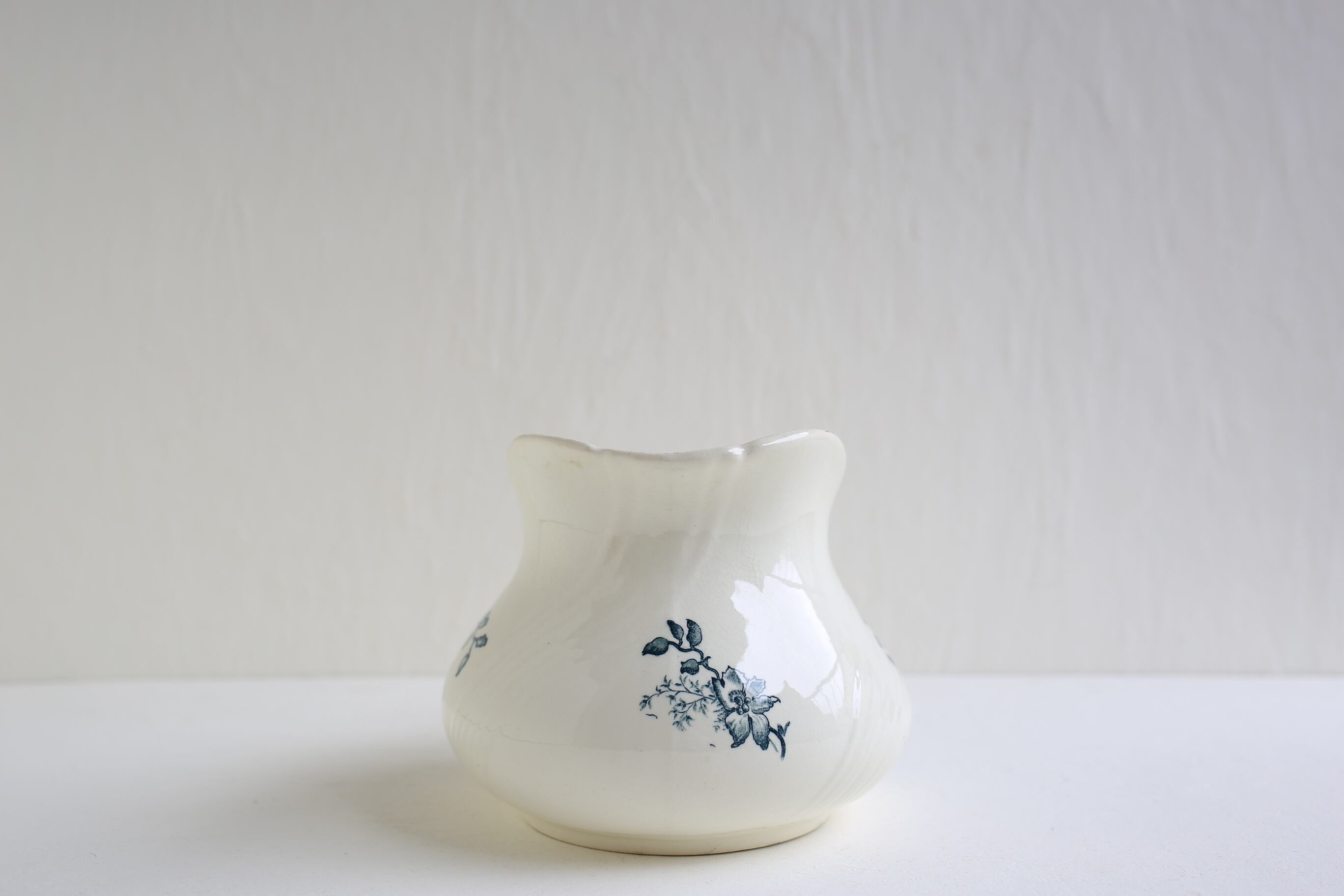 この美しいアイボリーの陶器に青緑の中間色で花々が品良く描かれています。