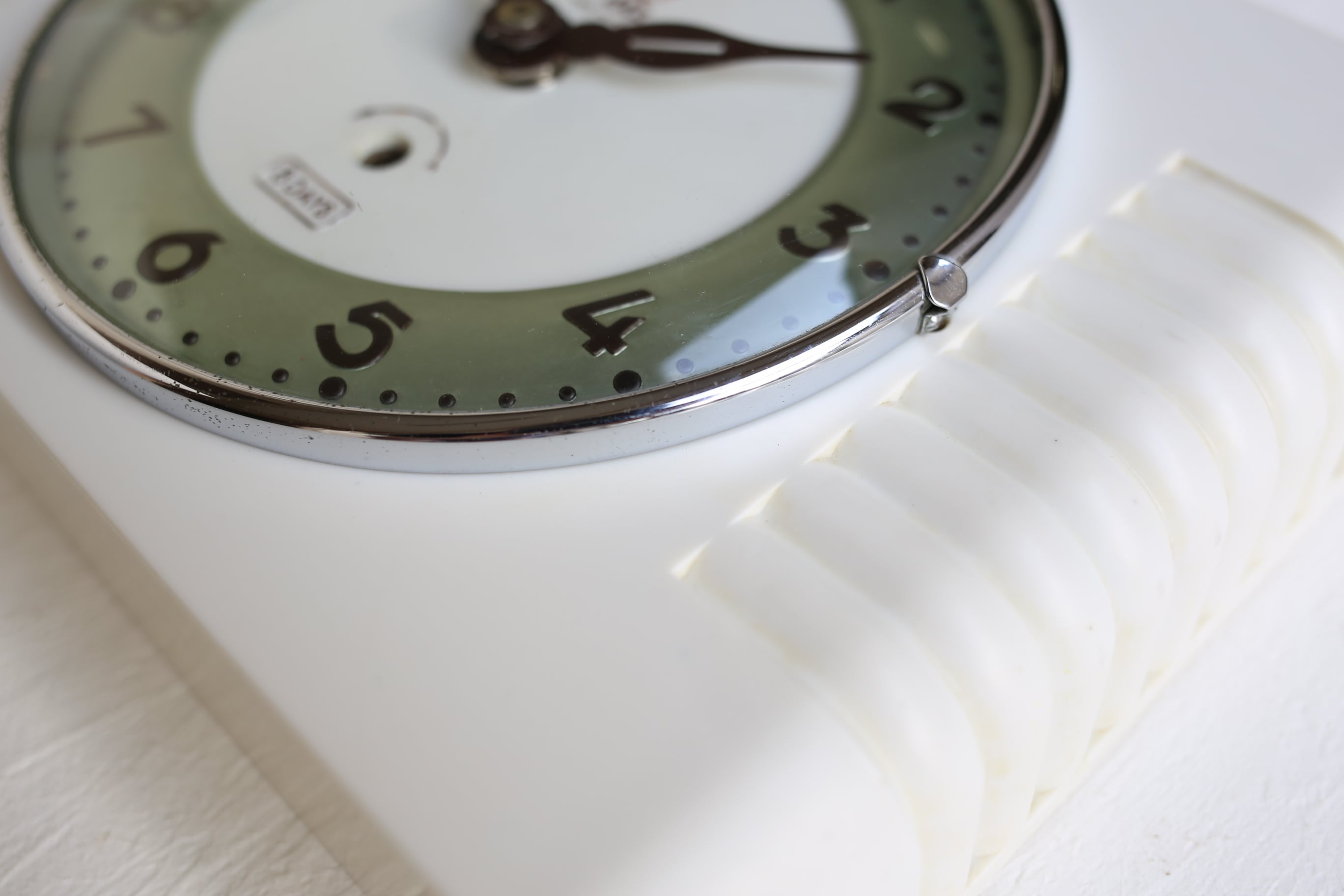 白いベークライトのケースにダークブラウンの針と数字、シルバーのフレームに数字の下のメタリックな淡いグリーンと素敵な配色です。