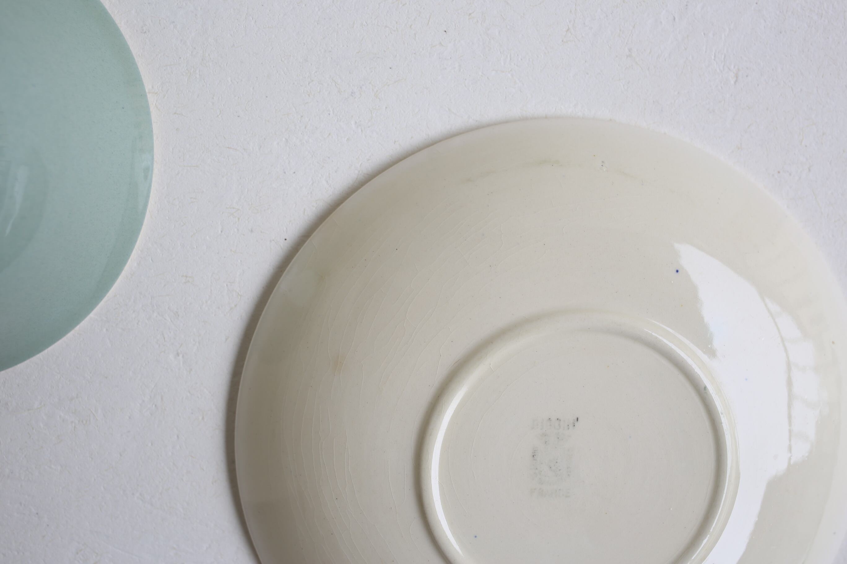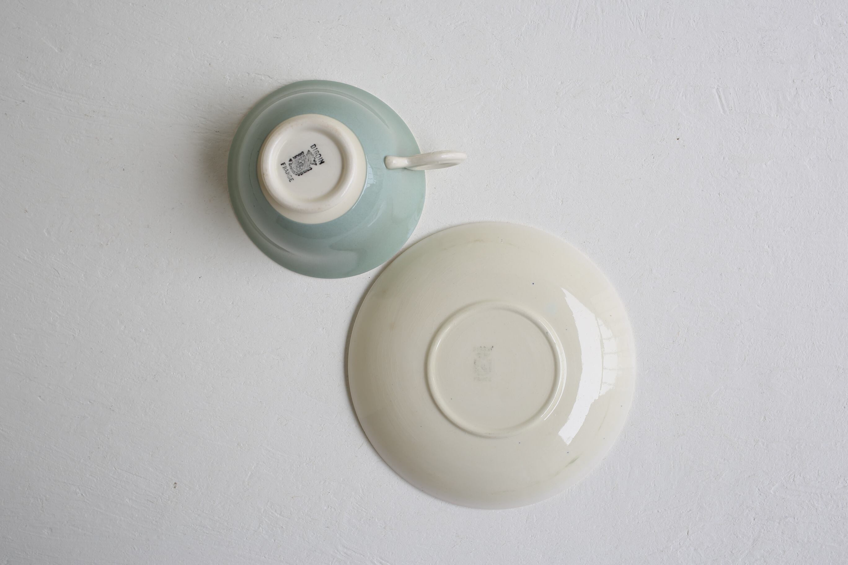 ソーサーは表面に貫入と微細なキズ、縁にスレや小さなチップ、底面に薄い色付きはありますがそれ以外は釉薬など製造時のムラ程度で良い状態です。