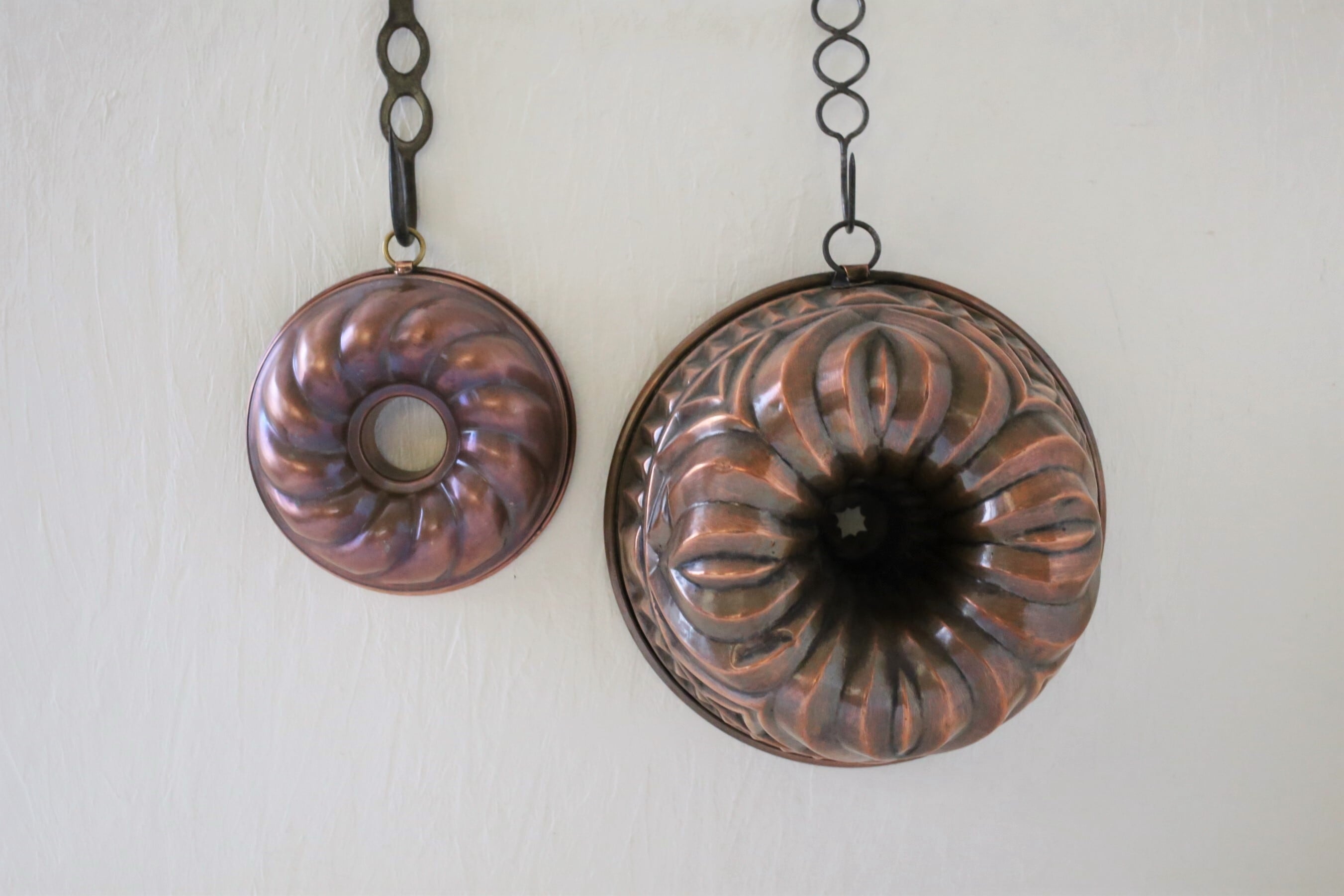 銅メッキの輝きや使い込まれた風合いが美しく、リングで壁に掛けられるようになっています。