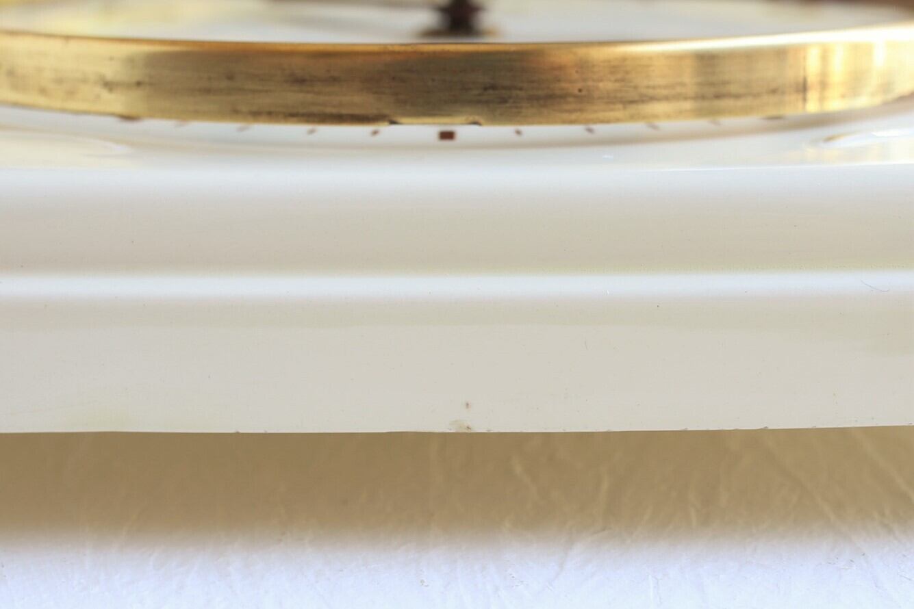 ガラスカバーが付いていないこと以外は、下部の左右にある装飾の金彩の薄れや針の微細なペイントの剥離、ゴールドのフレームのクスミ、ゼンマイの穴の縁に微細なチップが見られる程度で、目立つダメージもなく良い状態です。