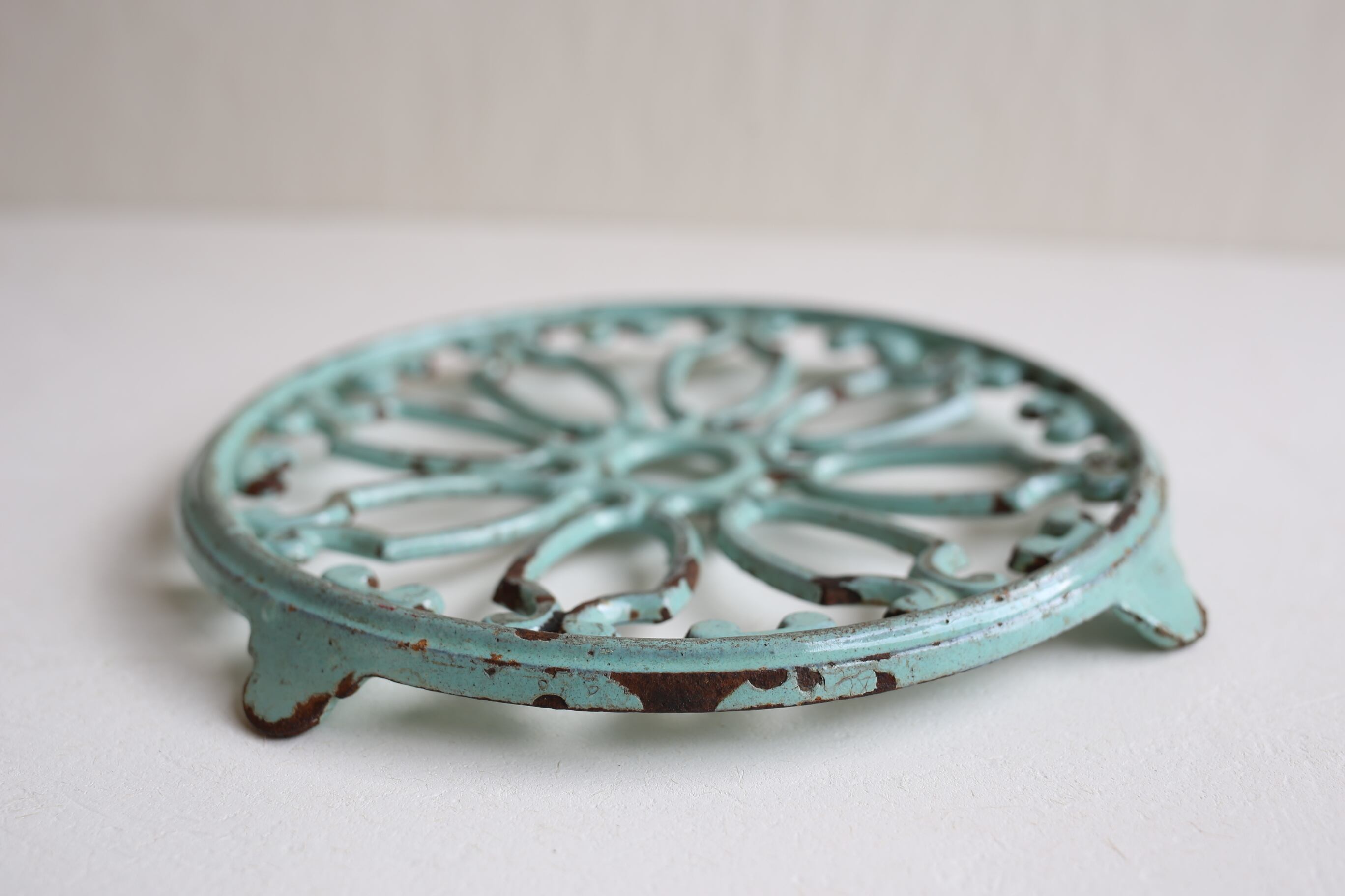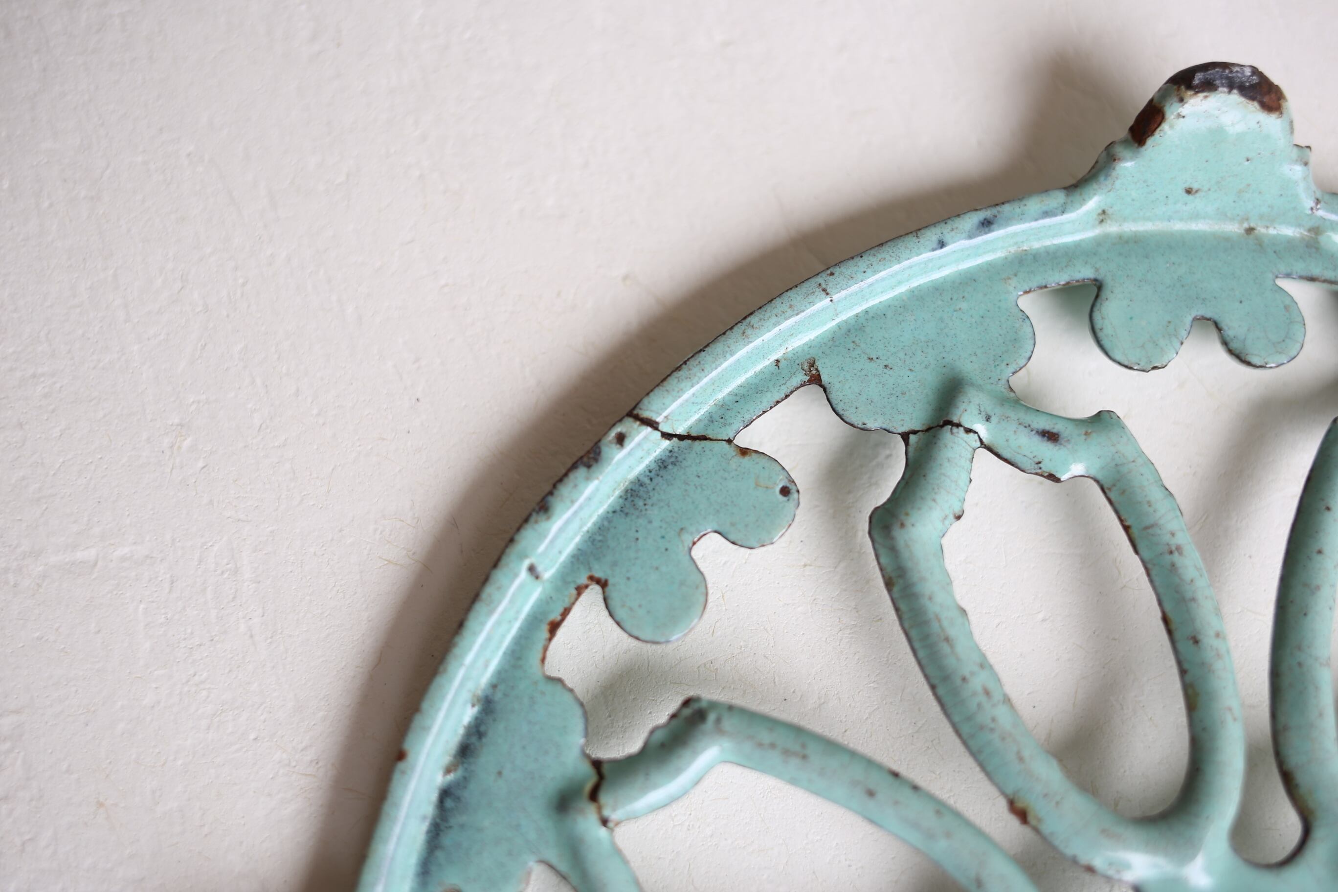 フランス アンティーク ヴィンテージ 鍋敷き トリベット 鋳物 アイアン製 ターコイズブルー N-03910