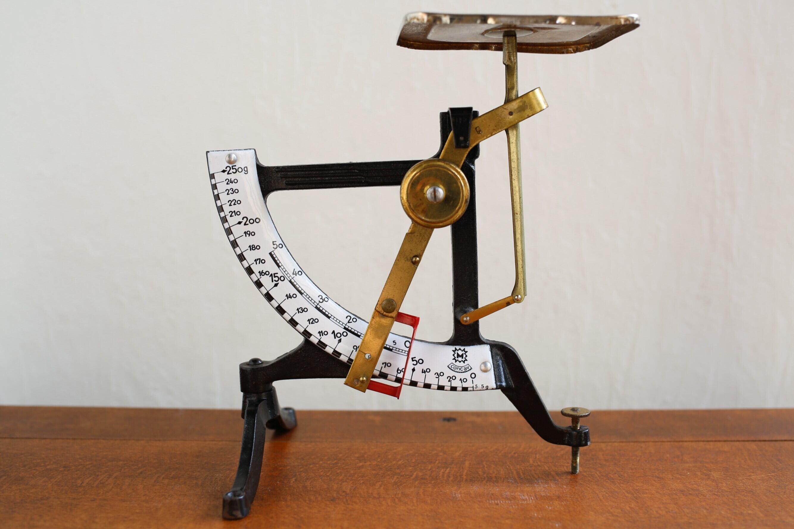 メモリは二段の表記があり、おもりを上下に移動させてるさせることで250gまでと50gまでの二通りのレタースケールとして使用できます。