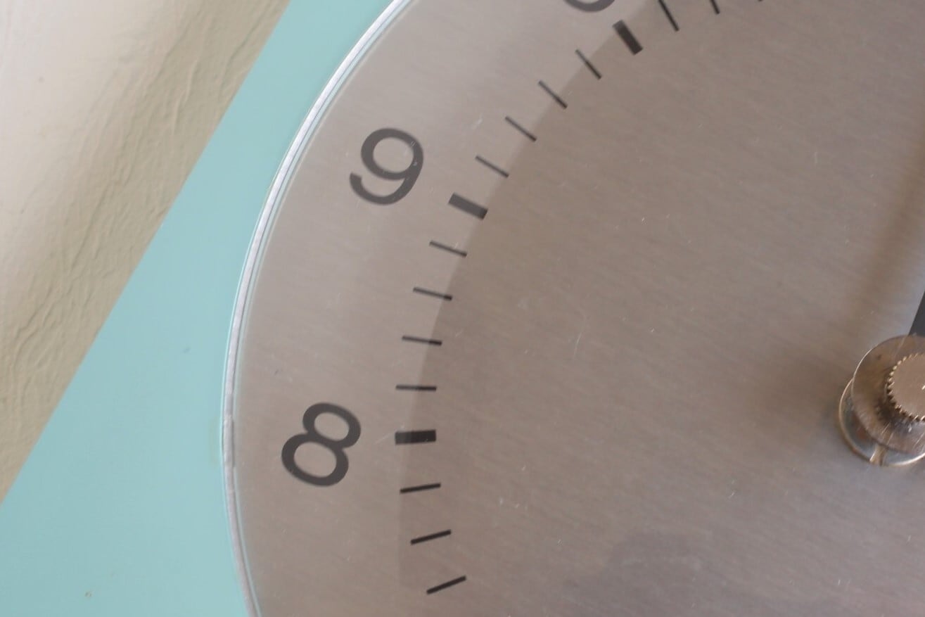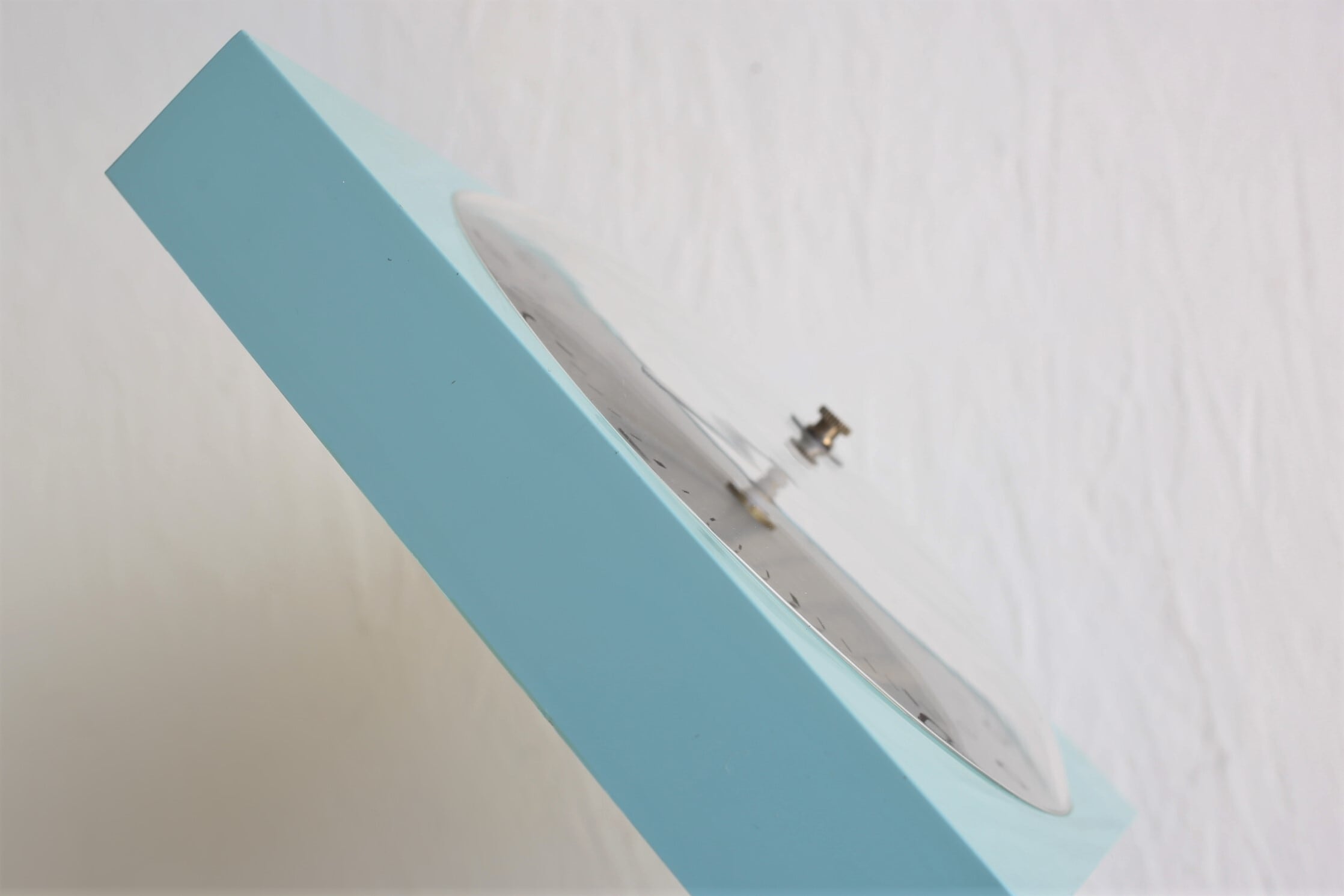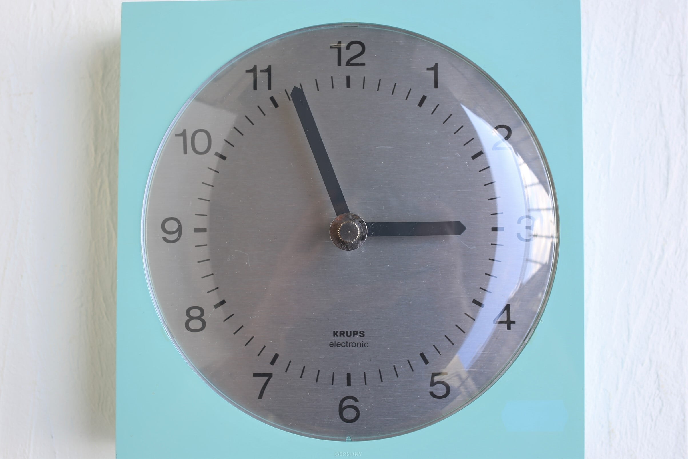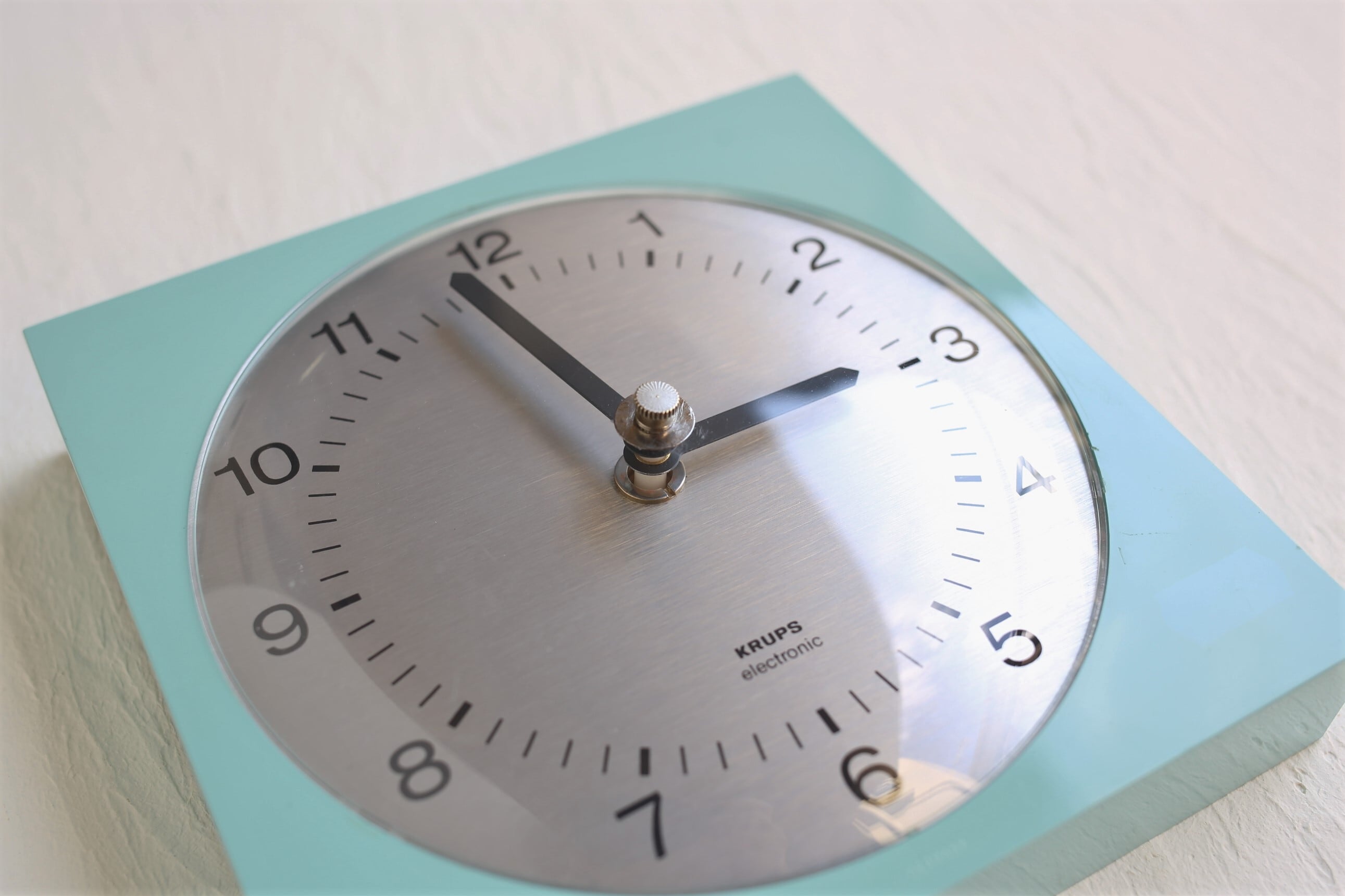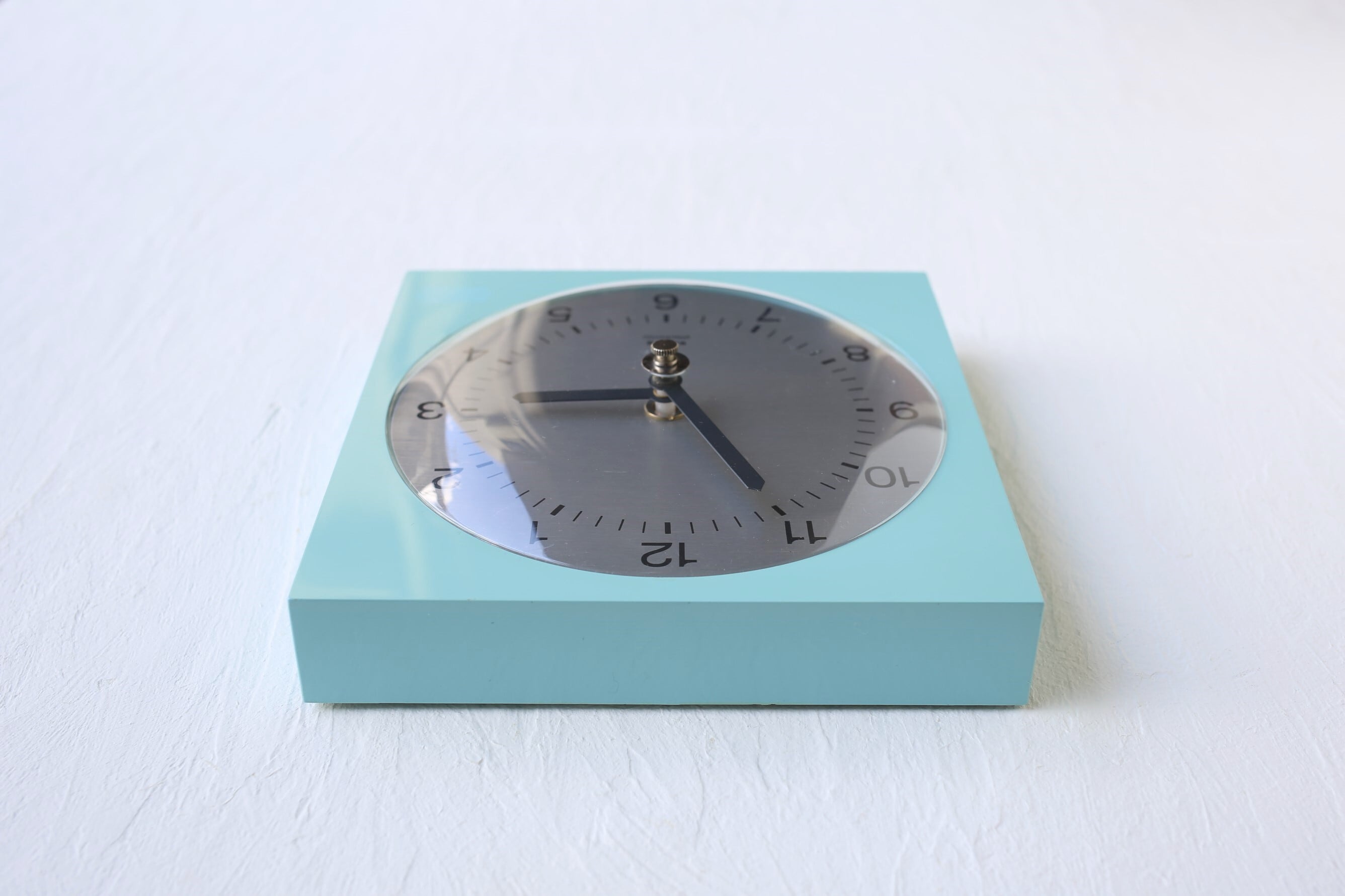 こちらはキッチンに合いそうな水色×シルバーの掛時計です。