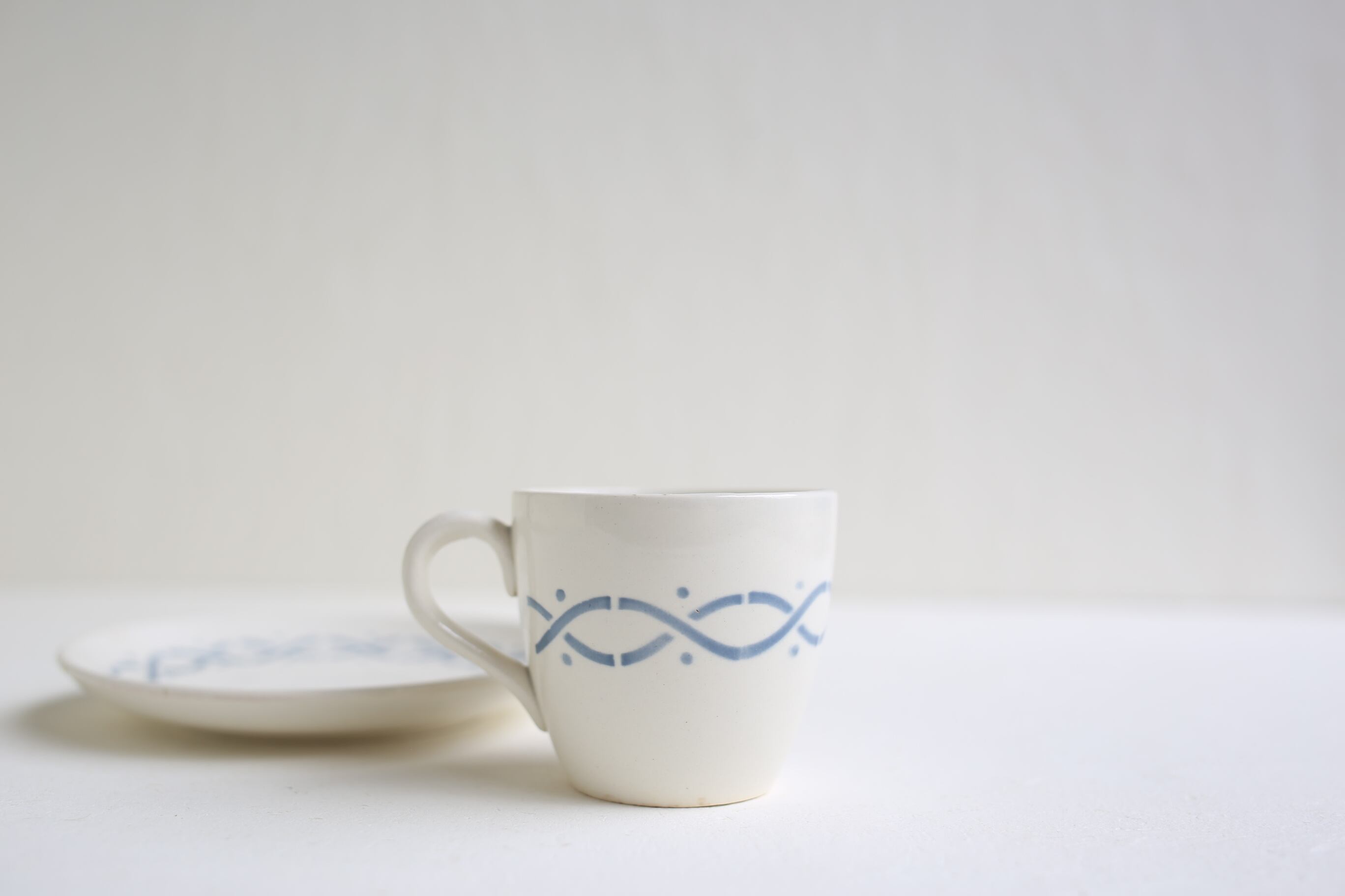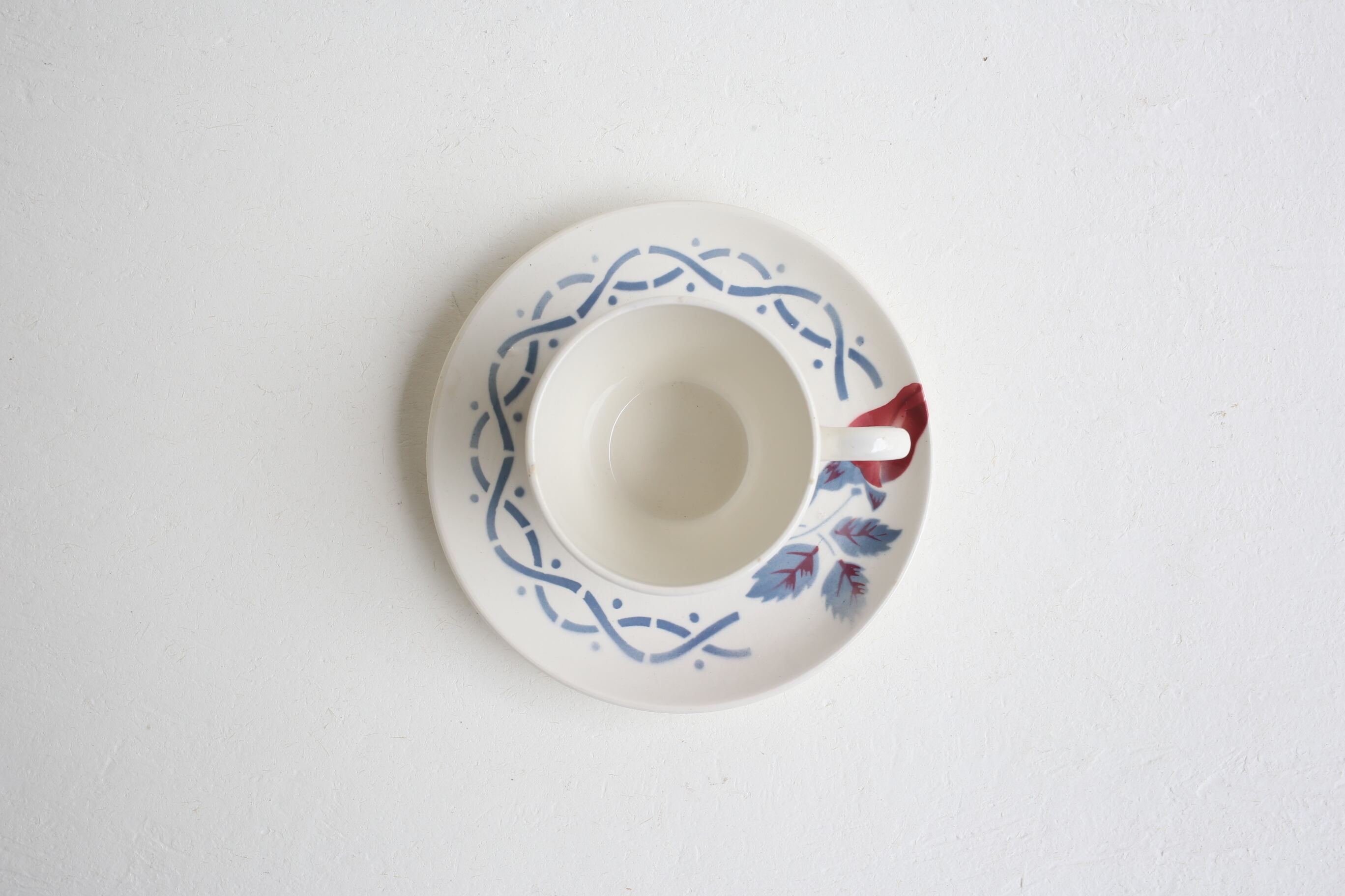 カップの底の縁にわずかにスレや薄いシミ、製造時の色移りがあり、ソーサーは薄い丸いシミがあります。