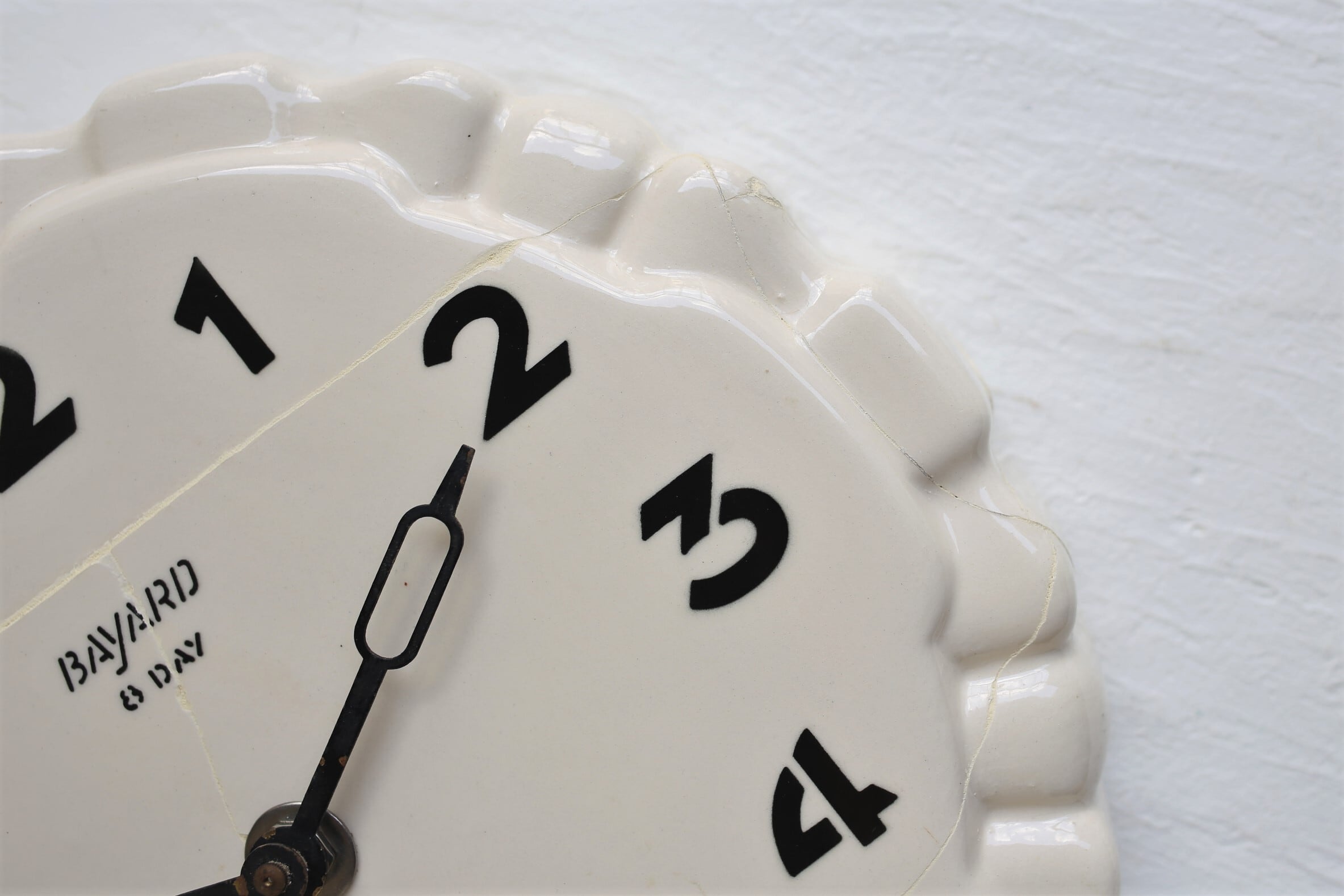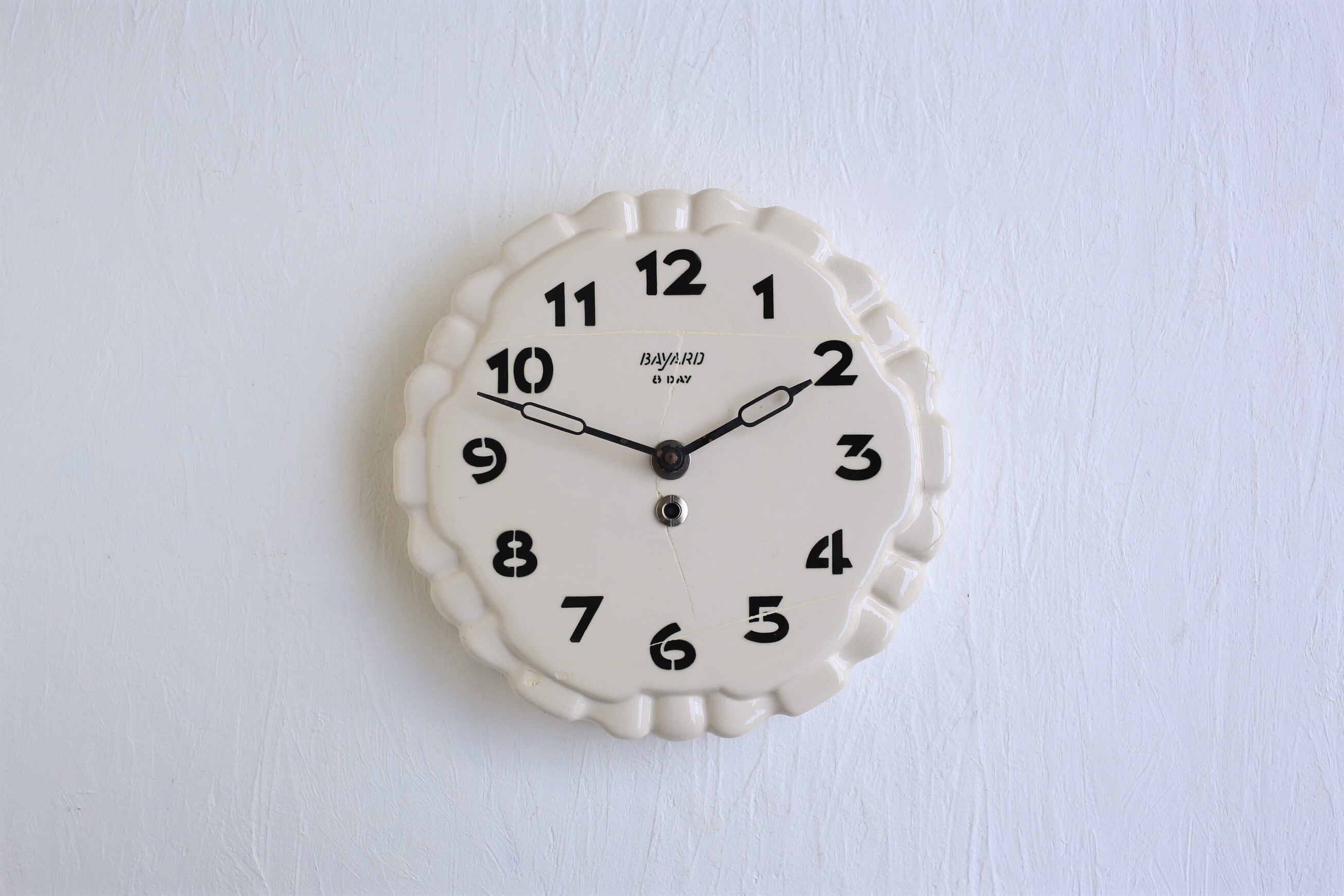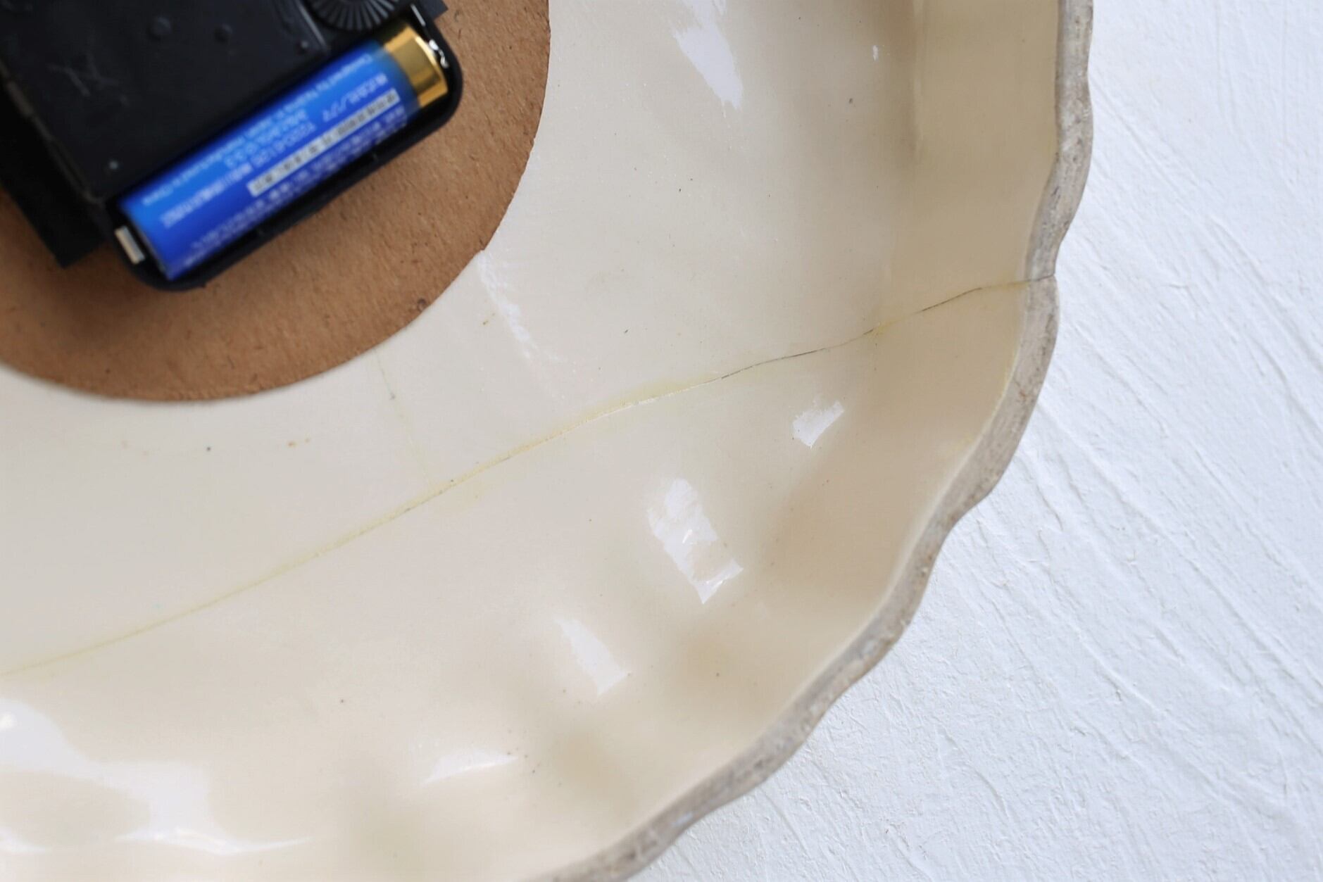 フランス アンティーク ヴィンテージ BAYARD 陶器製 壁掛け時計 花リム型 ※破損修繕跡あり (単3電池式クォーツ交換済) N-03990