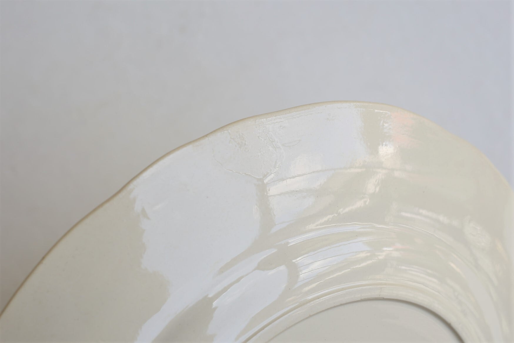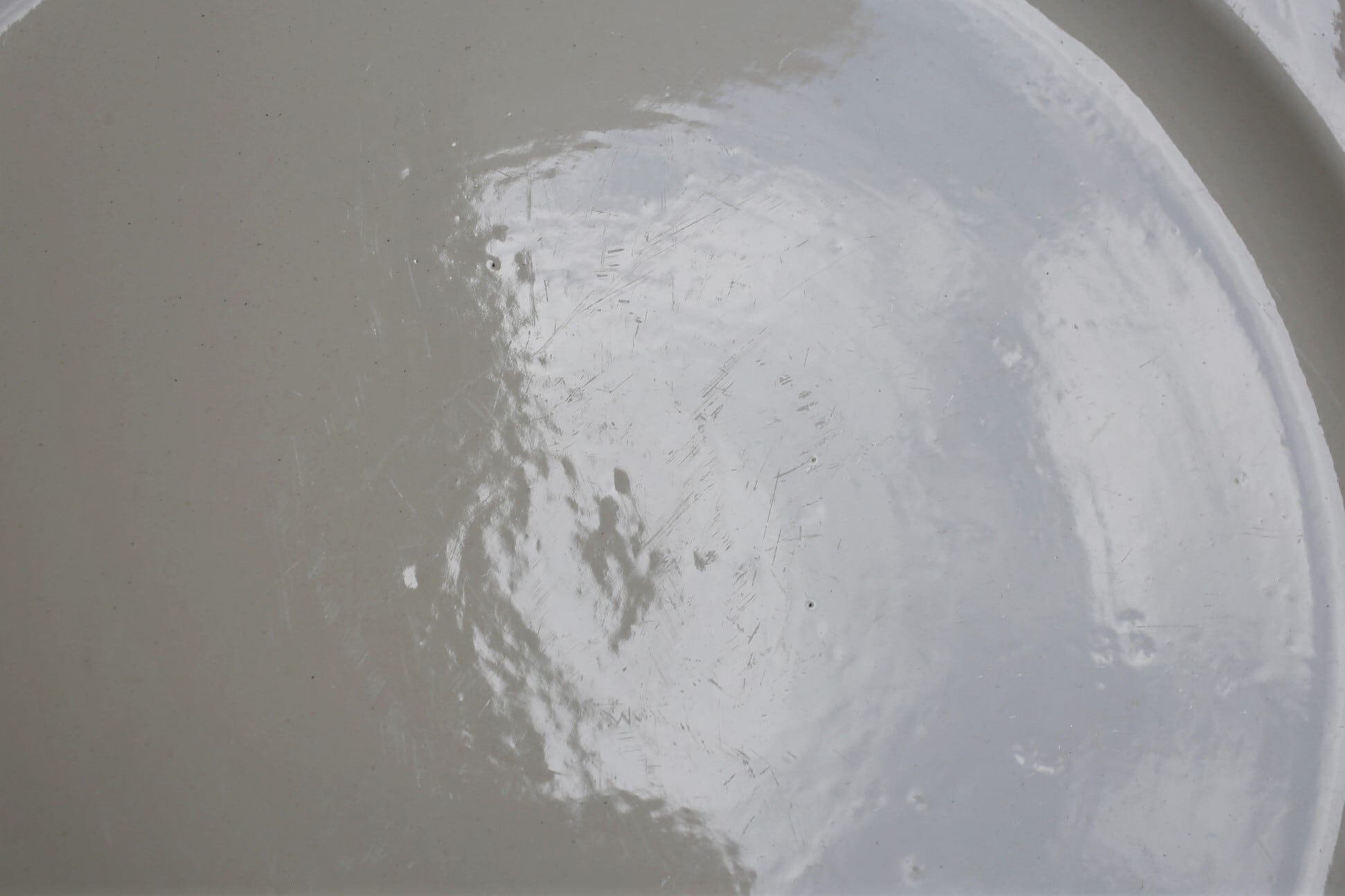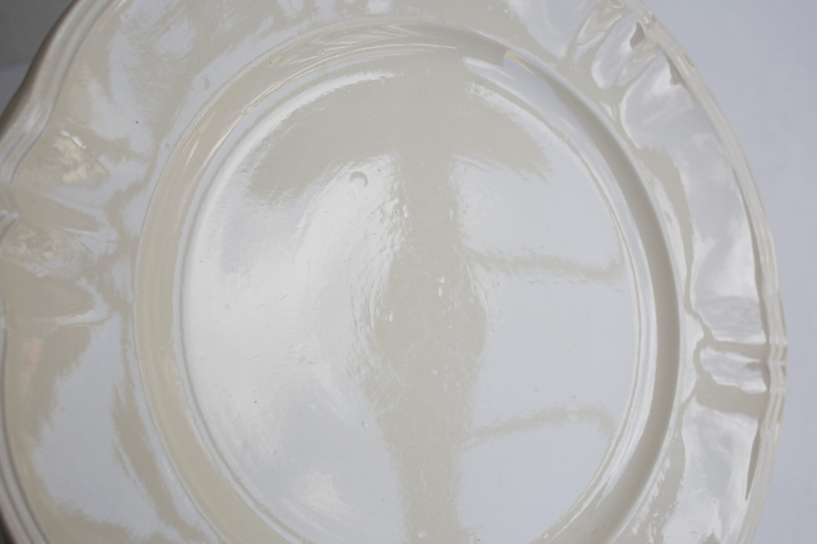表面に一点薄く小さなシミが見られますが、それ以外は微細なカトラリー跡や製造時からのムラ程度で全体的は目立つカケやヒビもなく良い状態です。