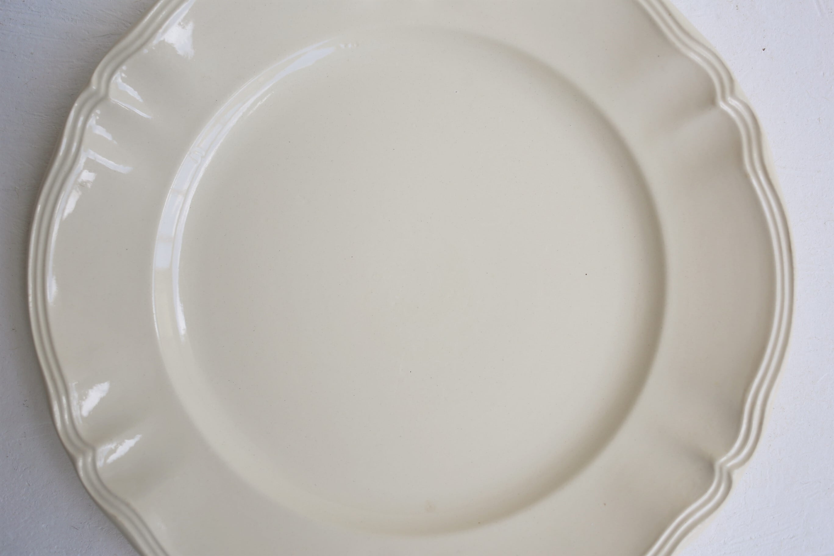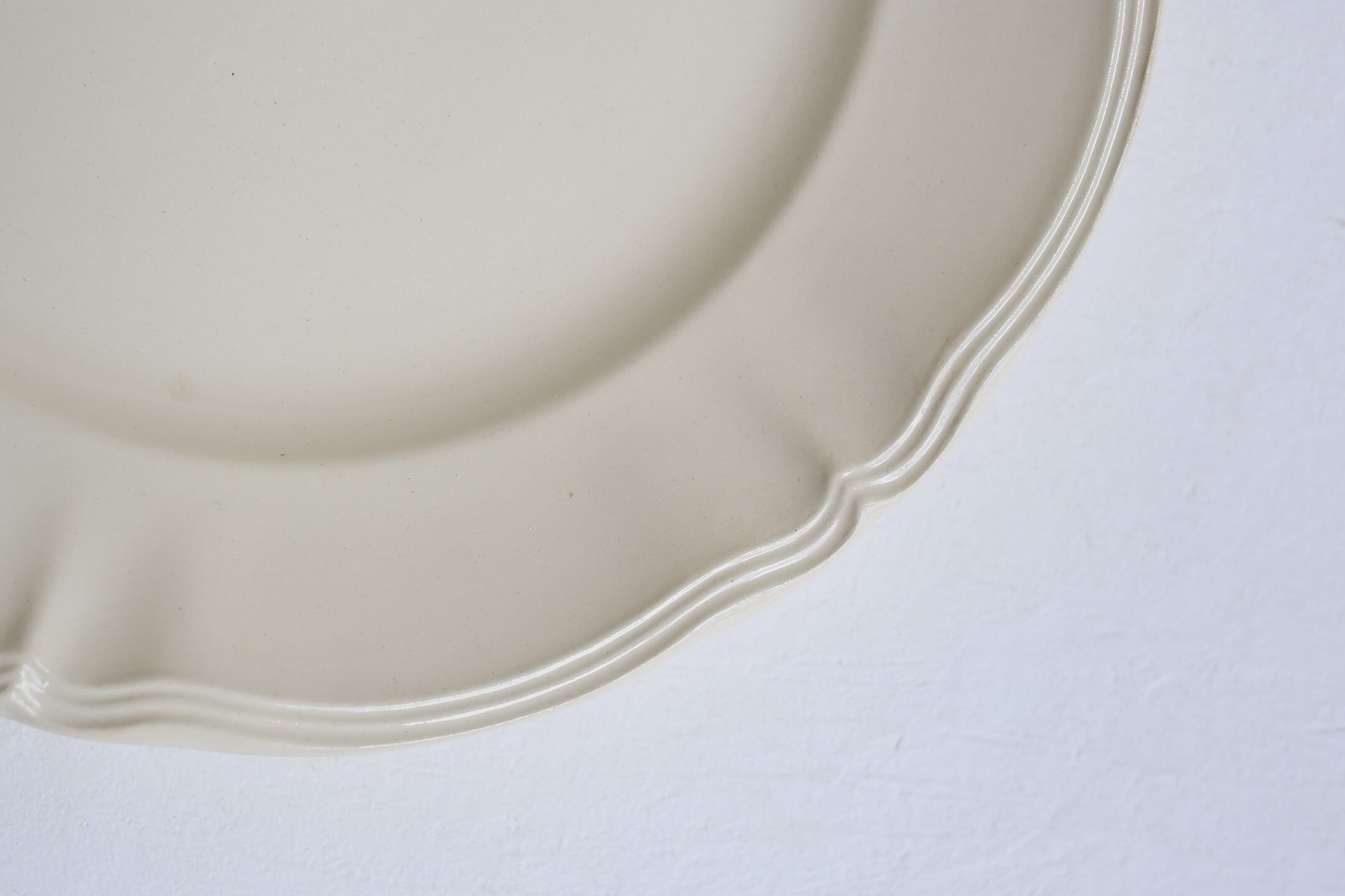 クリーム色の陶器に釉薬の艶が良い雰囲気で、何とでも合わせやすく飽きのこない素敵なプレートです。