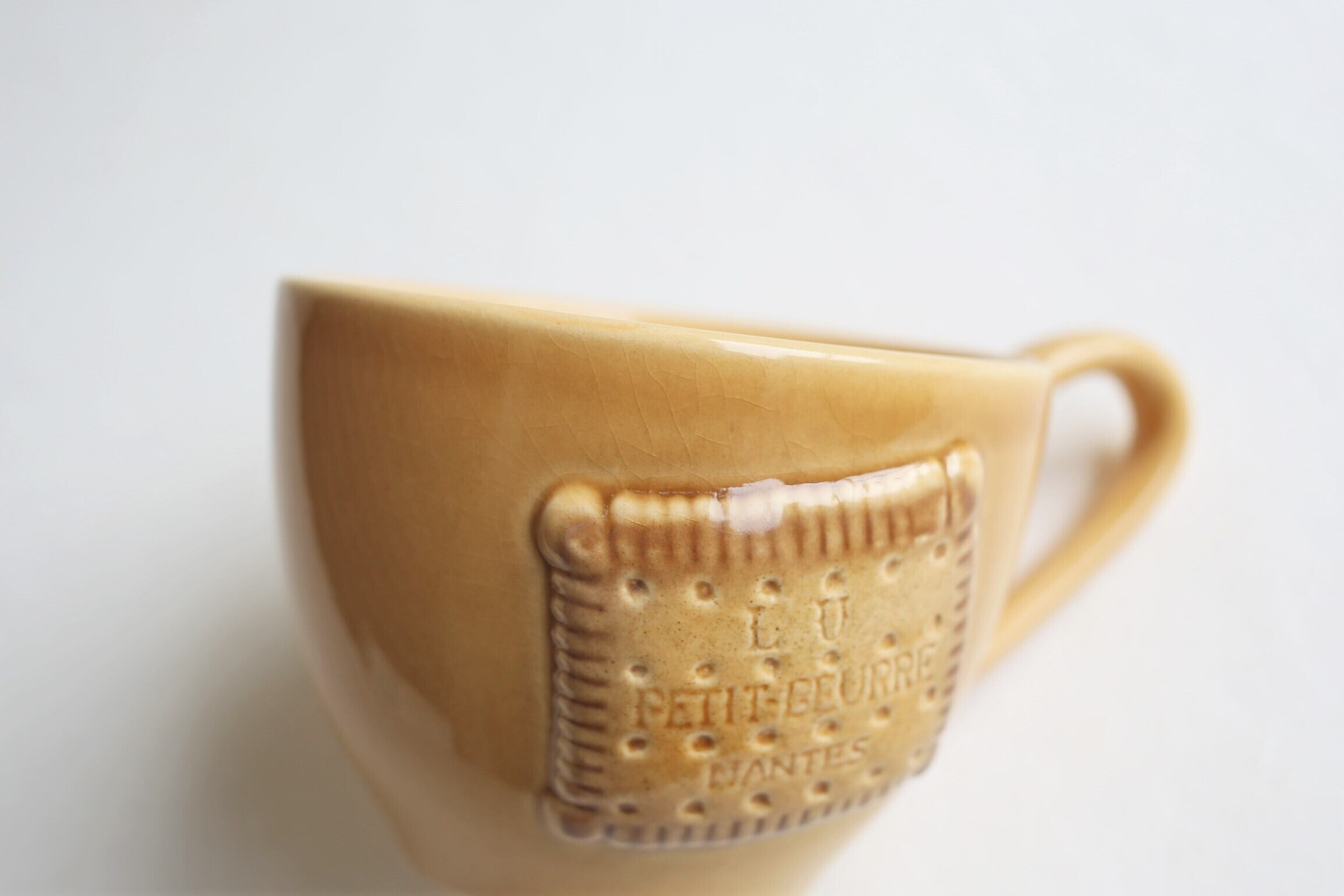 本物のビスケット『PETIT BEURRE』が付いたようなようなデザインが可愛らしい LU の大きなカフェオレマグです。