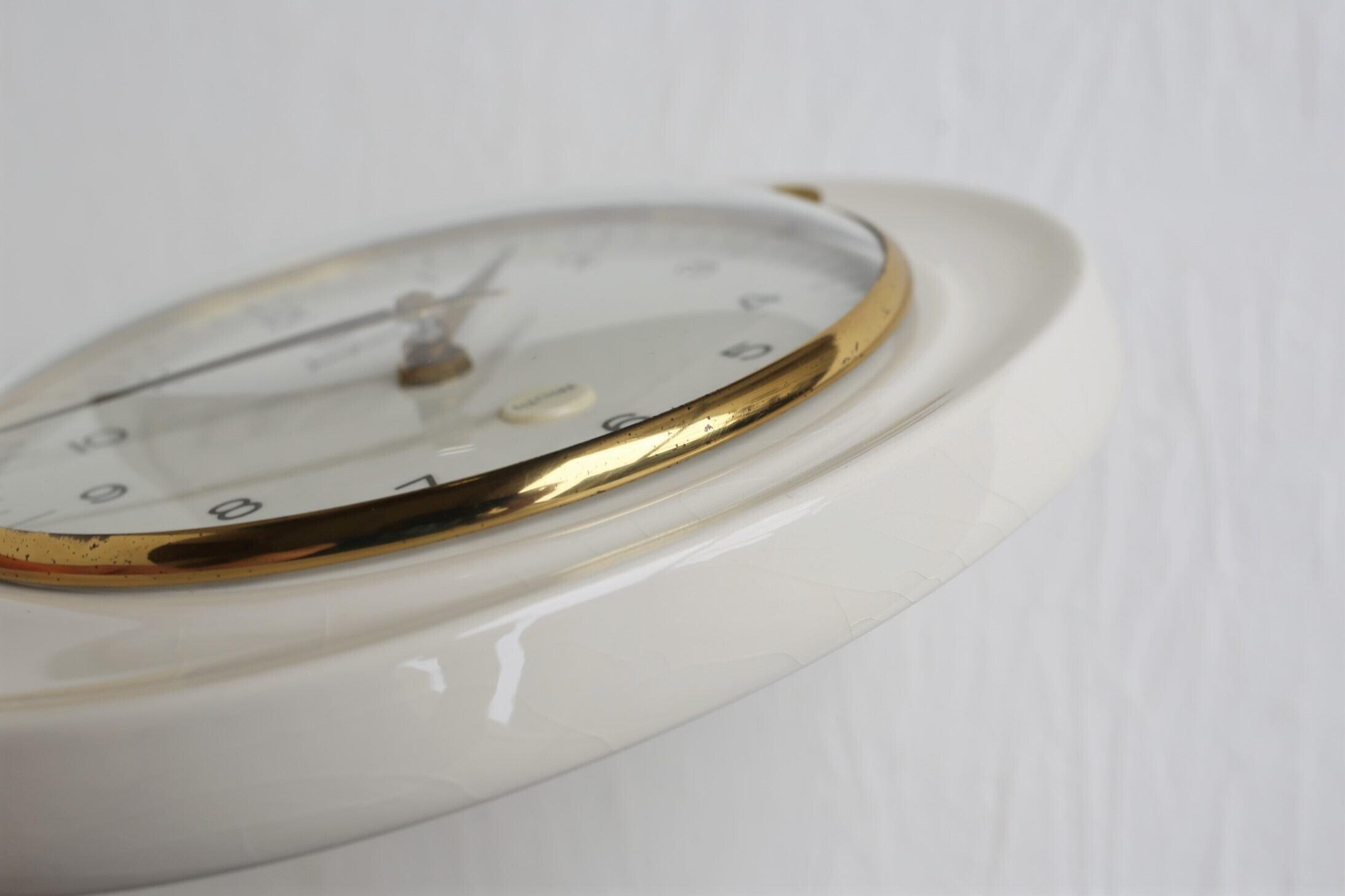 白に近い明るいアイボリーの陶器にゴールドがアクセントになった小ぶりで可愛らしい時計です。