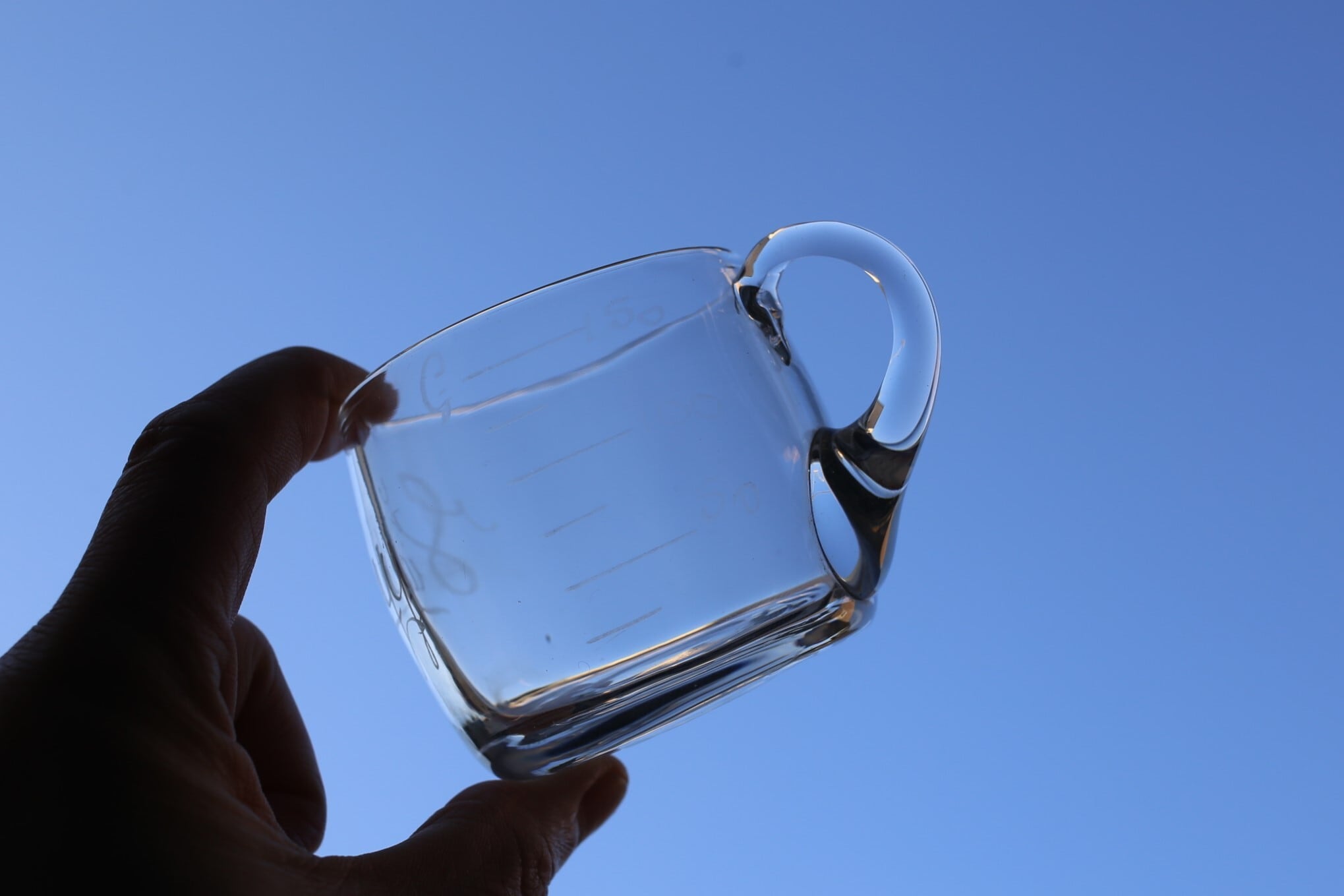 滑らかなフォルムや古い厚手のガラスならではの揺らめきが美しく、「Vichy」という文字やメモリのデザインも素敵です。