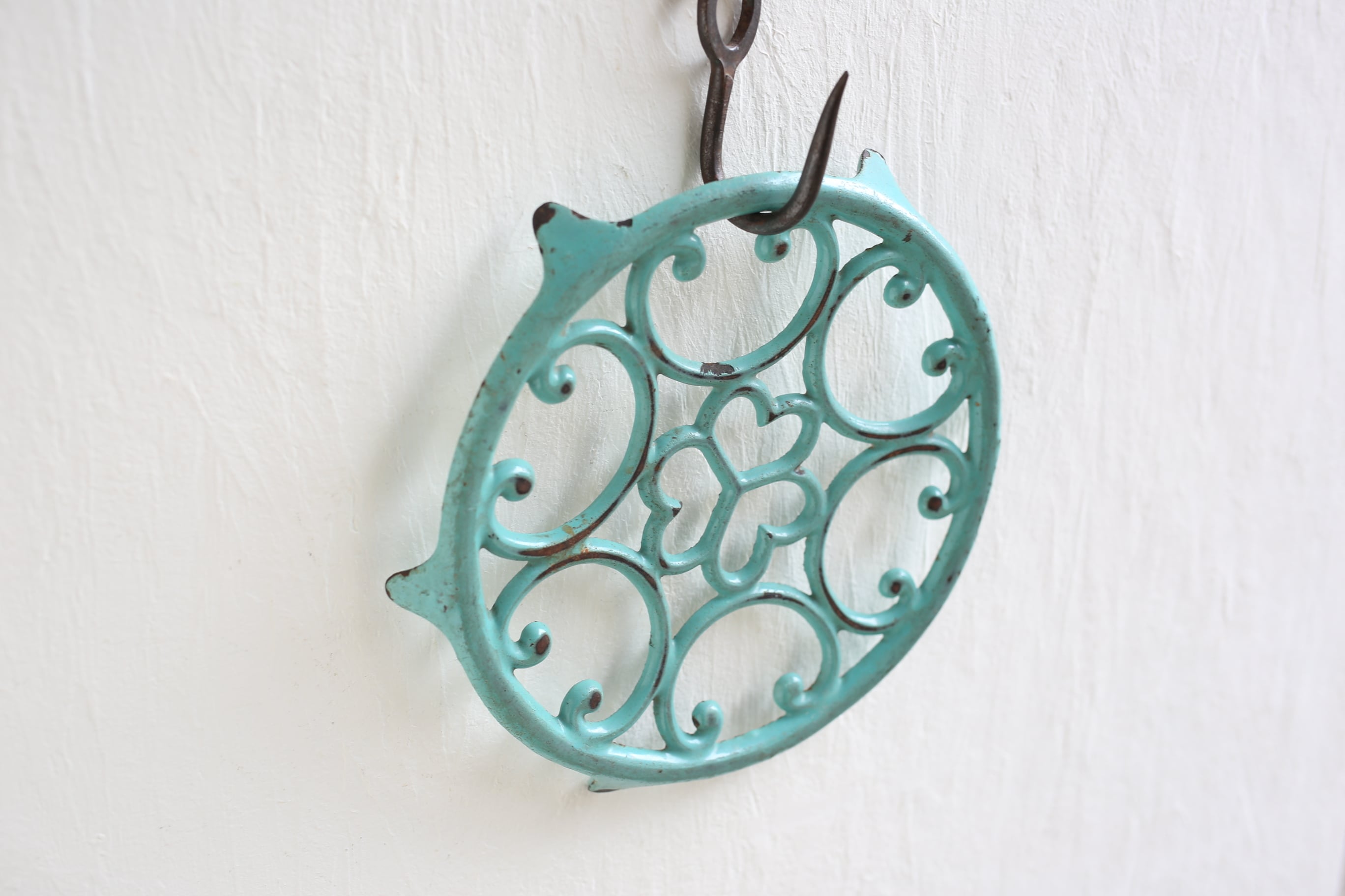フランス アンティーク ヴィンテージ 鍋敷き トリベット 鋳物 アイアン製 ターコイズブルー N-04272