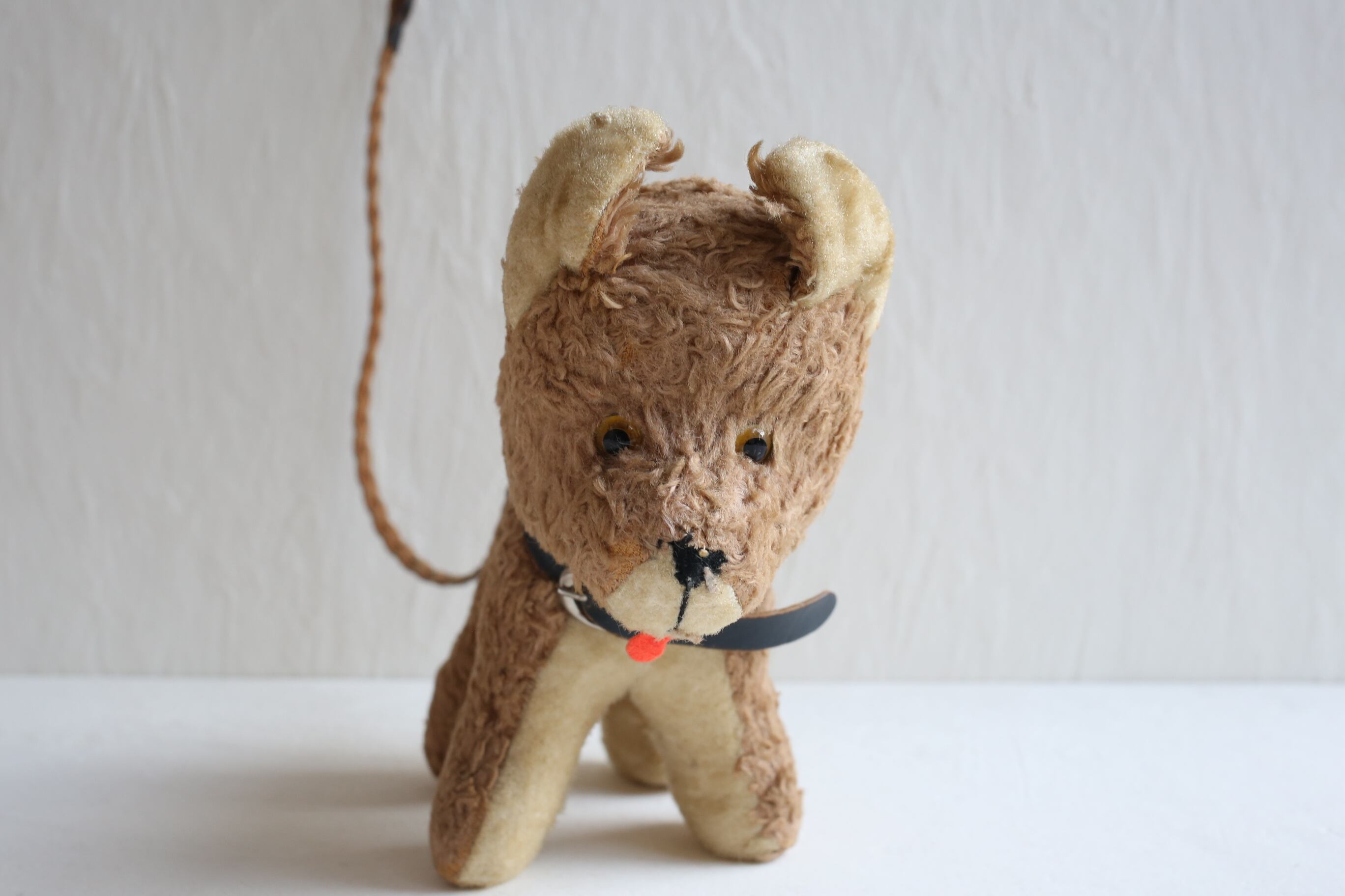 フランス アンティーク ヴィンテージ 犬のぬいぐるみ 19㎝ 革リード付き N-04349