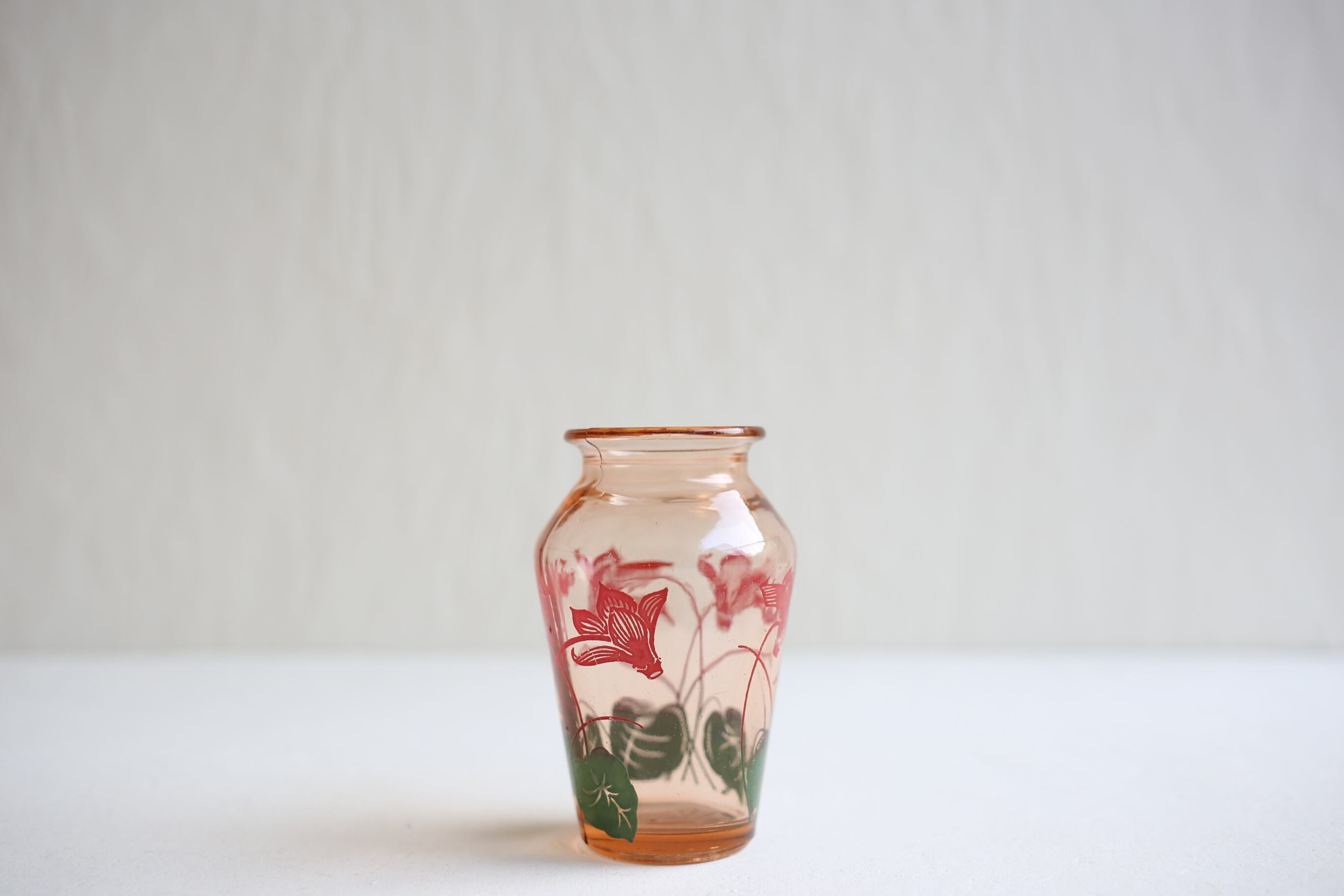 ローズカラーのガラスに花柄が入っていますが、絵柄入りのものは珍しいです。