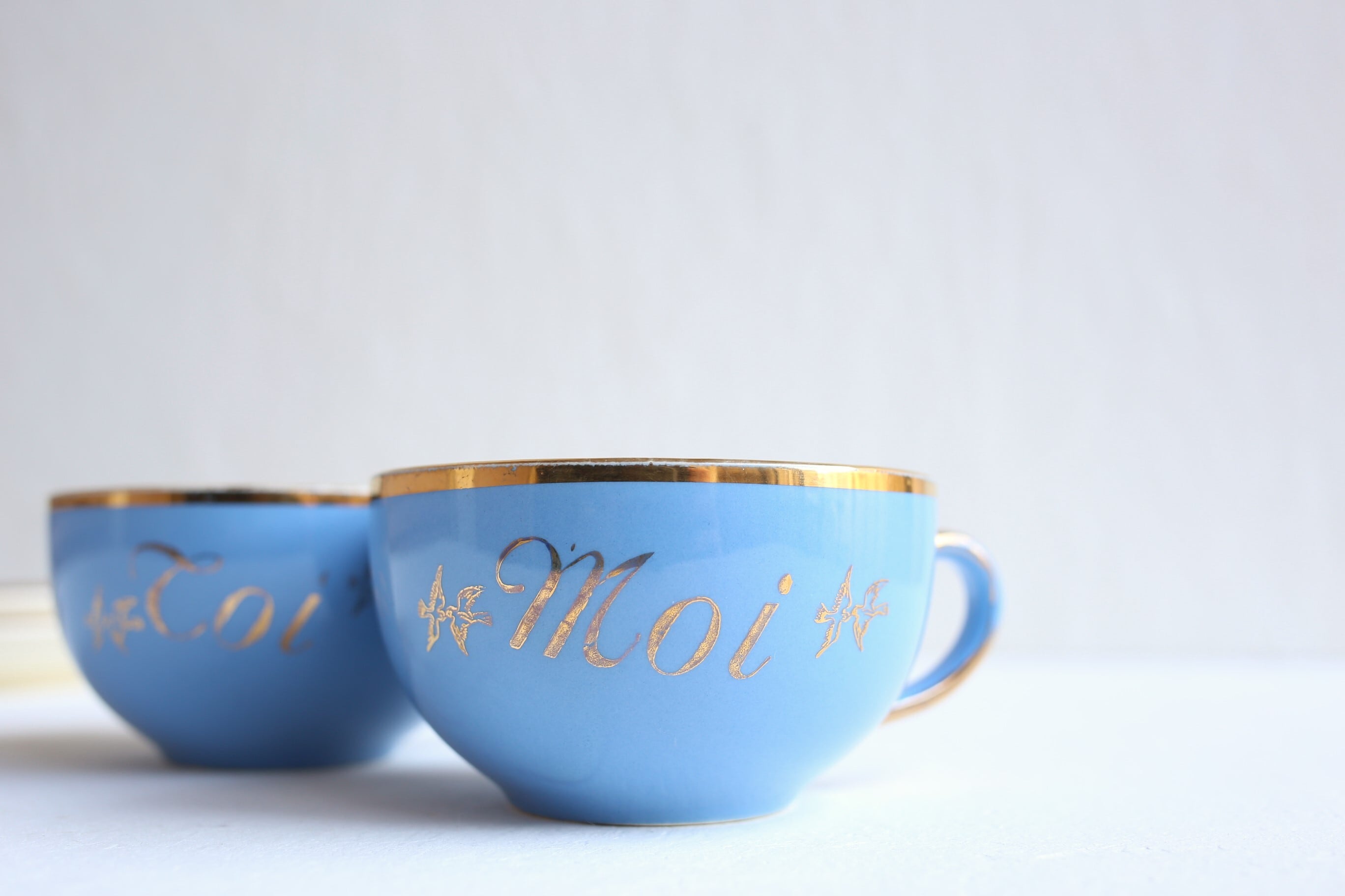 ややスモーキーな素敵なブルーに金彩が映え、カップには「Toi(あなた)」と「Moi(私)」という文字の周りに鳥のつがいが描かれています。