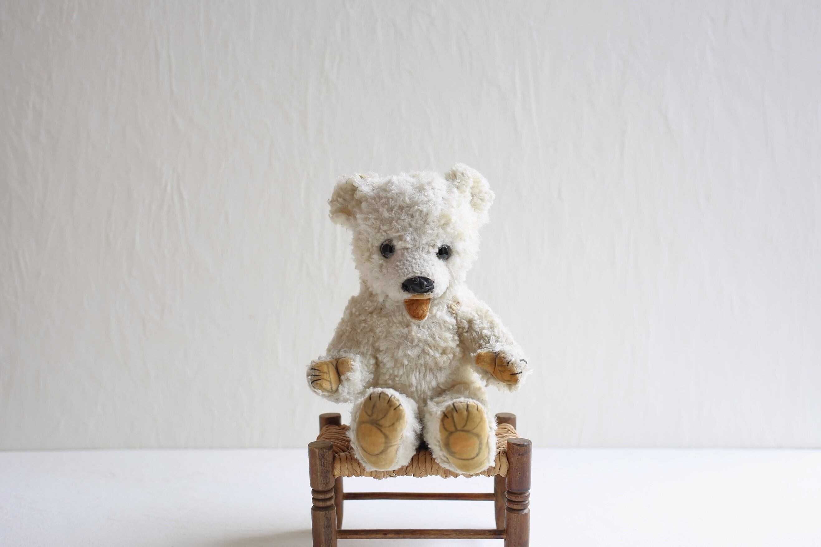 珍しい白色のテディベアですが、大きめな目が印象的で、どことなく微笑んでいるような可愛らしい子です。
