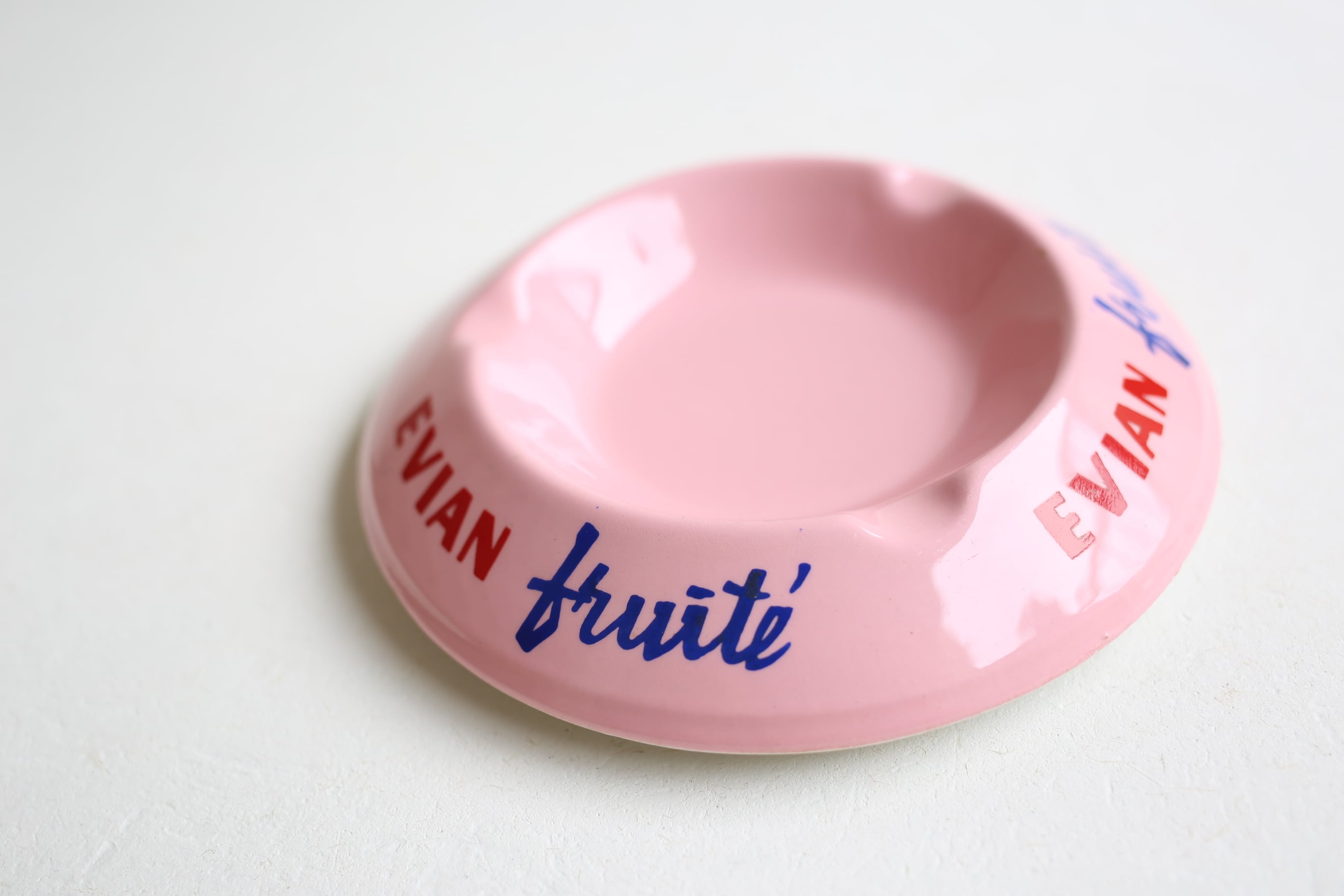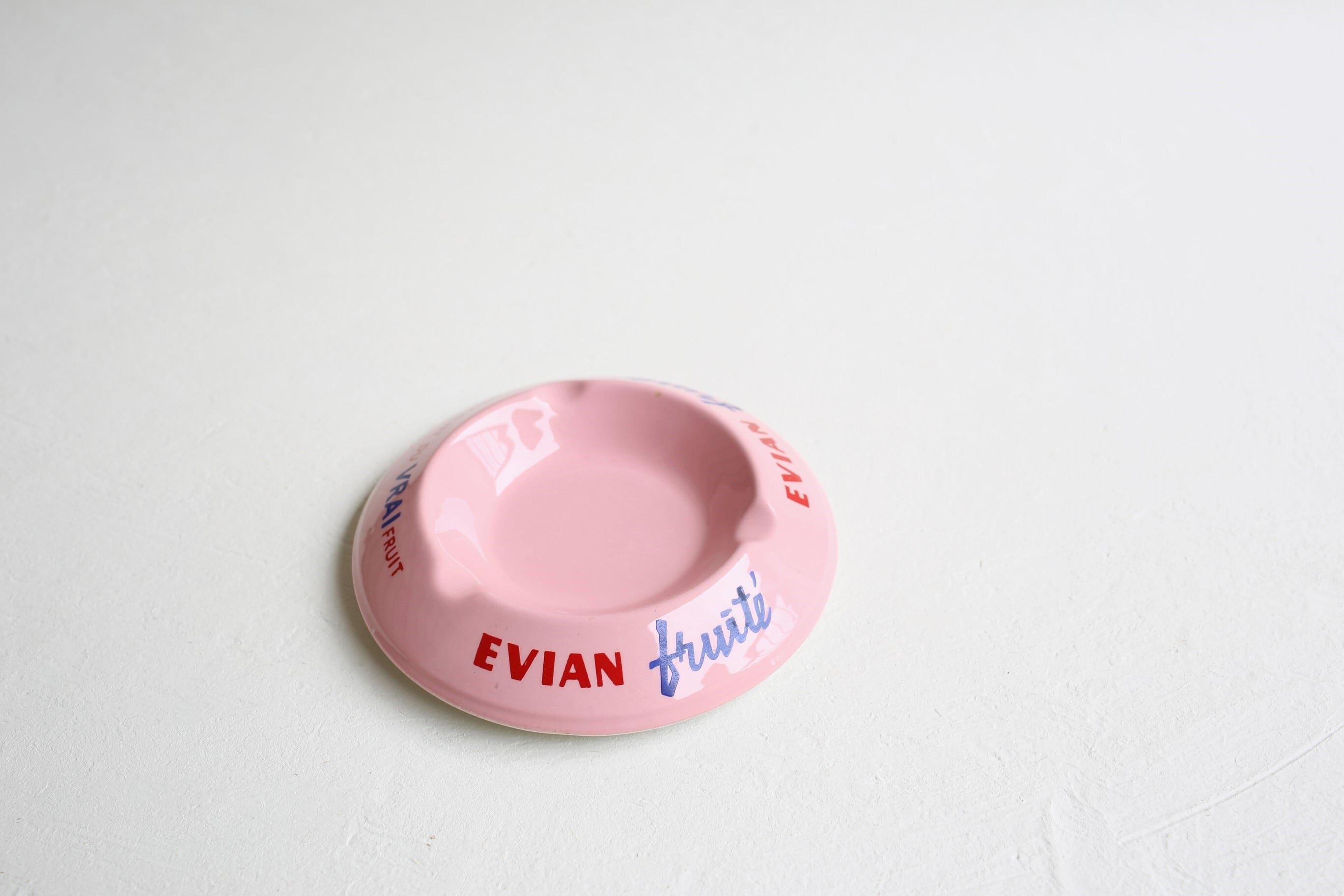 『EVIAN fruité』 のロゴとピンク、赤、青の配色が可愛らしいデザインの灰皿です。