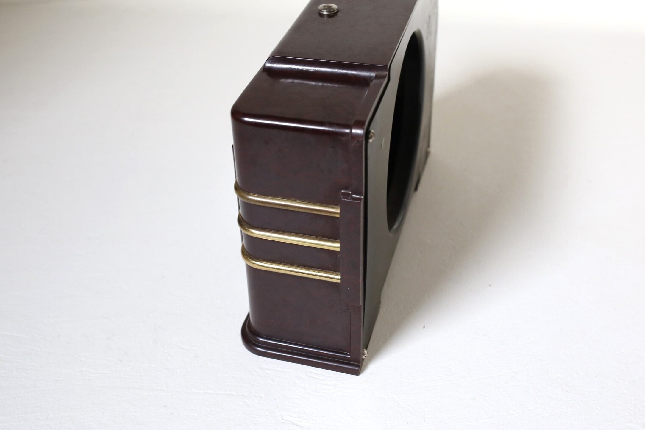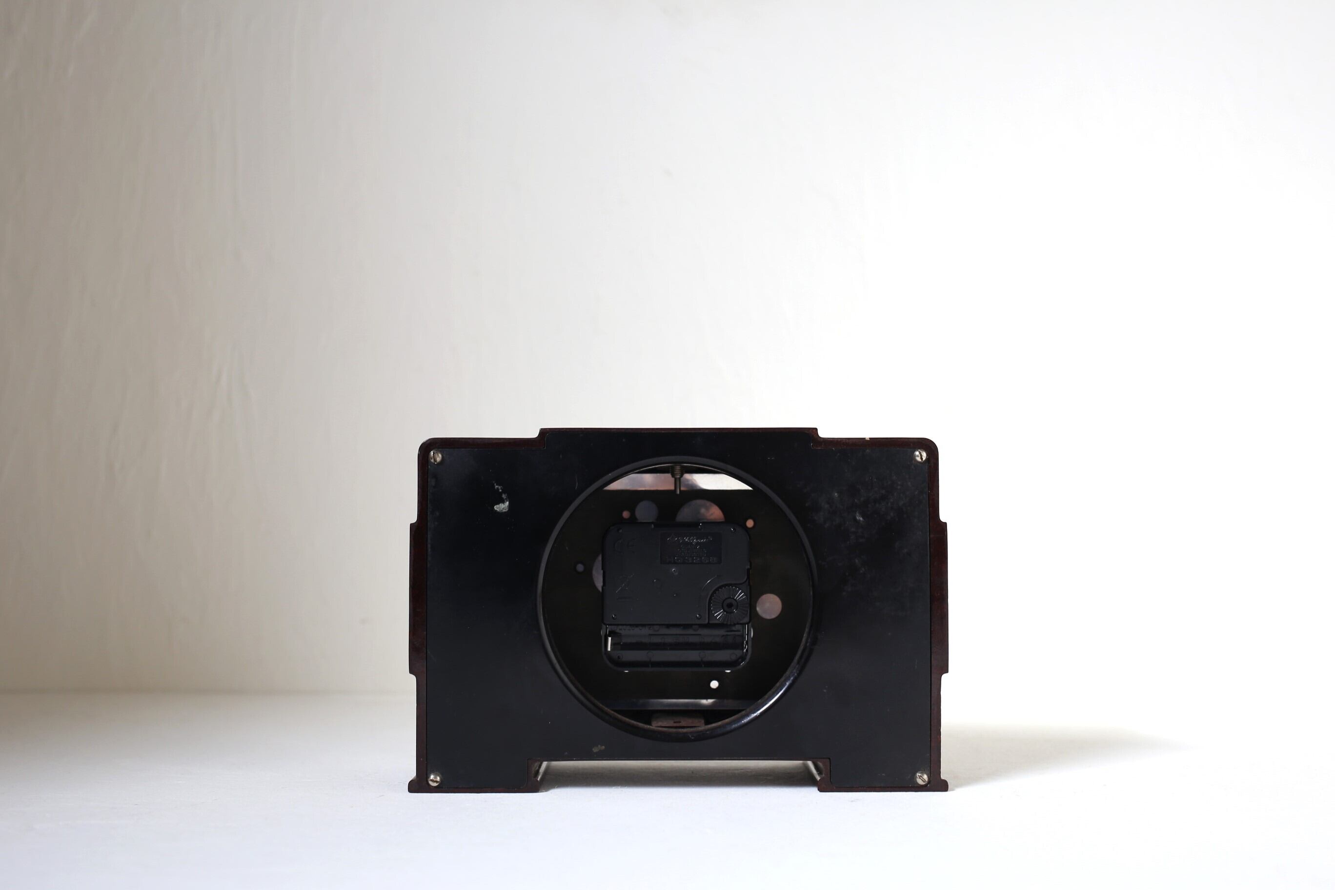 このサイズの置き時計はなかなか見かけることがありませんが、ブラウンのベークライトのアールデコ調のデザインは重厚感があり、素敵な佇まいです。