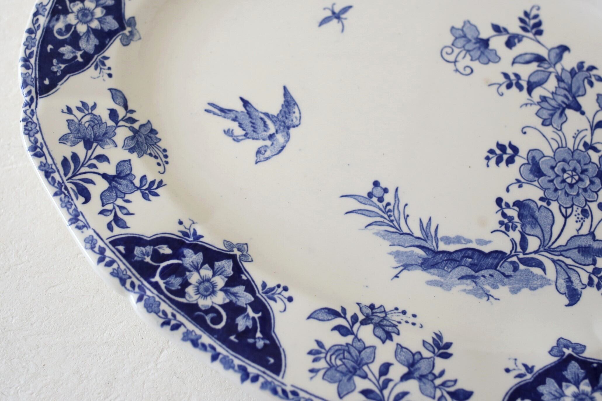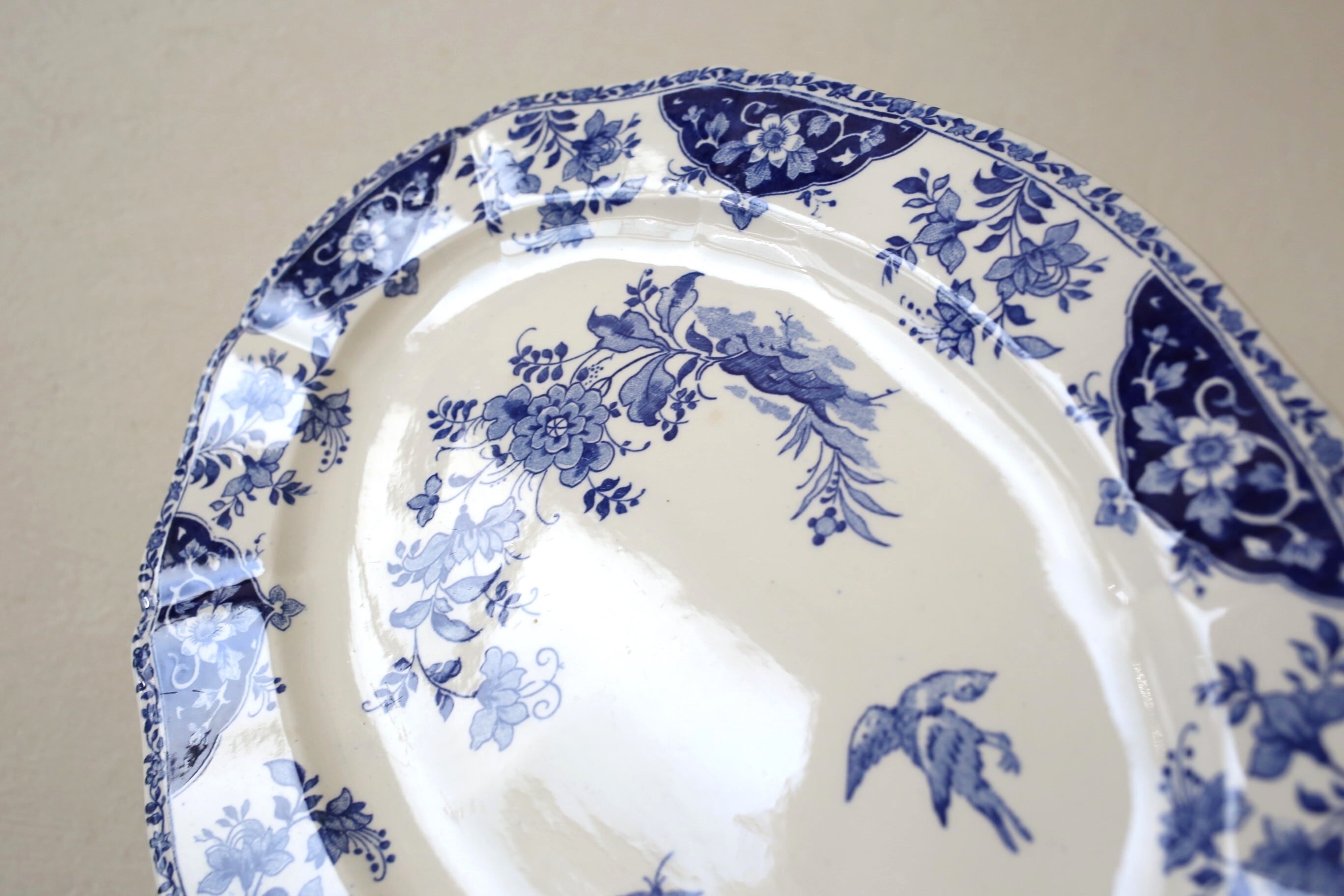 アイボリーの陶器に鮮やかなインディゴのようなブルーの絵柄が映えています。
