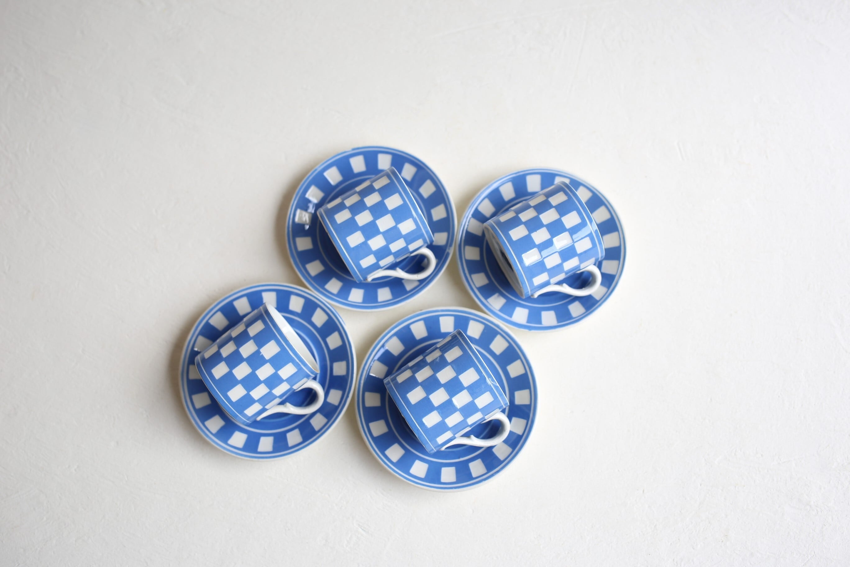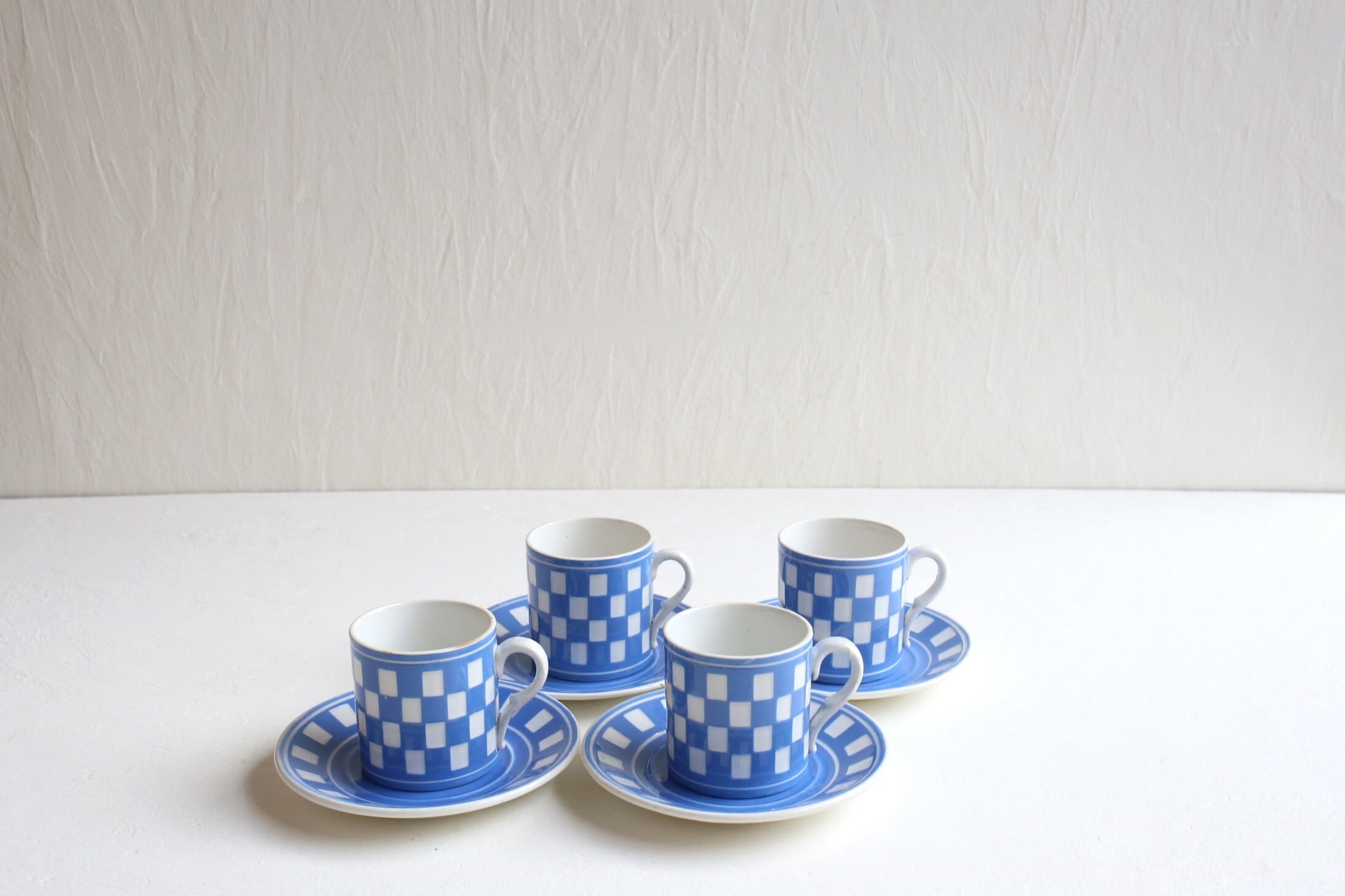 スカイブルーに少しホワイトを混ぜたような明るく優しい印象のブルーのダミエ柄が目を引く素敵なカップ&ソーサーです。