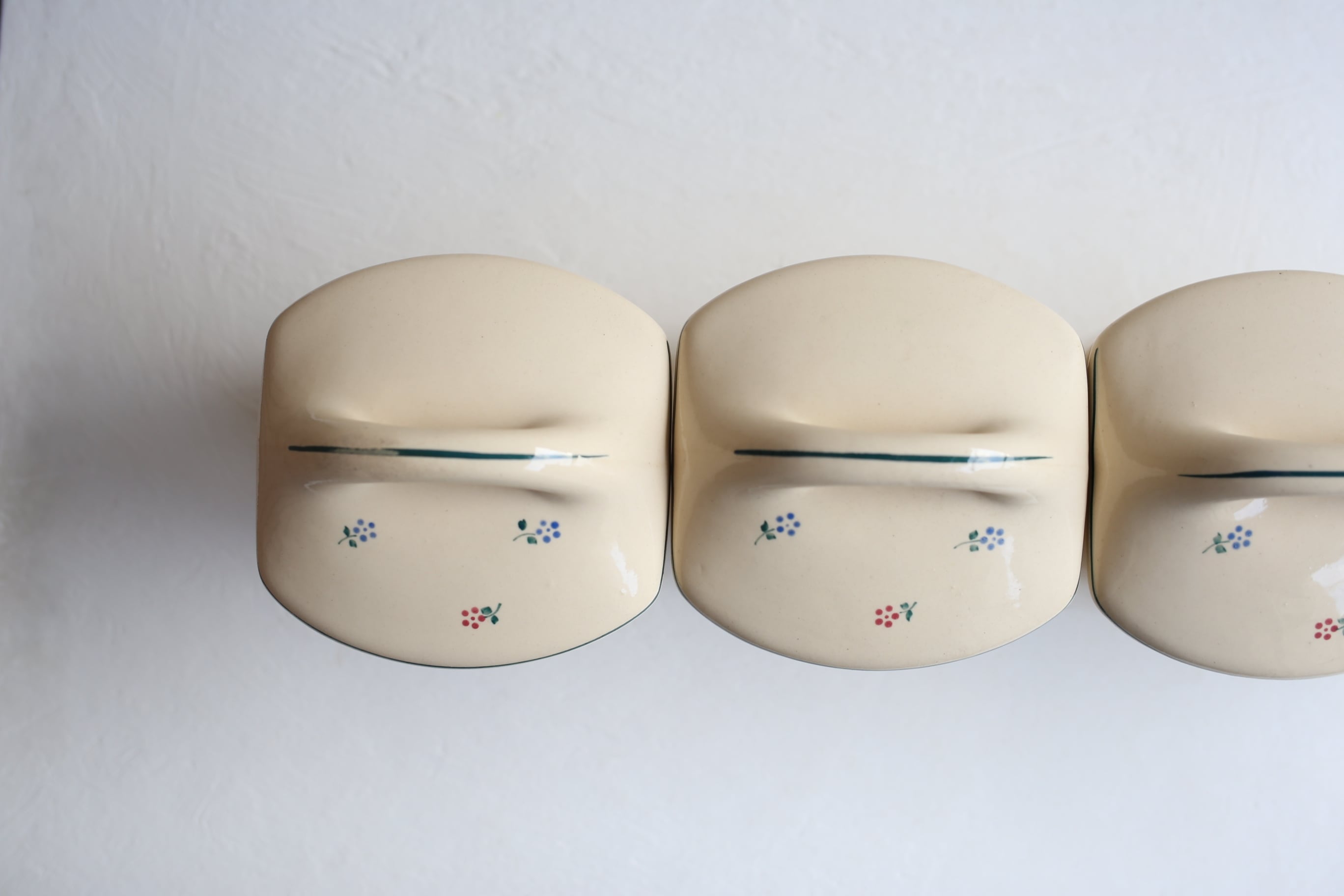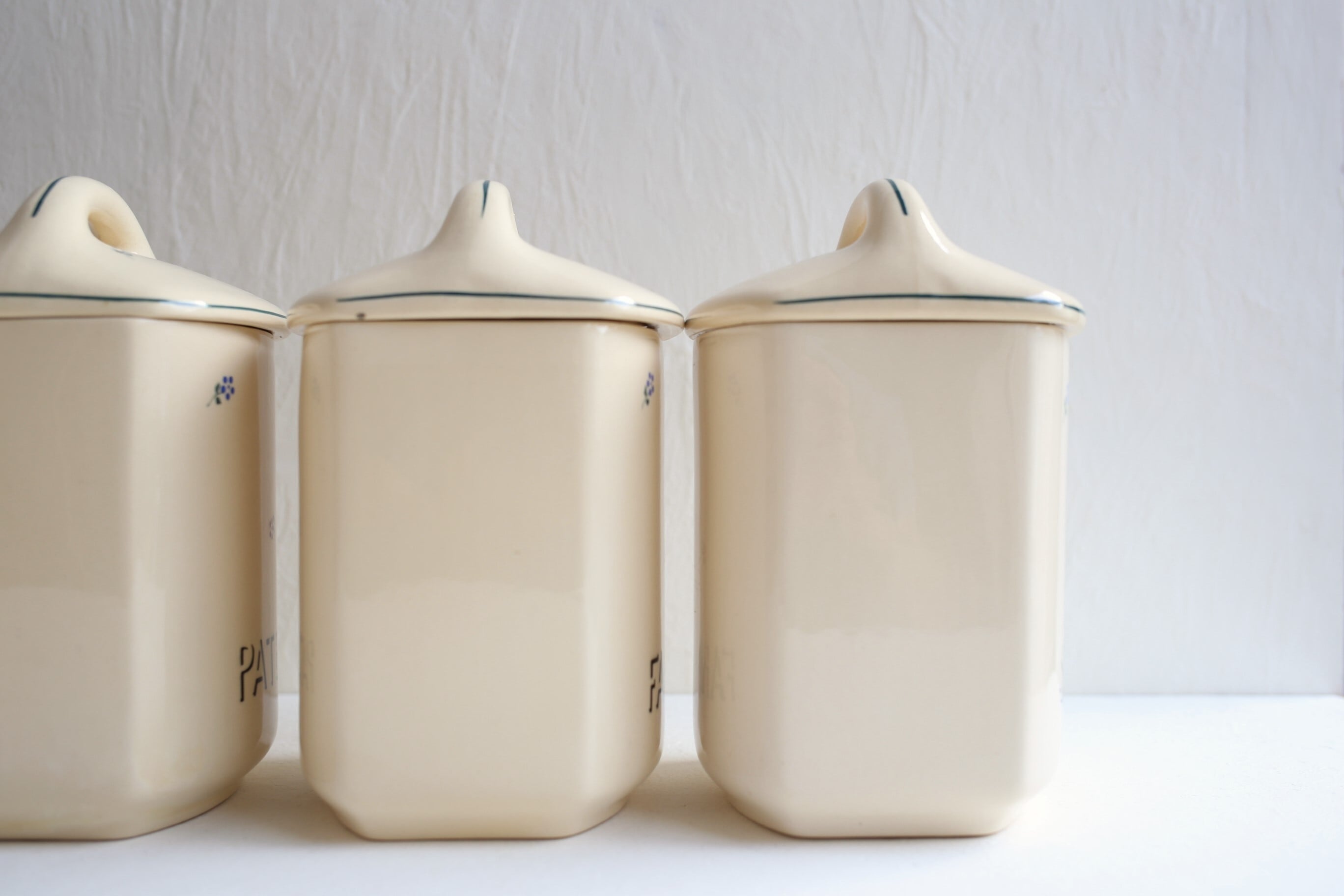 陶器製のキャニスターはサイズの異なるものが並ぶことが多いですが、こちらはすべて同じサイズが並ぶ珍しいシリーズです。