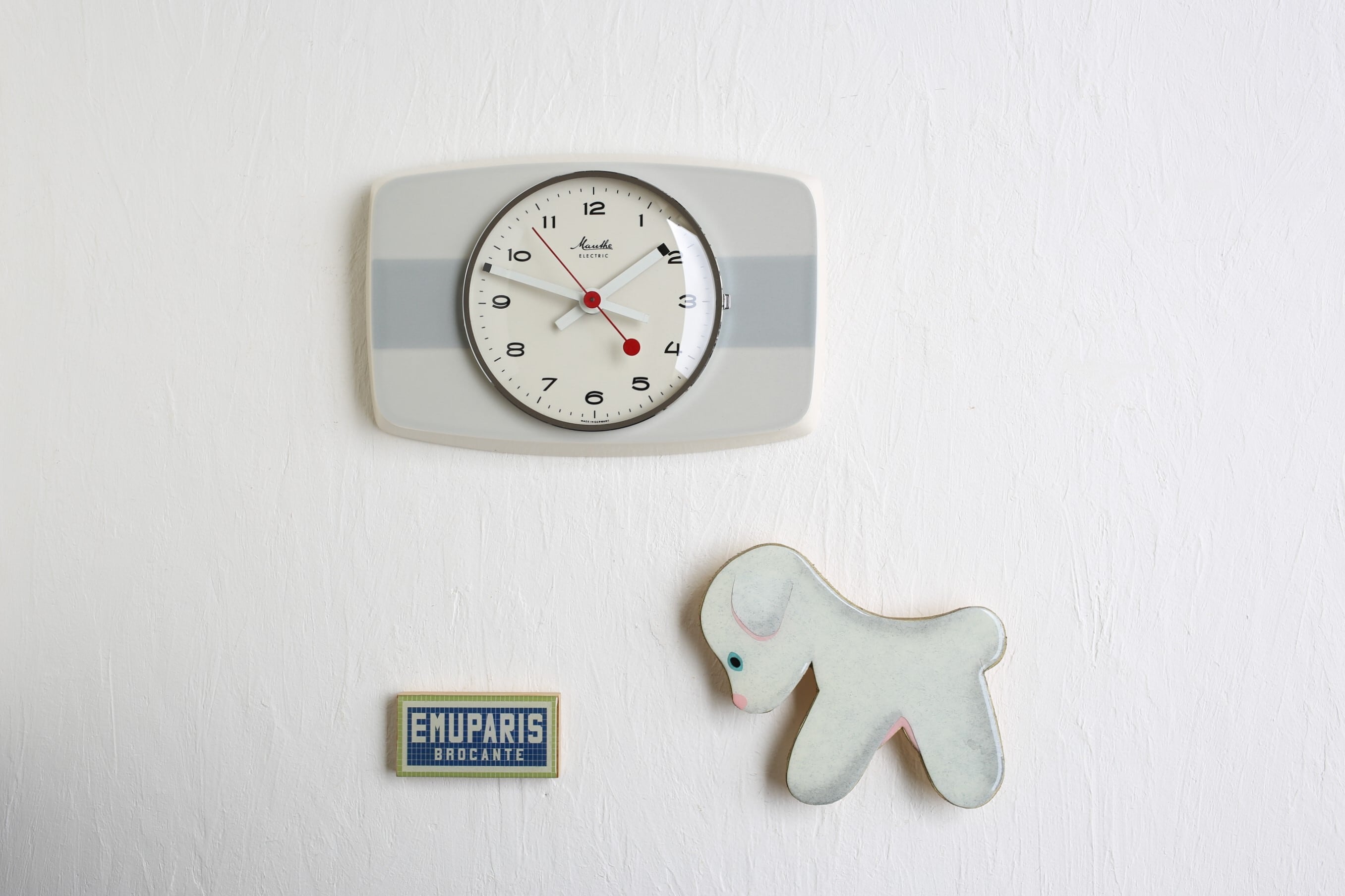 珍しい横長のデザインですが、アイボリーの陶器にグレーのツートンのボーダー柄が優しい印象で、そこに赤い秒針が良いアクセントになった素敵な時計です。