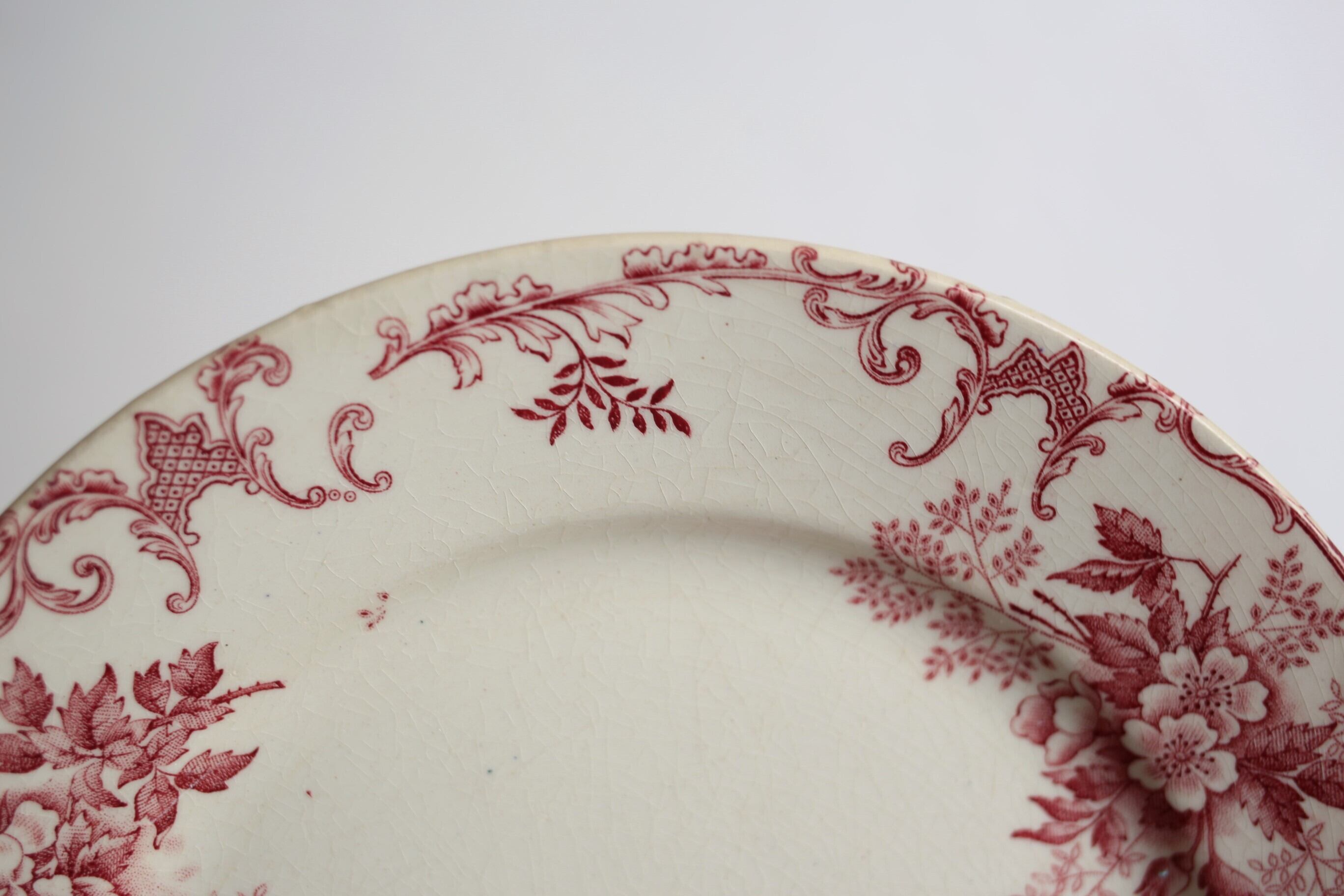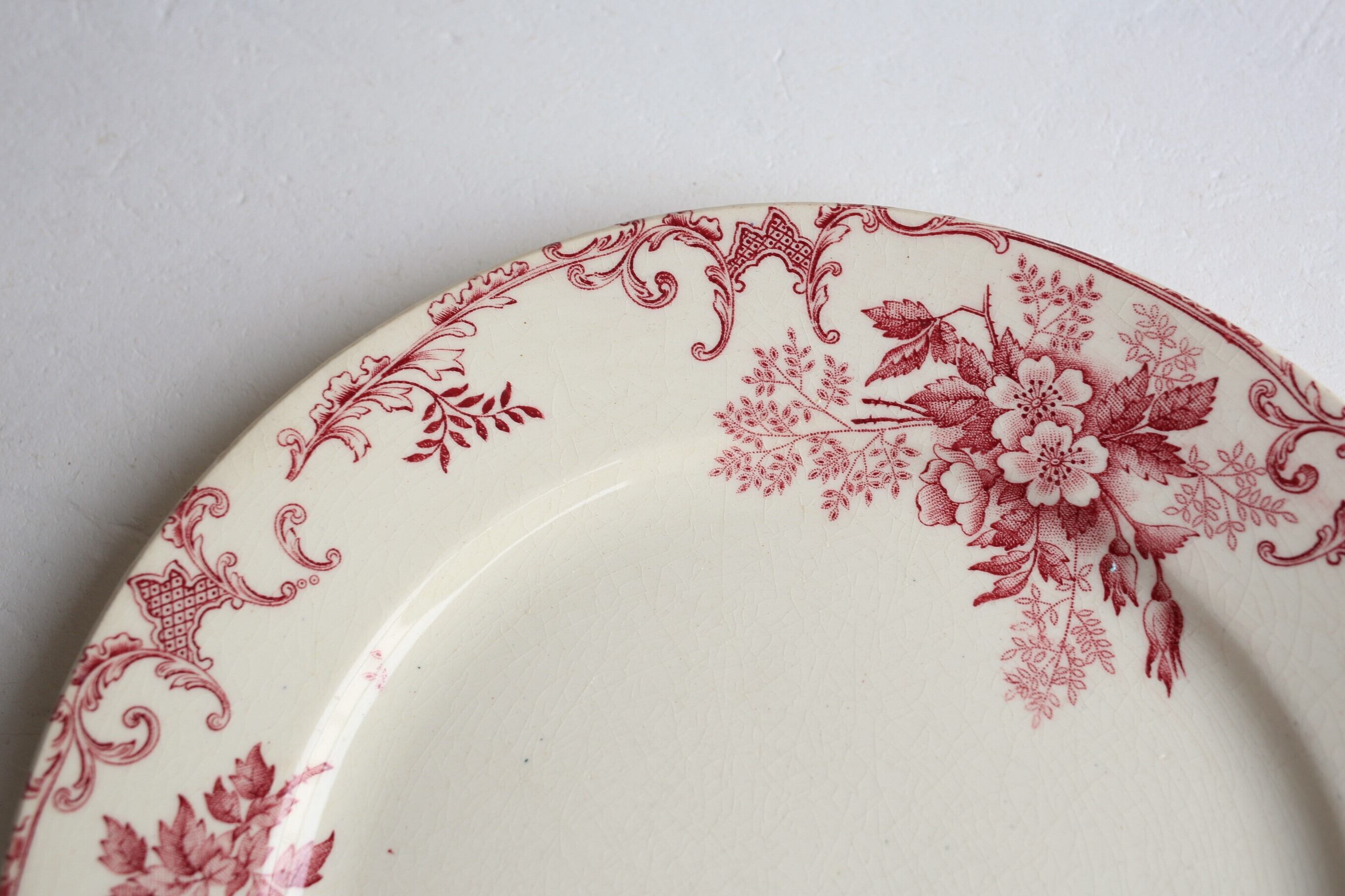 アイボリーの陶器にローズカラー(ボルドーカラー)の繊細な花模様で縁取られた美しいプレートです。