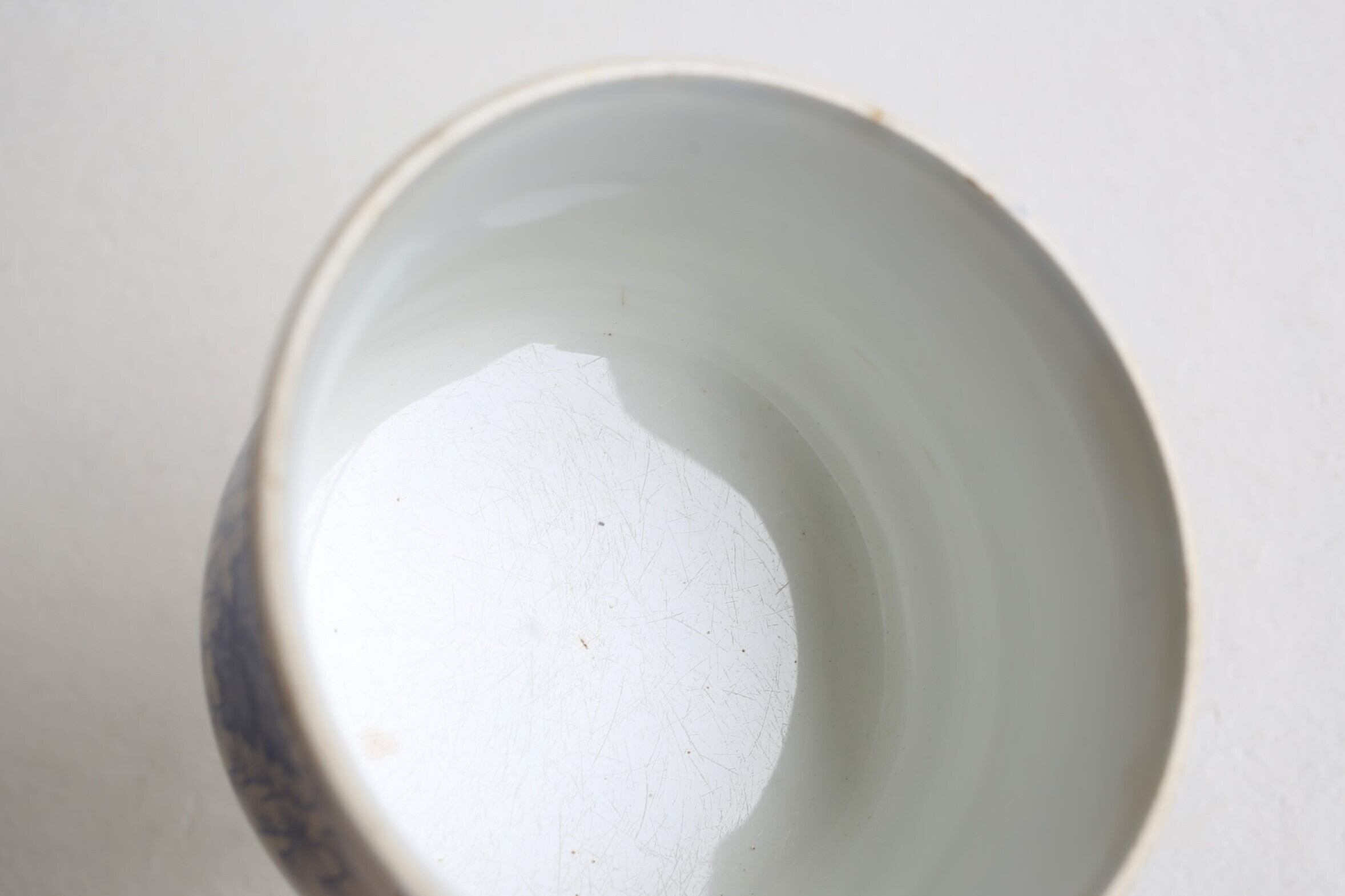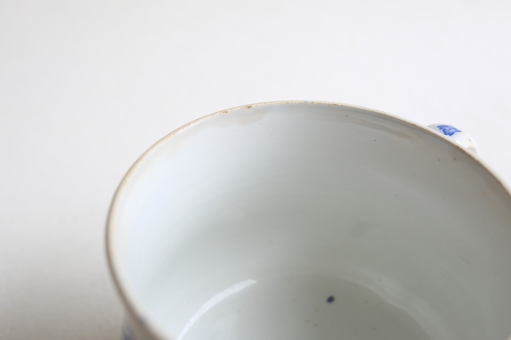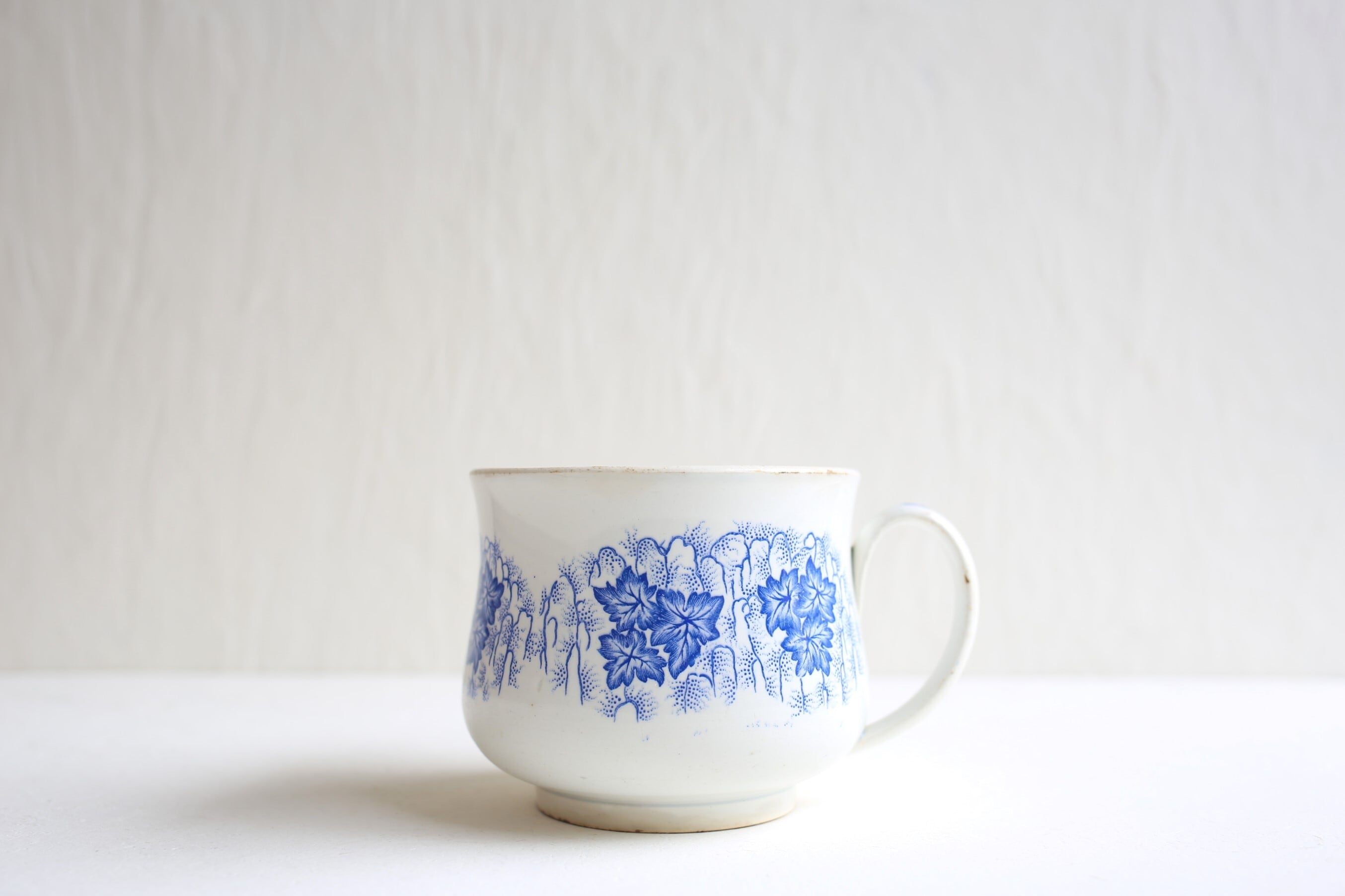 少しくびれのある丸いフォルムにインディゴのような鮮やかなブルーの絵が映えた美しく趣のあるカップです。