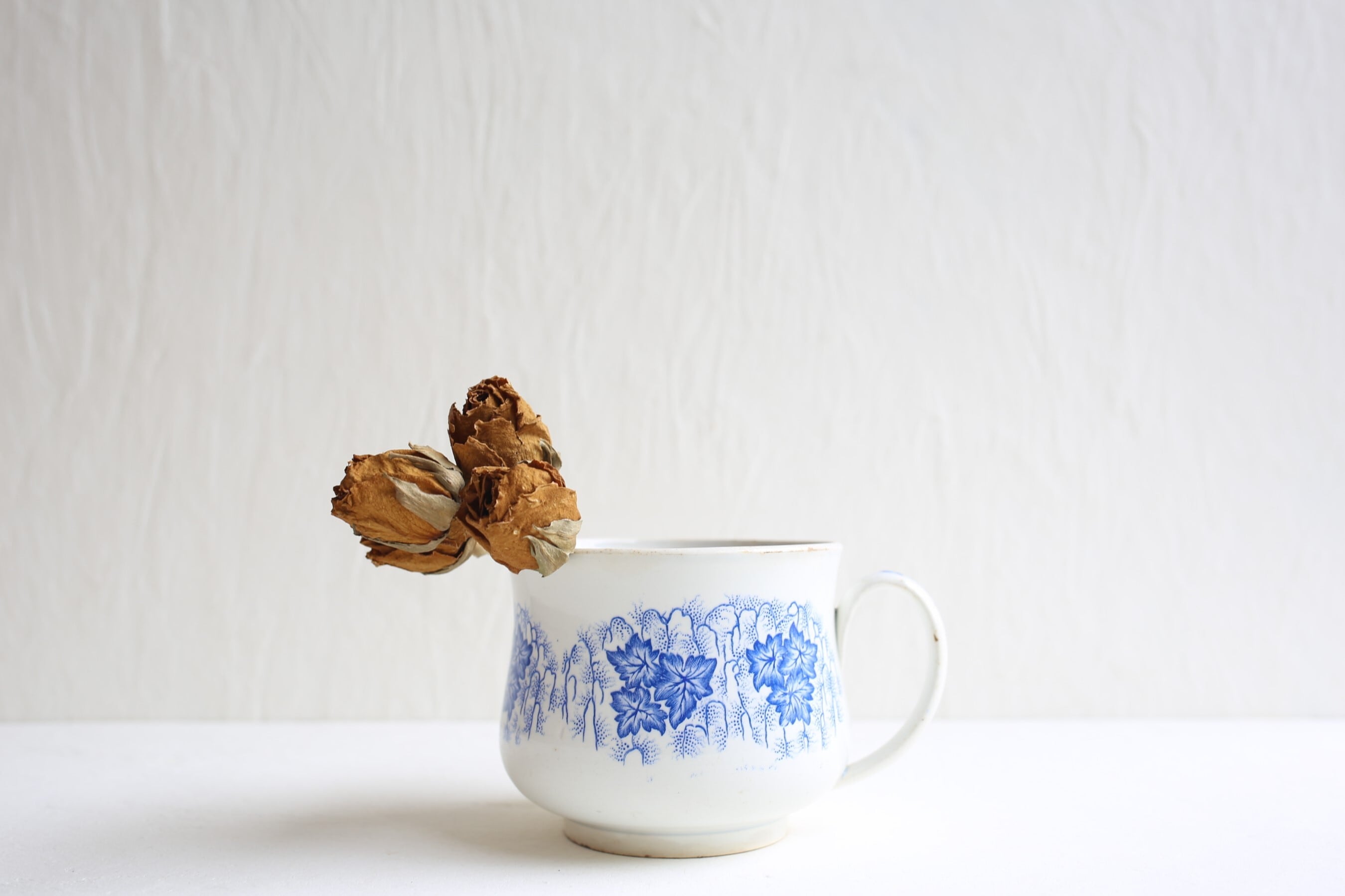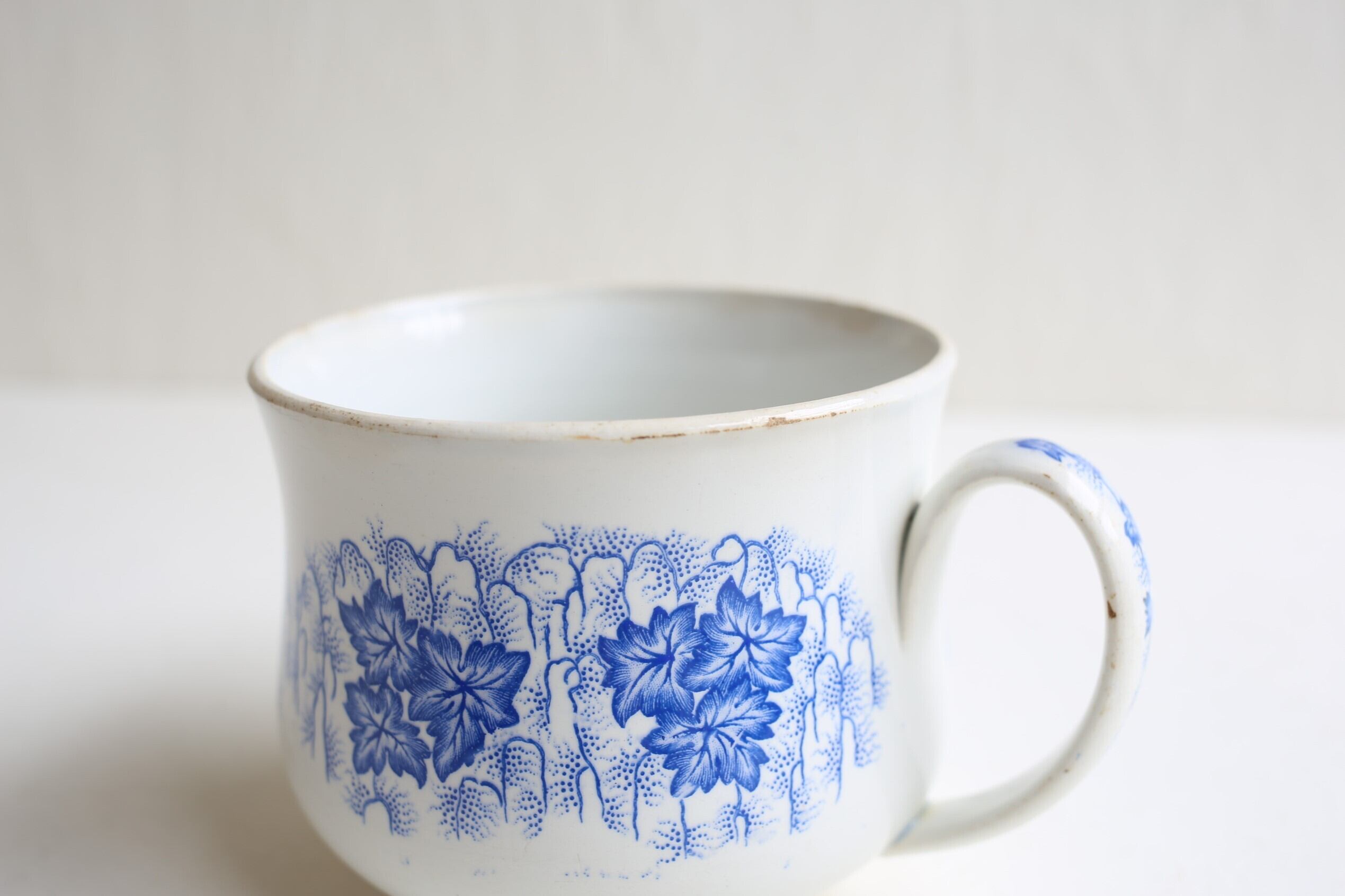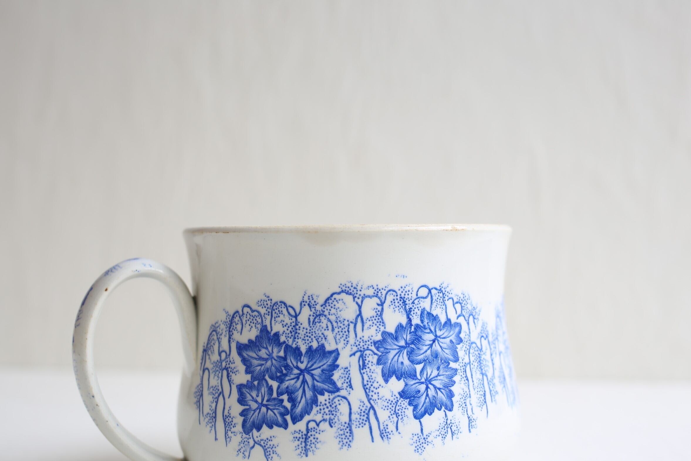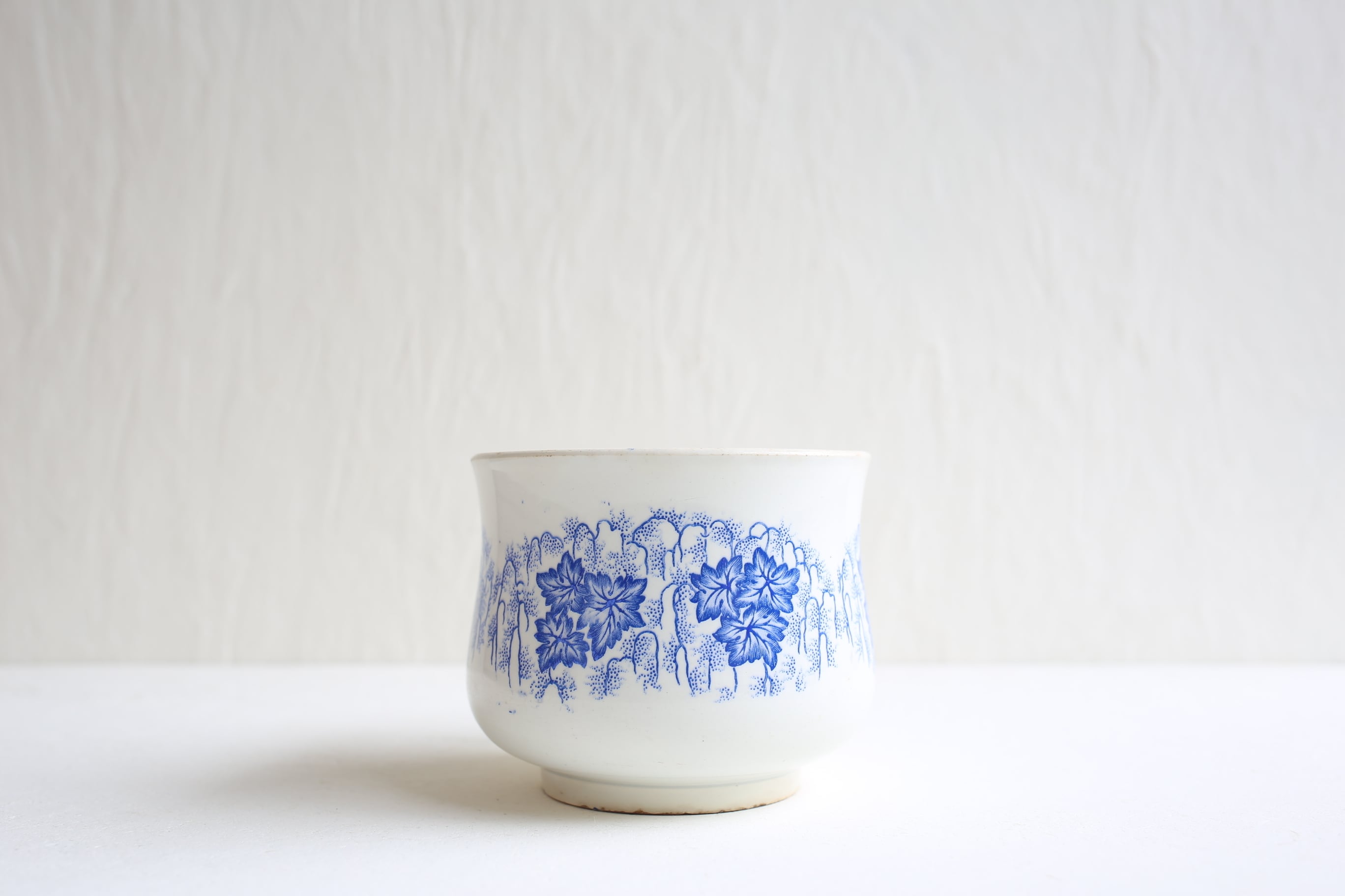 少しくびれのある丸いフォルムにインディゴのような鮮やかなブルーの絵が映えた美しく趣のあるカップです。