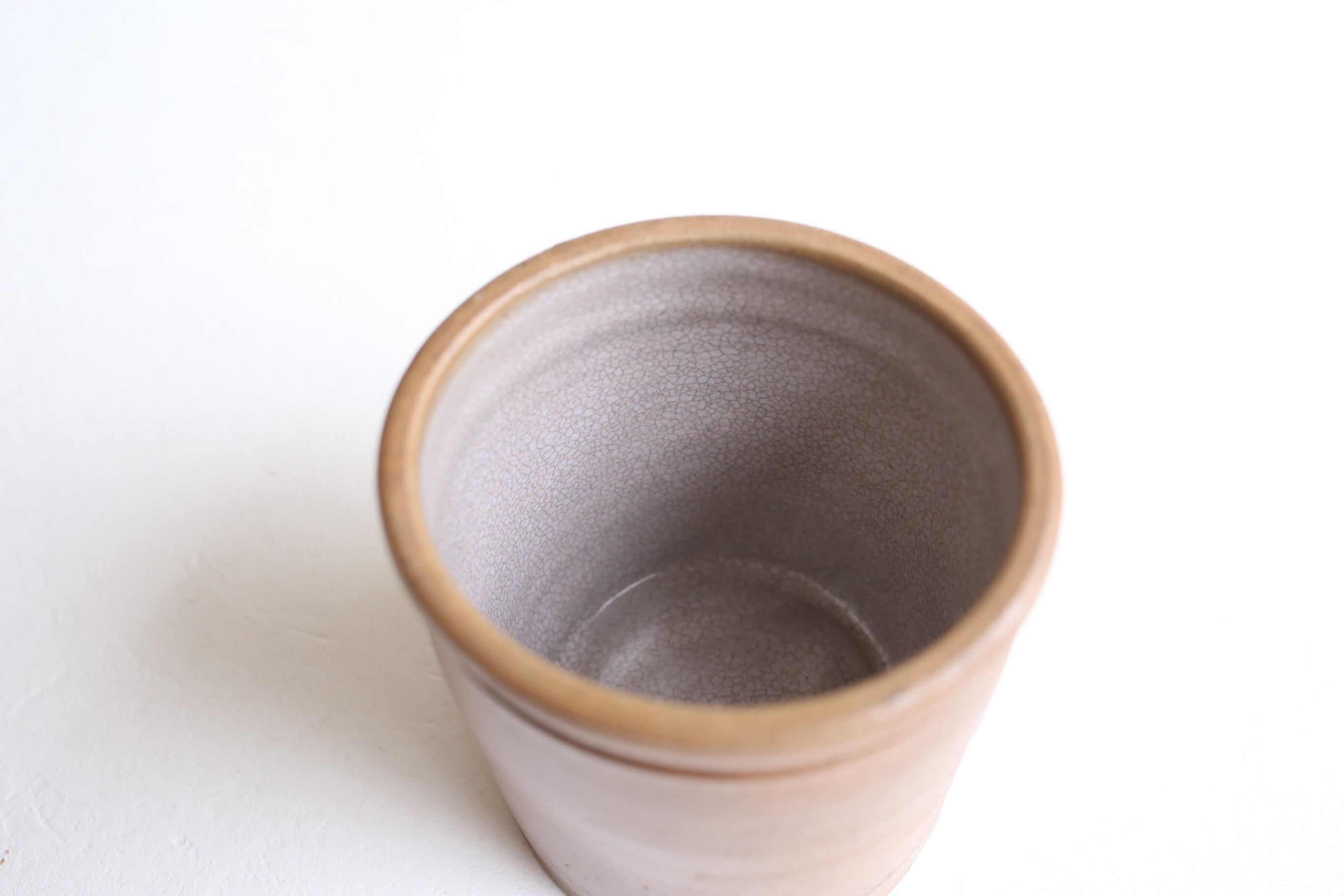 外側は素焼きの触感に近く、光沢のある釉薬が薄くかけられ、内側は白い厚めの釉薬がかけられ全体に細かい貫入が美しい模様のようにでています。