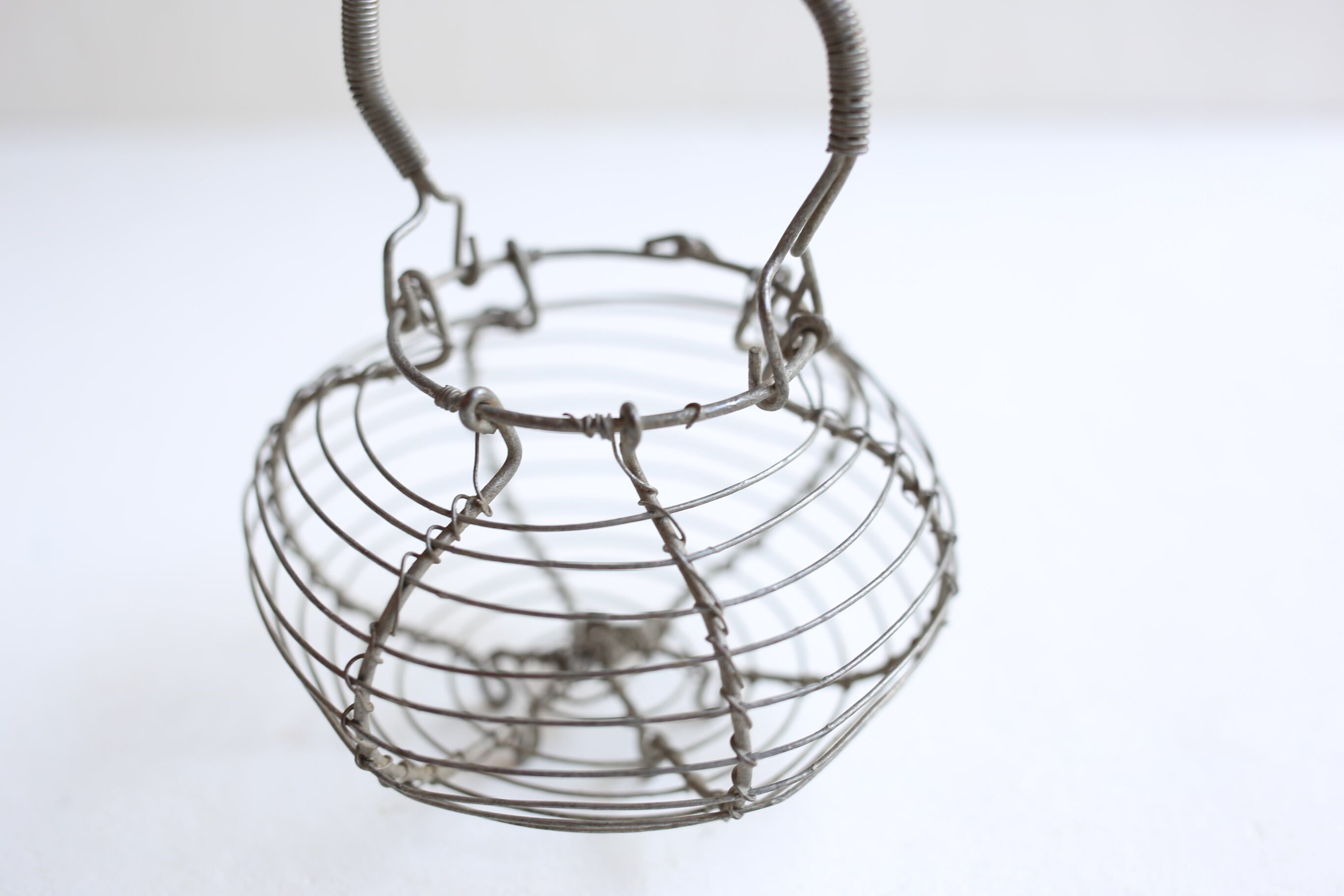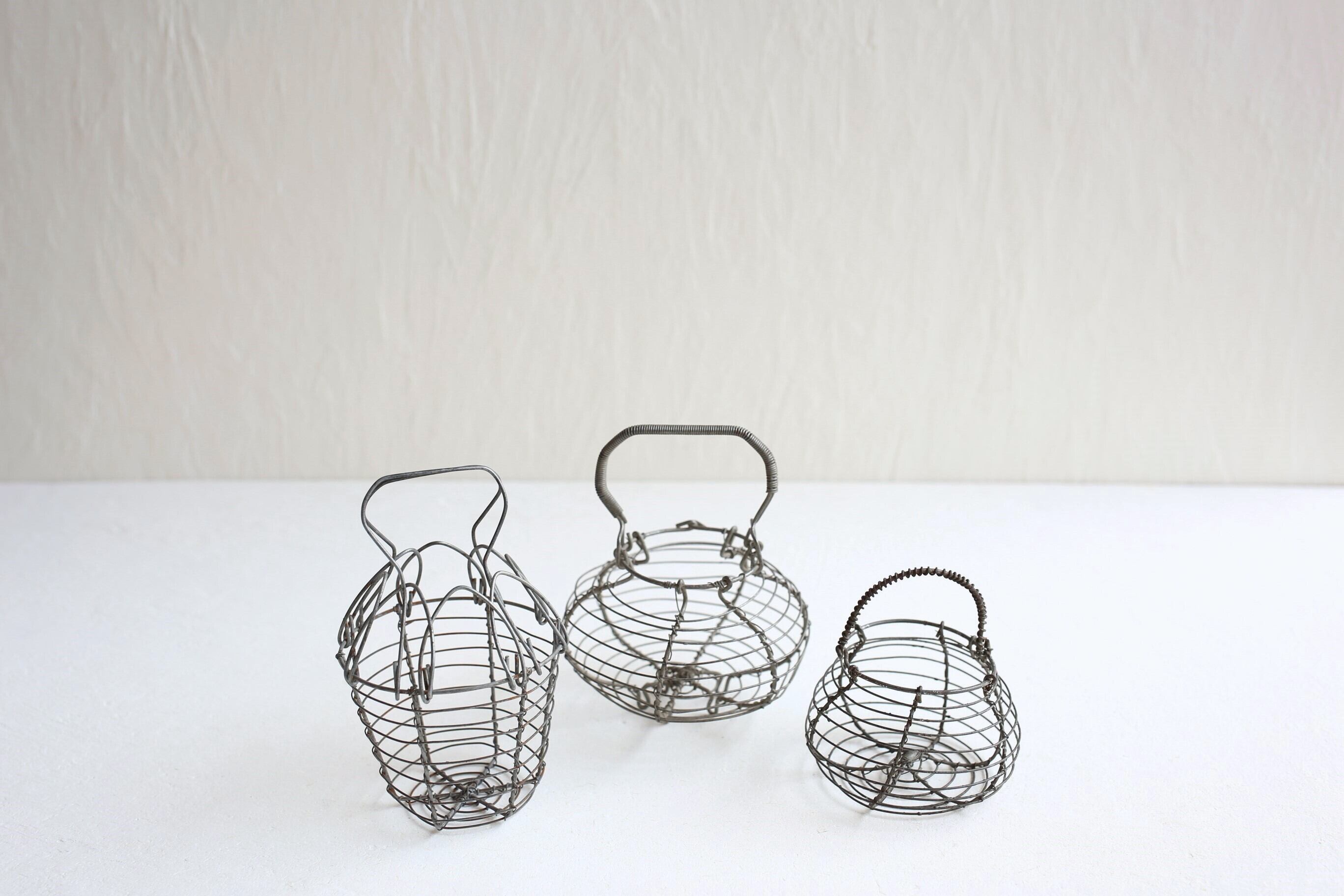 卵や野菜などを入れておくワイヤーパニエのミニチュアですが、ワイヤーのシャビーな風合いやフォルムが素敵です。