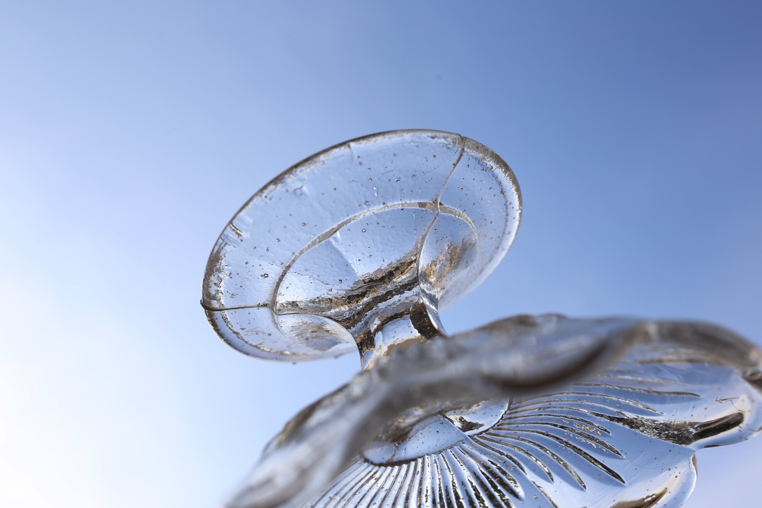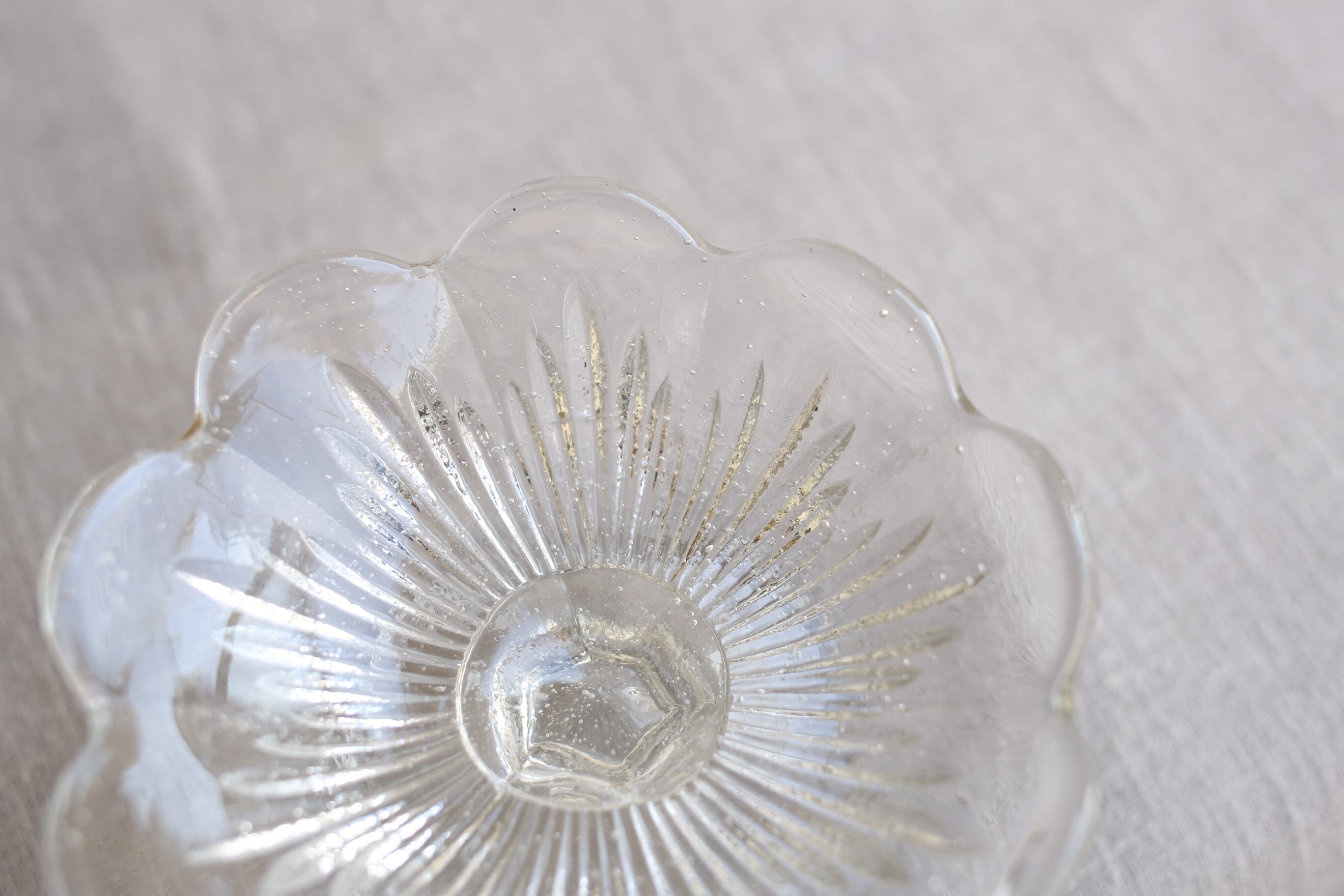 気泡や揺らめきがとても多く入った表情豊かなガラスで、花びらのような縁取りも可愛らしいです。