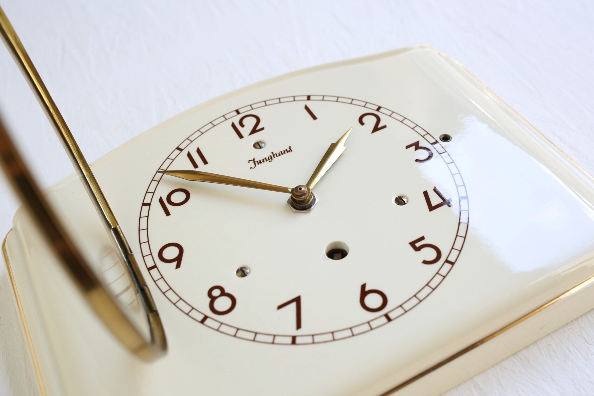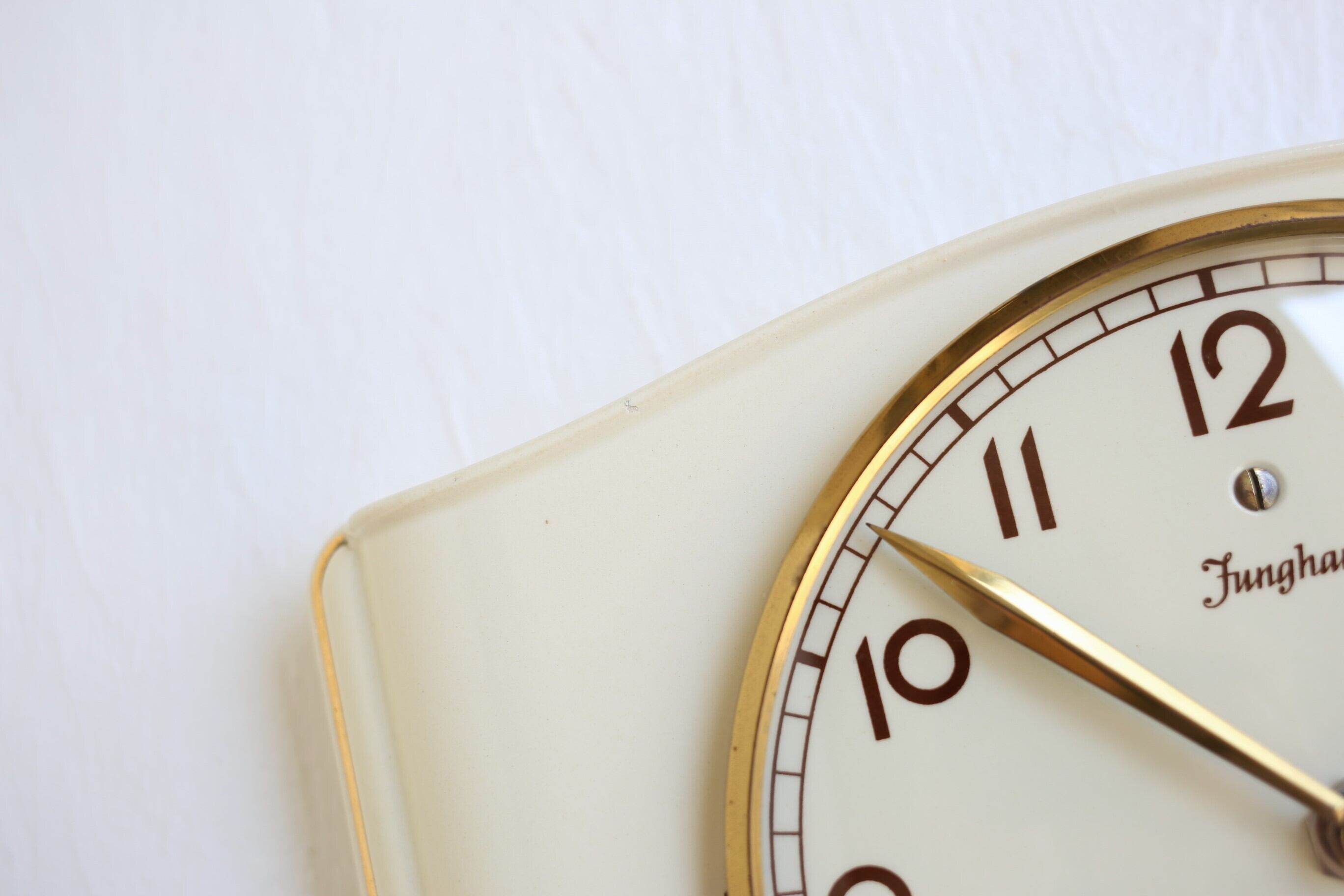 ドイツ アンティーク ヴィンテージ Junghans ユンハンス 陶器 掛時計 アイボリー×ゴールド(単3電池式クォーツ交換済)N-03976
